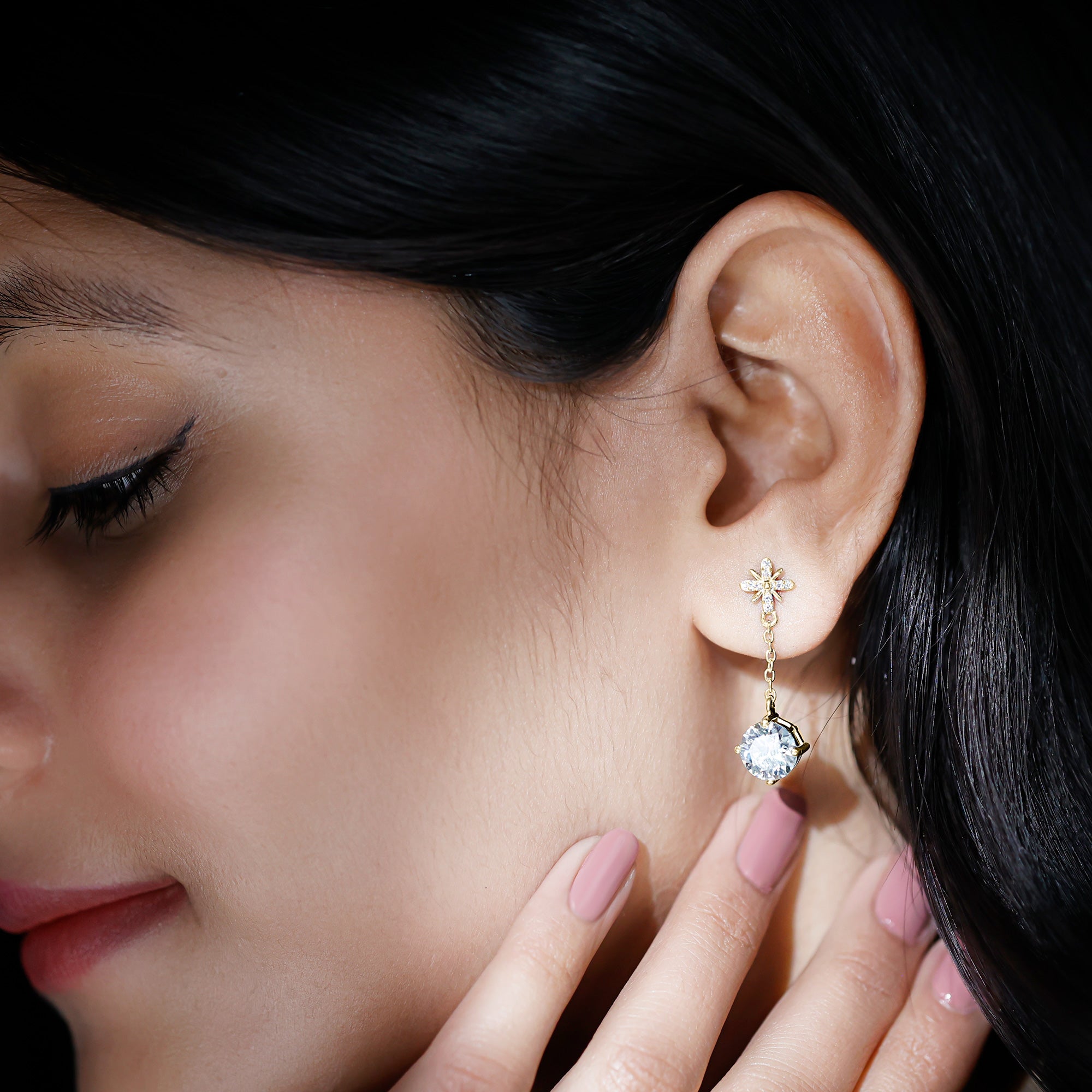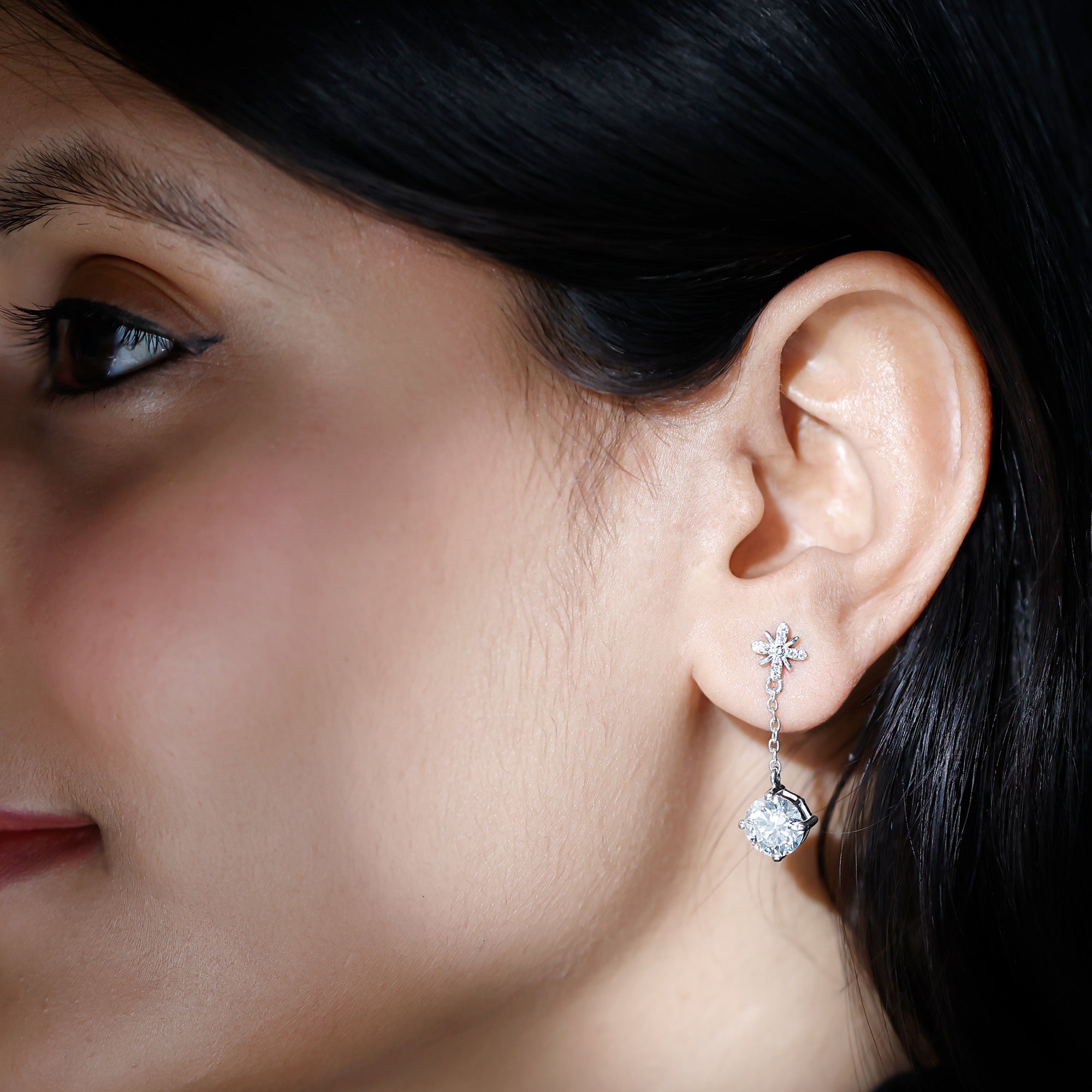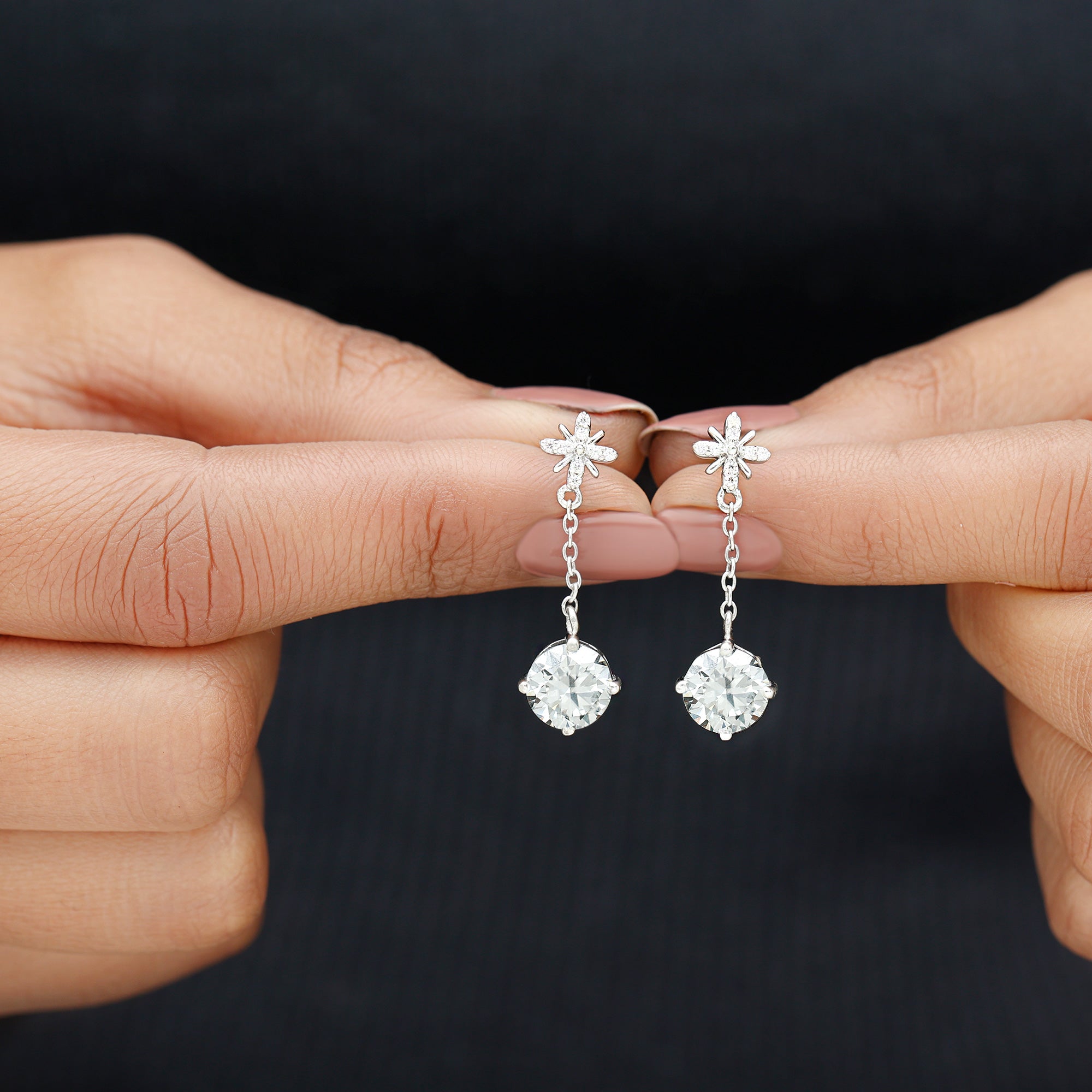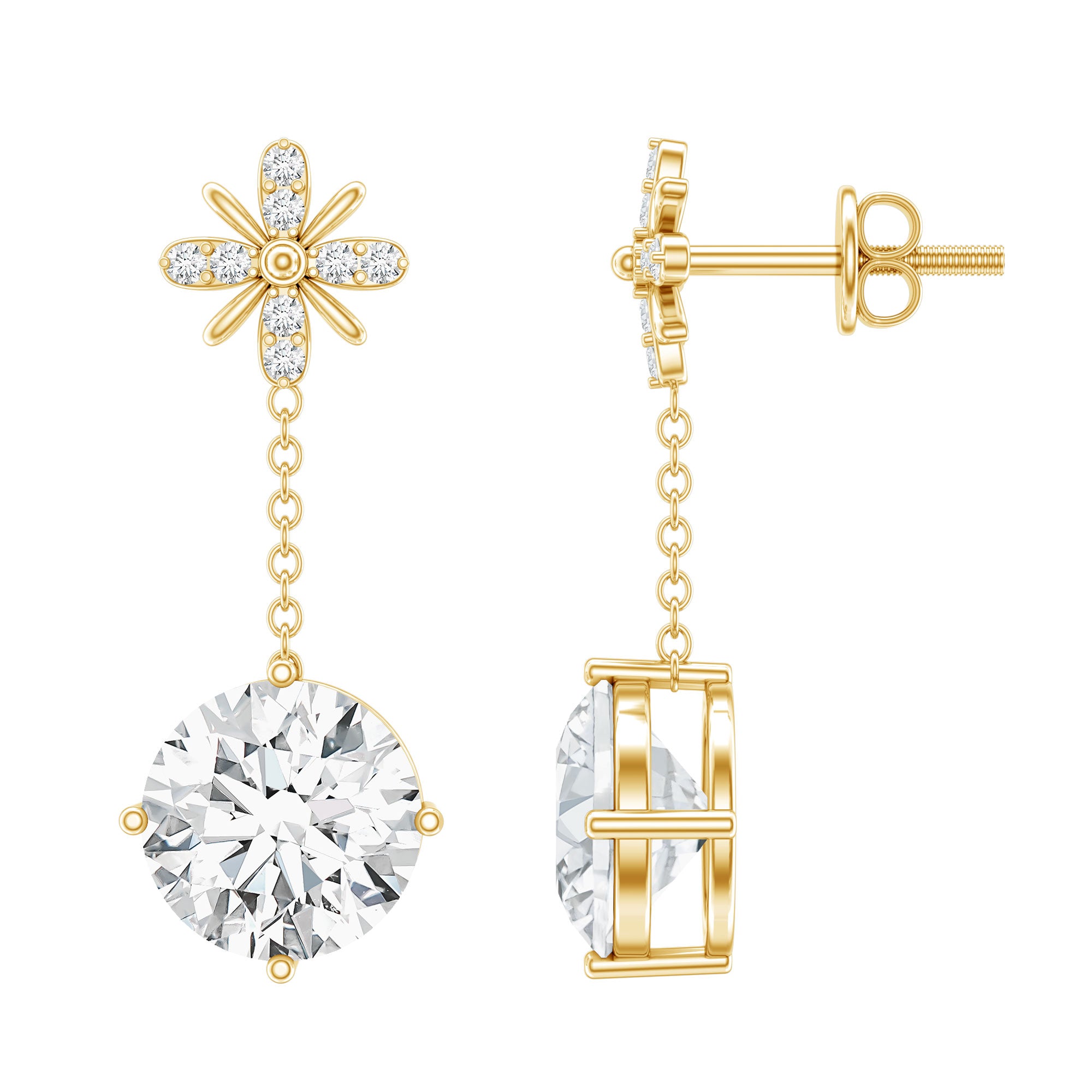 Make a fashion statement with these Chain Diamond Earrings, handcrafted in top-notch metal. The design showcases a diamond-encrusted flower motif at the top, elegantly connected to a round cut diamond (lab made) through a cable chain, creating a graceful dangle effect that adds charm and sparkle to every movement. The prong setting securely holds each 8 MM round diamond (EF-VS Quality), while the screw-back closure of these Dangle Earrings ensures a comfortable fit throughout the day. They can be present as an alternative April Birthstone Earrings and are available in a wide range of metal choices, allowing you to select the perfect material to match your style and make it truly unique.