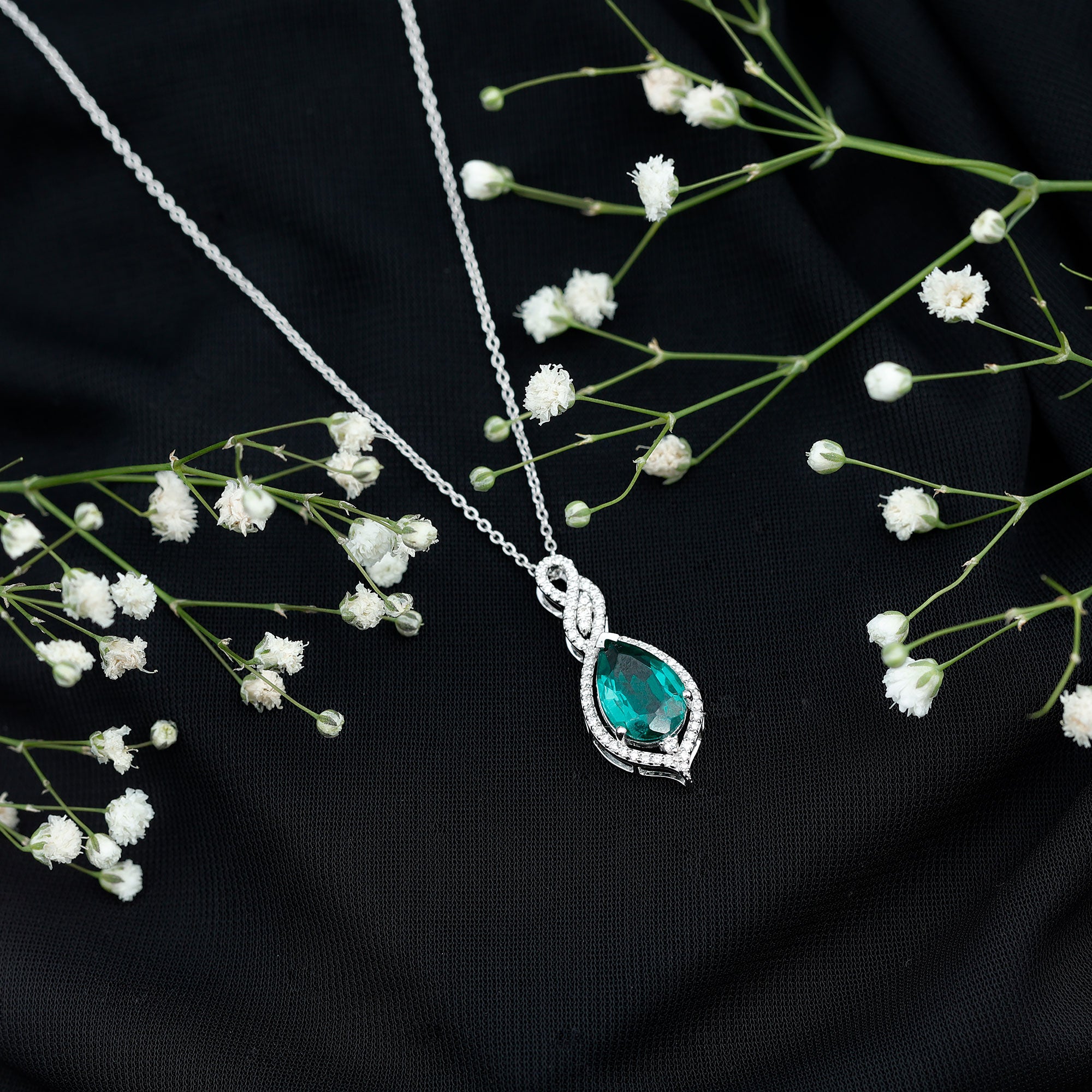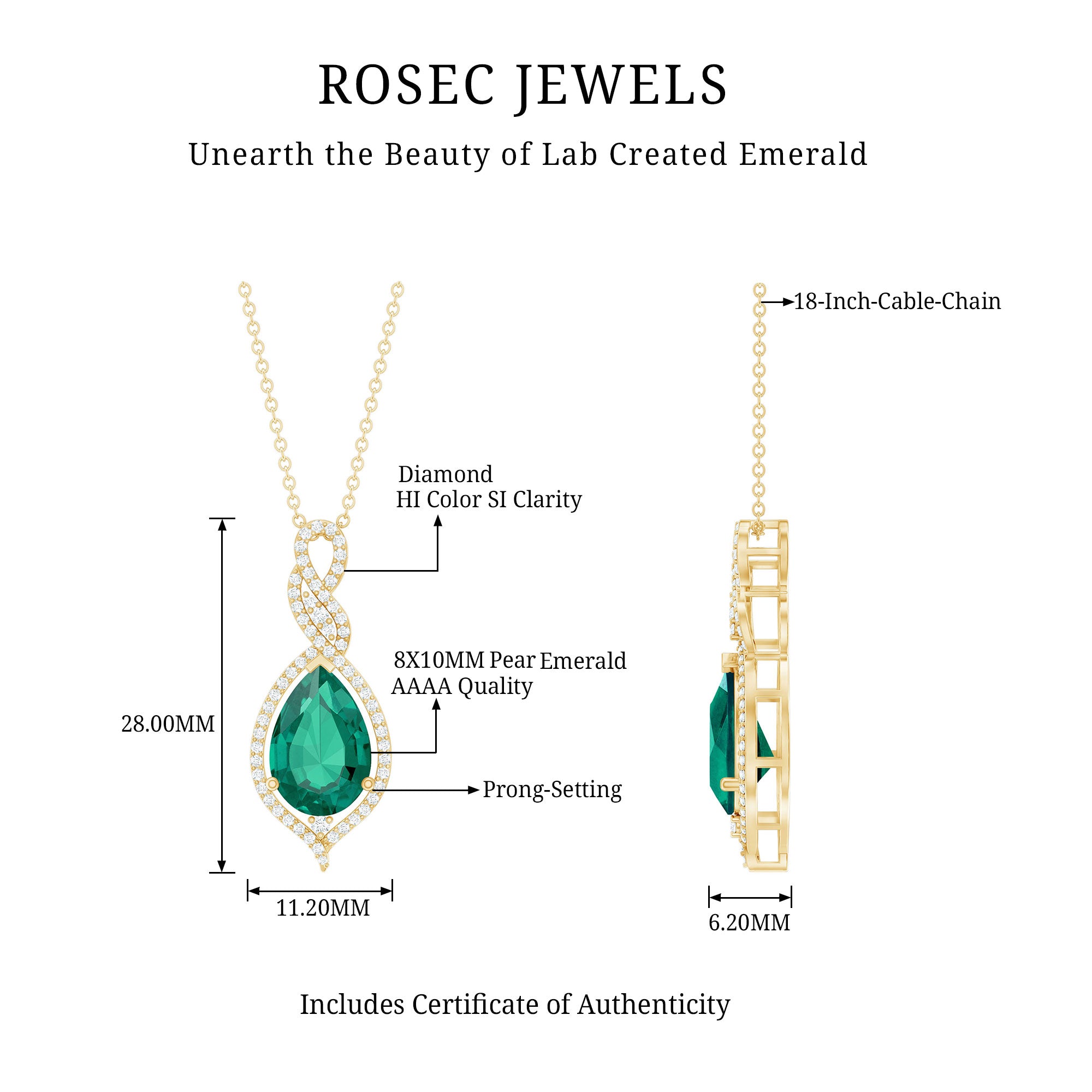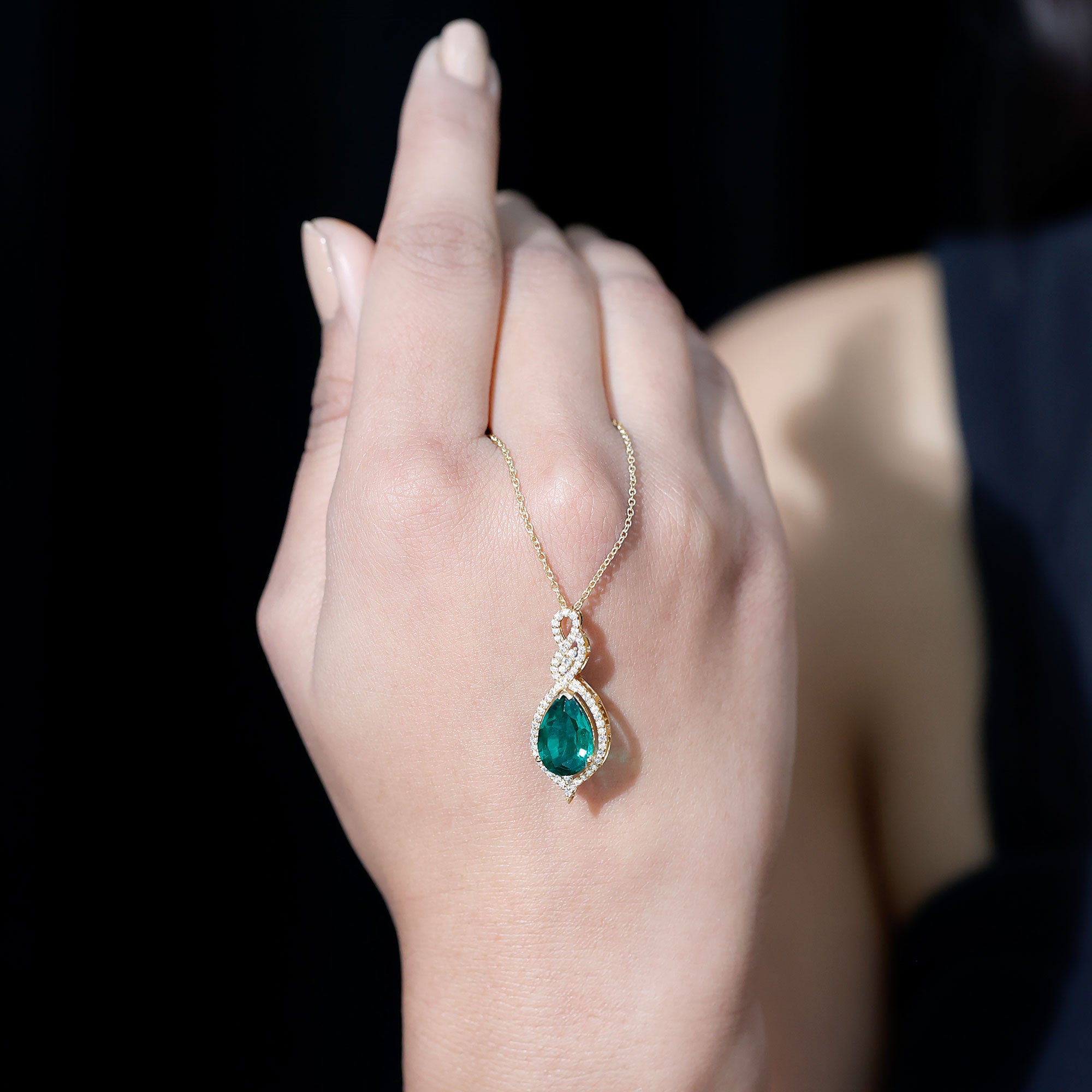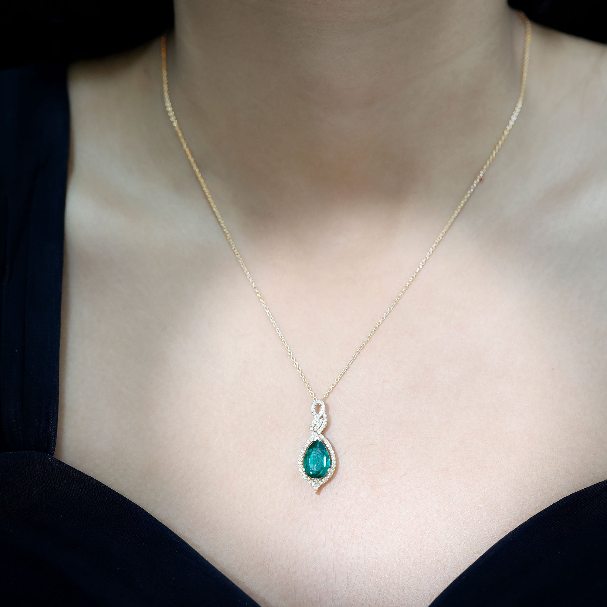 Unveil the beautiful allure of this Lab Grown Emerald Pendant. The pendant features an 8X10 MM Pear Shape Lab Created Emerald delicately placed in Prong Setting encircled with round shape diamonds. The infinity design adds to its enchantment, as round Diamond stones embrace the magnificent hue of the center stone, illuminating it with brilliance. This Infinity Pendant is guaranteed to make heads turn wherever you grace with its exquisite beauty. The pendant will be delivered to you in a signature jewelry box for the storage.