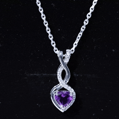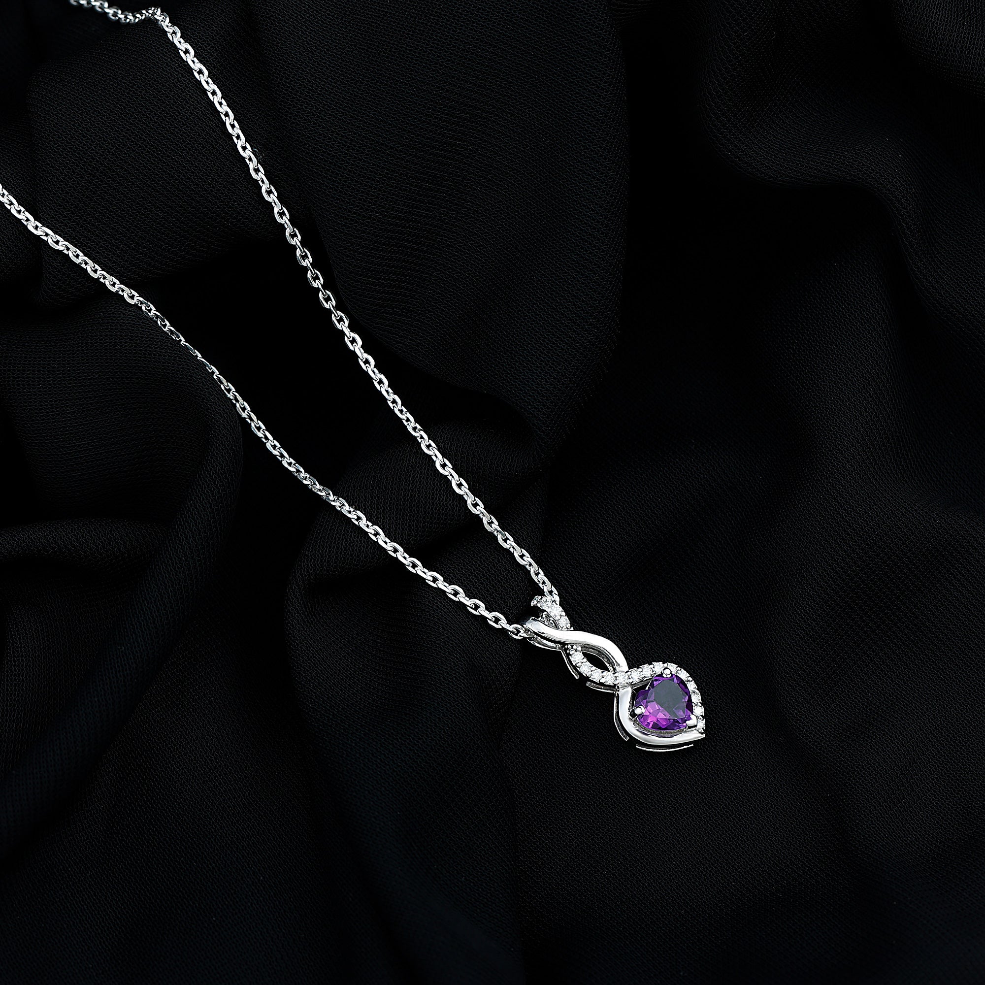 Present your heart to her in the form of this Amethyst Pendant Necklace, crafted with 14K White Gold Plated Silver. It features an 8 MM Heart Shape Amethyst secured in Prong Setting and placed at the center of a metallic infinity frame. The pendant frame is partially embedded with the smaller Moissanite and is accentuated with a hidden bail. The Heart Shape Pendant beholds the classic shine of AAA Quality Amethyst and dangles in sturdy cable chain, which makes it beautifully sit on the neckline. The Infinity Necklace will be delivered to you in a velvet pouch with the certificate of authenticity.