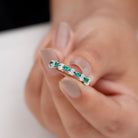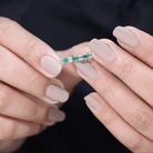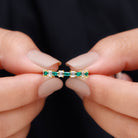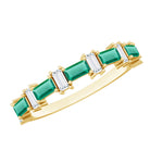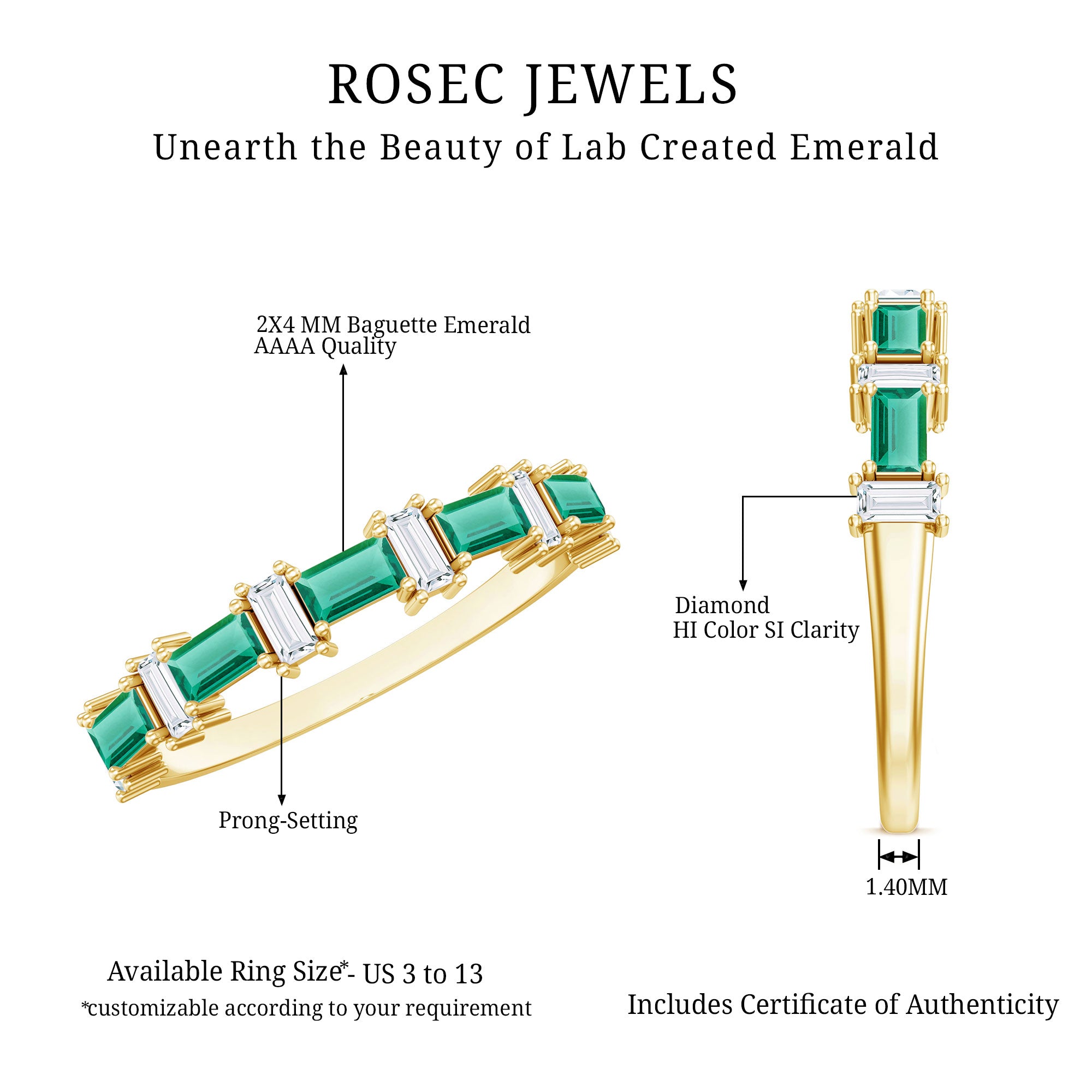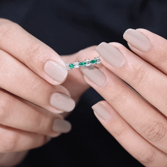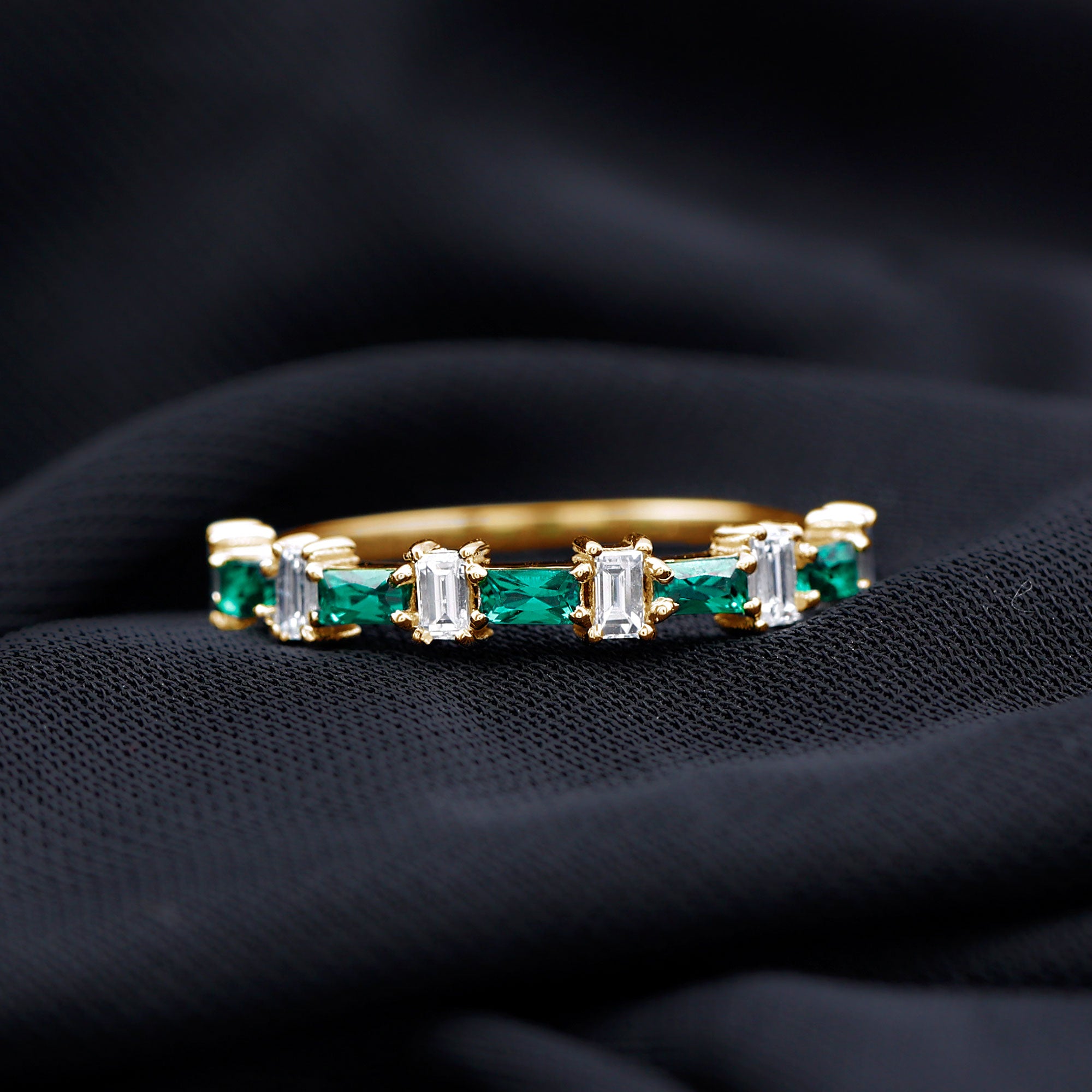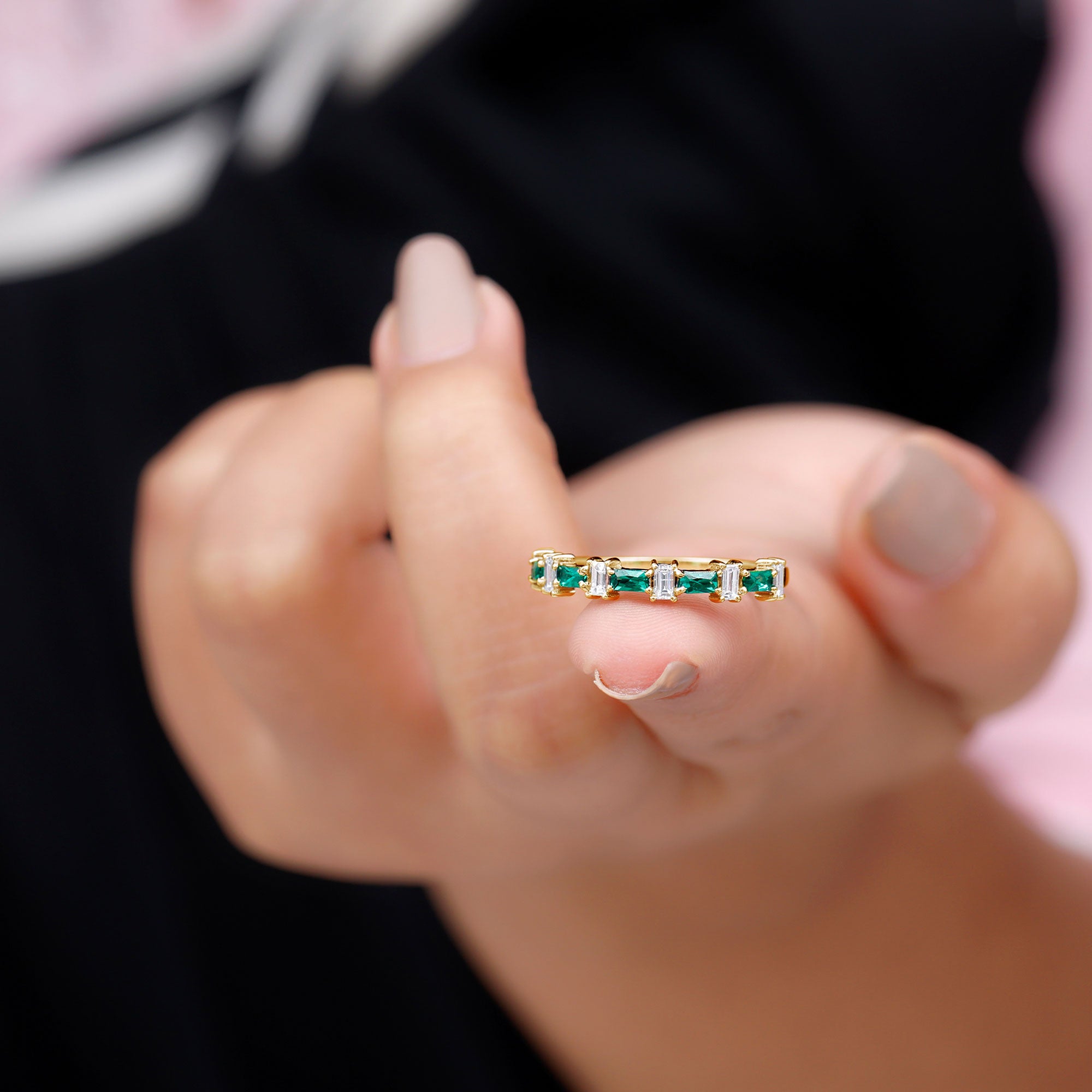 This Half Eternity Ring is a beautiful blend of modern style and meaningful symbolism. The ring features Baguette Shape AAAA Quality Lab Created Emerald and HI-SI Diamond stones set in an eye-catching alternate pattern along half of the band. What makes this design unique is the way the stones are placed, the Lab Emerald stones are placed horizontally, while the Diamonds are set vertically, creating a stunning geometric contrast that enhances the sparkle and color of each stone. The green Lab Emerald symbolizes growth, harmony, and renewal, while the Diamond represents strength and everlasting love. The half eternity design allows a comfortable fit and daily wear while still giving the appearance of endless brilliance. This thoughtful design makes this Baguette Emerald Ring ideal for marking significant milestones like anniversaries, special occasions or simply as a meaningful gift to express your love. Available in various sizes and presented in an elegant jewelry box, this Lab Grown Emerald Diamond Ring stands as a timeless expression of your commitment, a piece she will cherish forever.