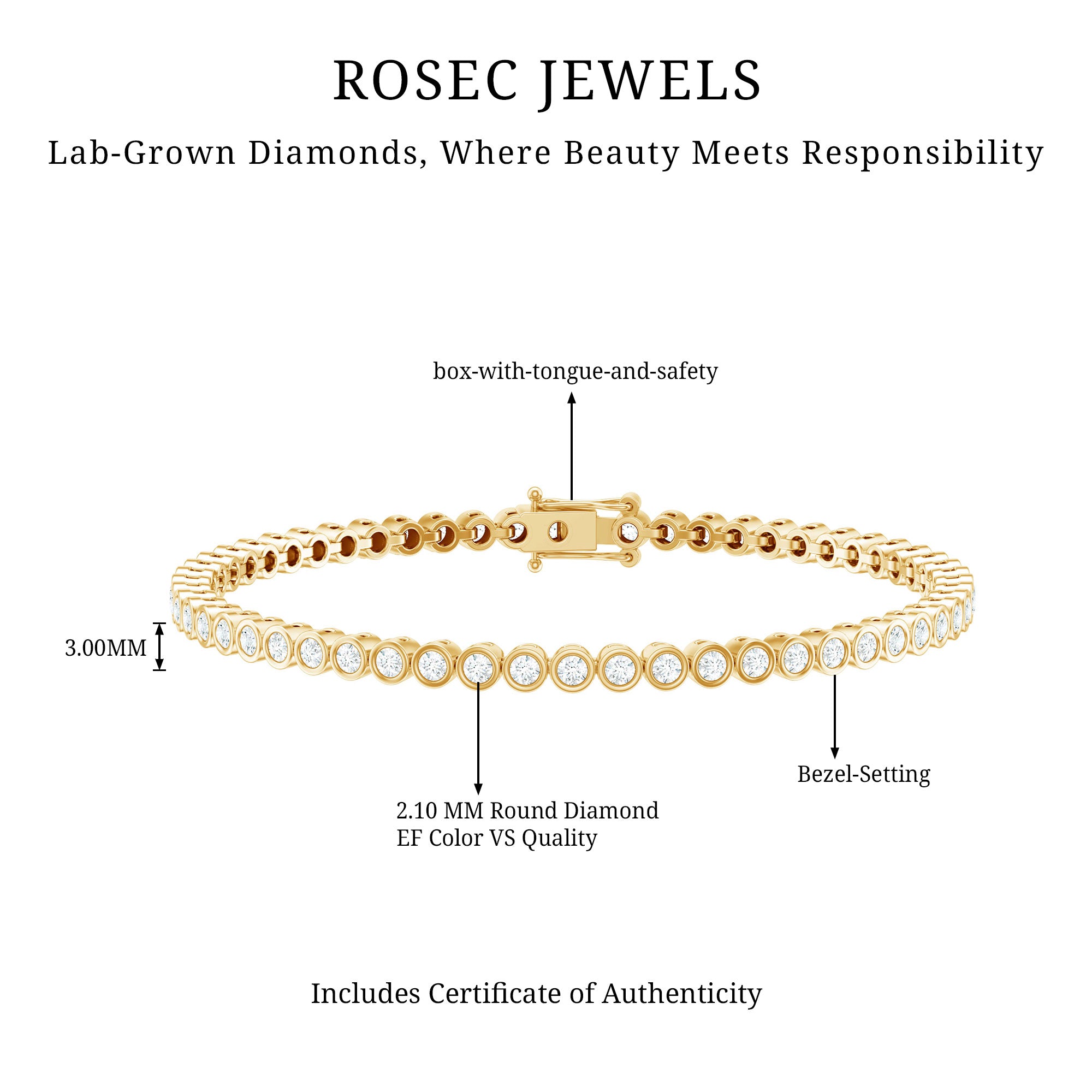 The Rosec Jewels Lab Created Diamond Tennis Bracelet is the perfect accessory to make you dazzle at any evening event. This stunning piece features a continuous row of EF-VS quality lab-grown diamonds. Each stone is beautifully framed in a secure bezel setting, enhancing its brilliance. The Eternity Bracelet is equipped with a box-with-tongue-and-safety clasp, ensuring a snug and comfortable fit for all-day wear. Symbolizing love, strength, and endless possibilities, it makes a thoughtful gift for yourself or someone special. Lightweight and versatile, this Bezel Set Tennis Bracelet adds just the right amount of sparkle without being too much. You can also pair it with another bracelet for a fashionable stacked effect.