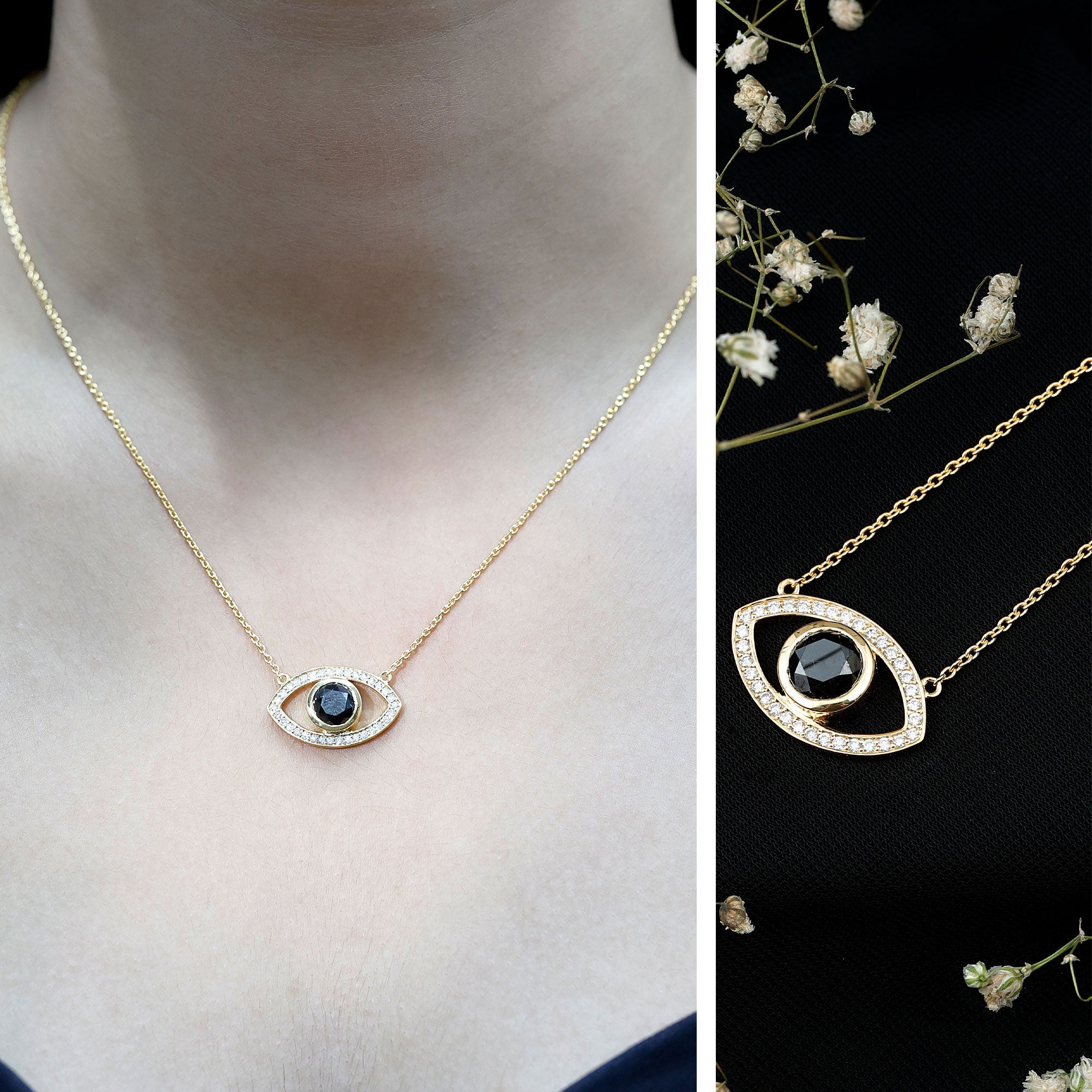 Protect your loved one with this elegant Evil Eye Necklace, thoughtfully crafted for both meaning and beauty. Designed in shimmering Yellow Gold Plated Silver, this Third Eye Necklace features a striking Round Shaped Real Black Diamond at its center set in secure bezel setting. This AAA quality Black Diamond radiates confidence and mystery, making it the perfect focal point of this powerful symbol. Surrounding the center stone are sparkling EF-VS quality Lab Grown White Diamonds, meticulously arranged to form the classic evil eye shape. These brilliant diamonds add a luminous contrast, creating an eye-catching sparkle with every turn. Together, the black and white diamonds form a symbolic design believed to ward off negativity and bring good fortune to the wearer. The Black and White Diamond Necklace is suspended from a delicate yet durable chain that rests comfortably along the neckline, making it ideal for everyday wear or layering with other pieces. Whether you wear it for spiritual protection, personal meaning, or simply for its modern and chic appeal, this Black Diamond Evil Eye Necklace is a piece you will always feel connected to.