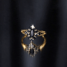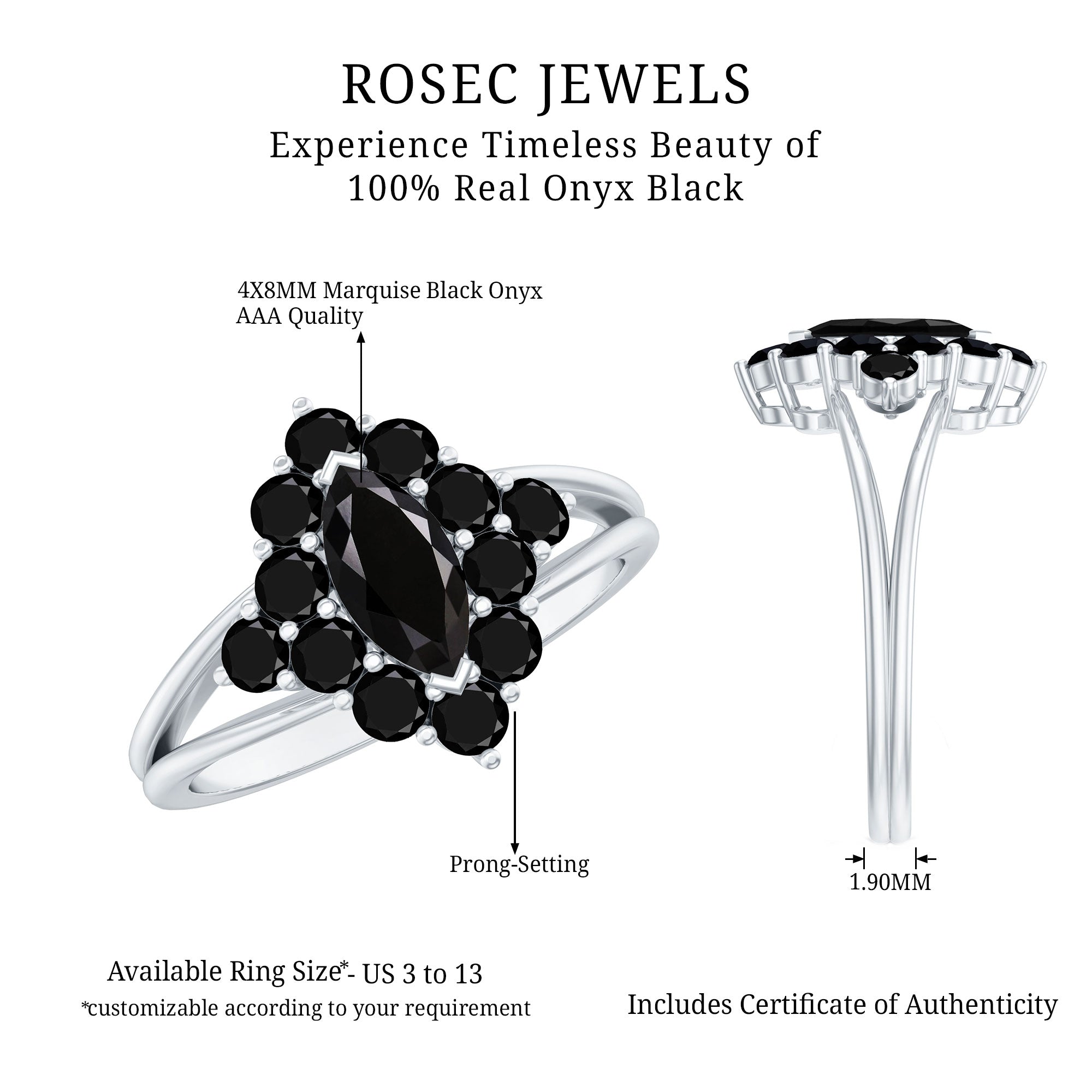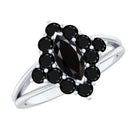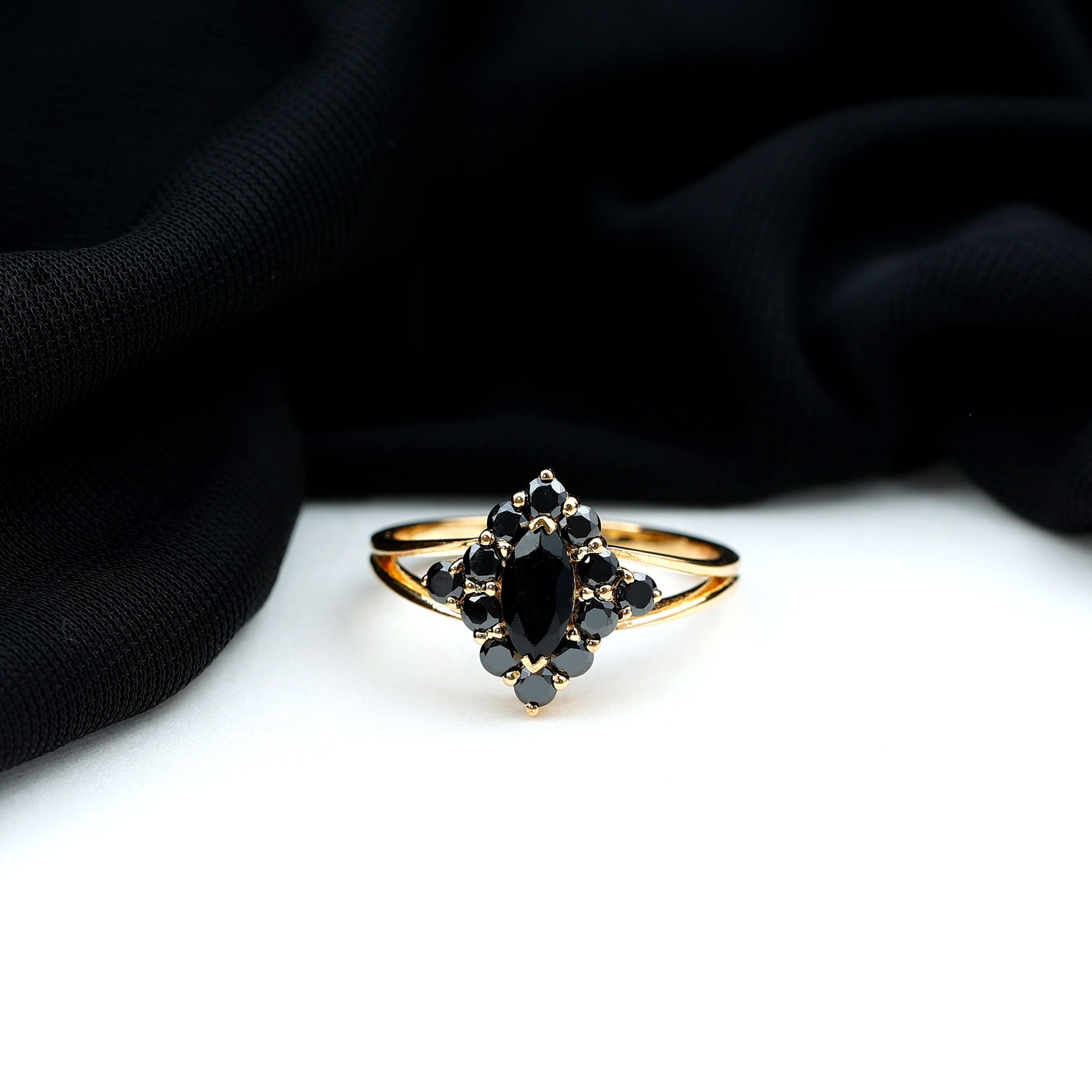Striking design meets powerful elegance in this bold Black Onyx Cocktail Ring. The center showcases a 4X8 MM marquise cut black onyx, carefully set to create a long silhouette on the finger. Around it, a cluster of round black onyx stones forms a beautiful frame, adding charm to the piece. Each gemstone is held in place by a secure prong setting, allowing their dark color to take the spotlight. Adding a contemporary twist, the split shank gently parts into two bands, giving the design an open and airy feel. This modern element balances the strong presence of the clustered stones, creating a look that is both fashionable and timeless. Made from AAA quality black onyx, this Cluster Engagement Ring offers a daring style that suits those who appreciate jewelry with character. Whether chosen as an engagement ring or worn as a statement accessory, it captures attention with its unique shape and confident appeal. Perfect for special occasions or when you want to add a touch of drama to your outfit, this Black Onyx Ring for Women combines classic gemstones with modern design features. It is a wonderful choice for anyone seeking a piece that is meaningful, stylish, and unforgettable. Celebrate your boldness and individuality with this striking Black Onyx Engagement Ring, a symbol of strength and beauty that stands apart from the ordinary.