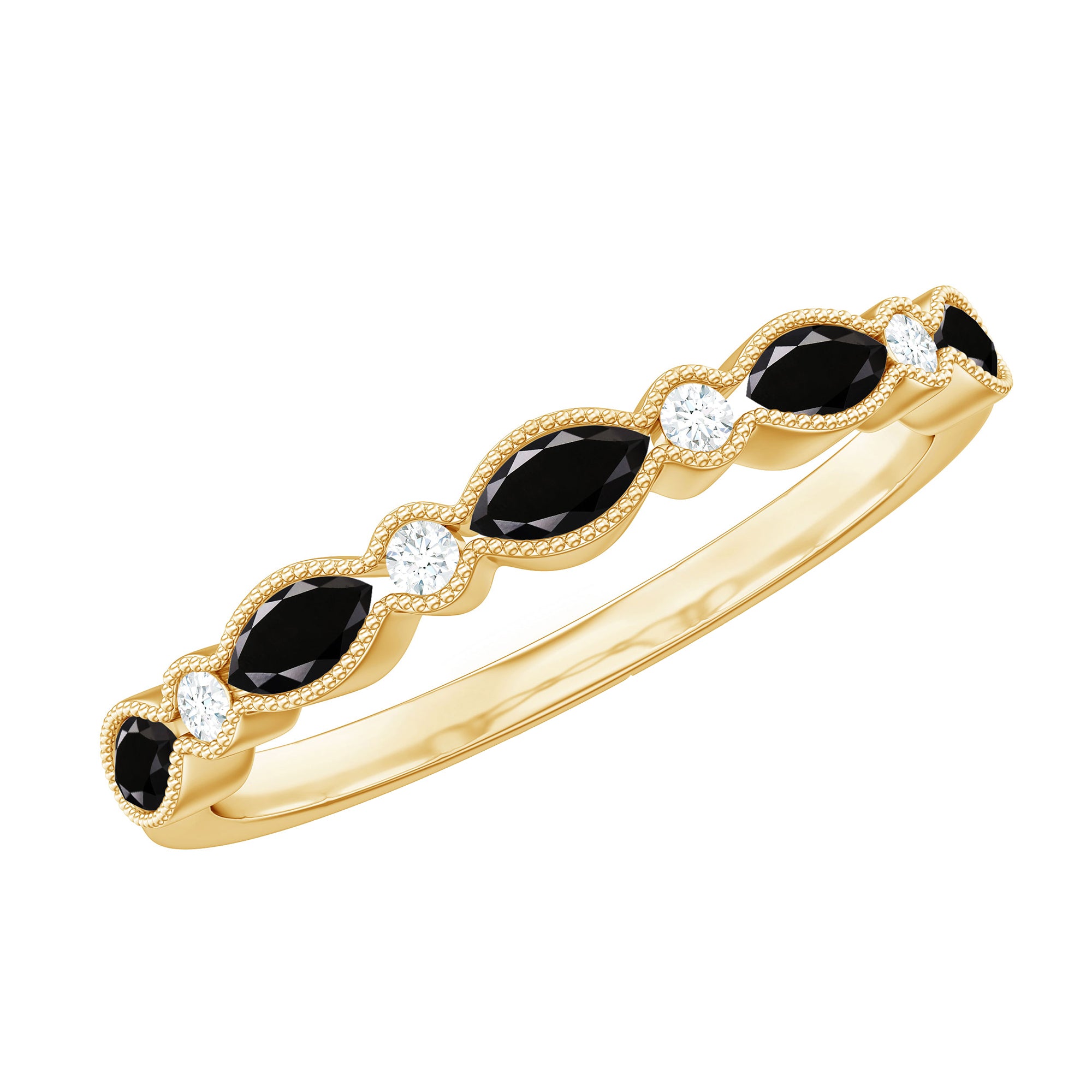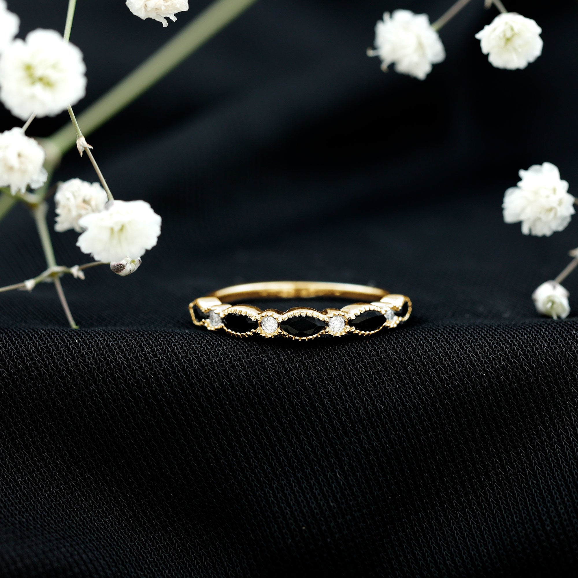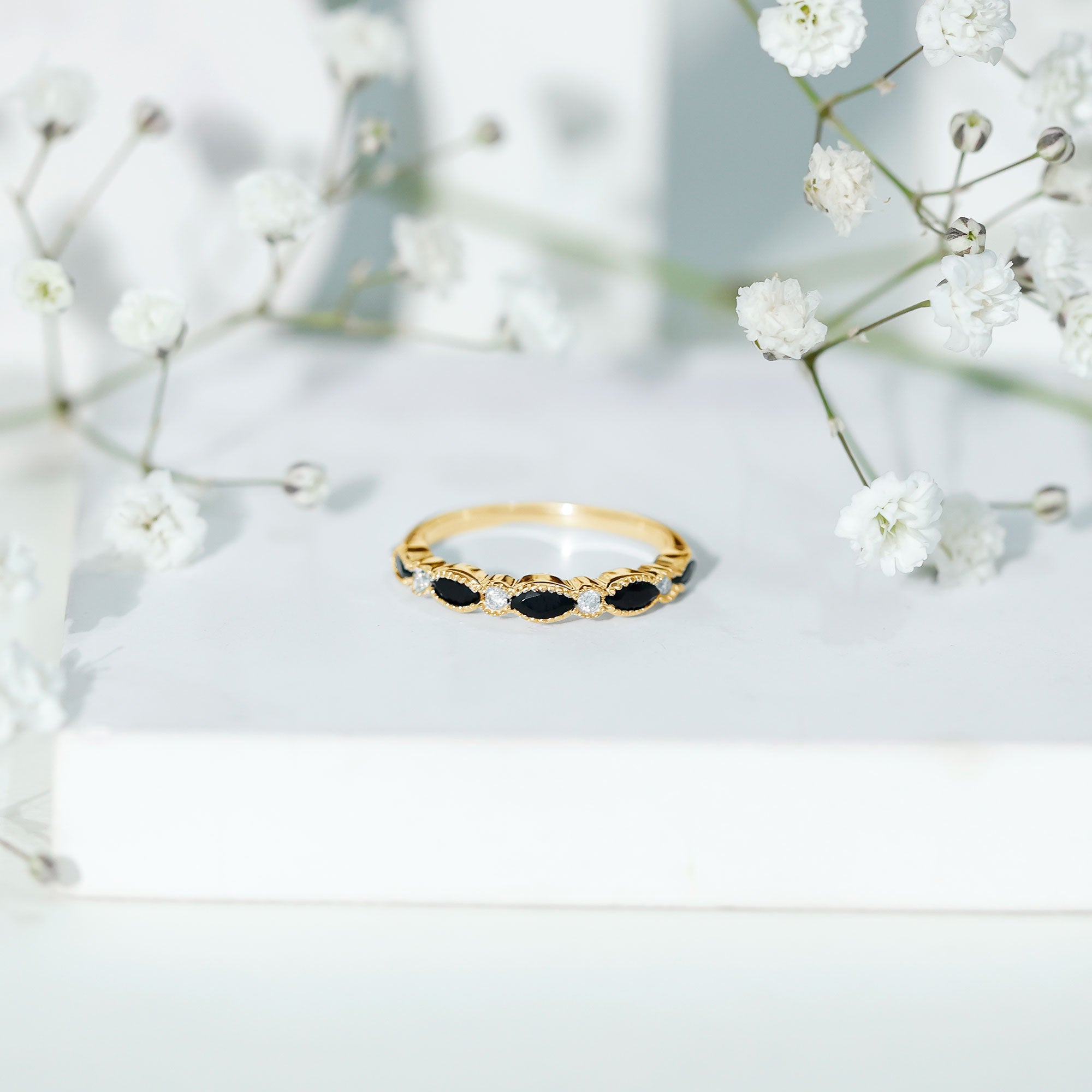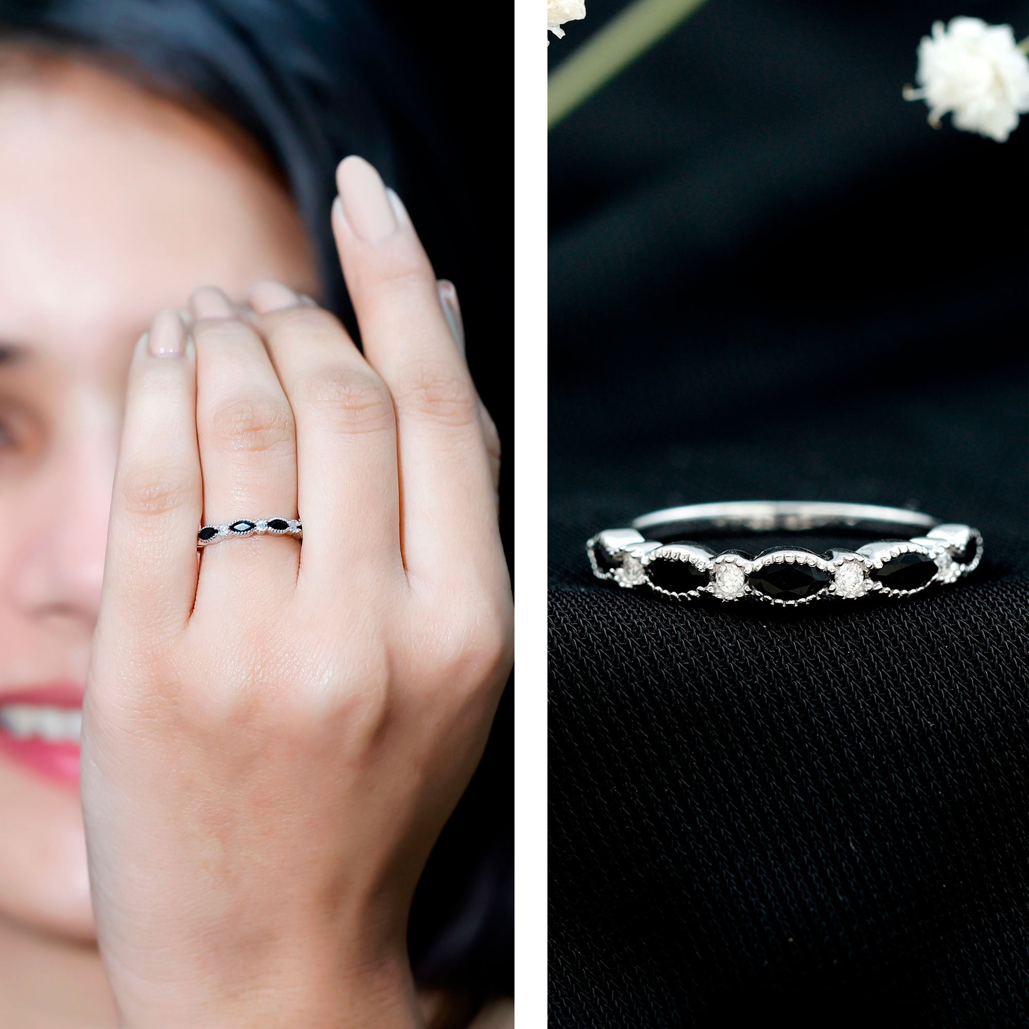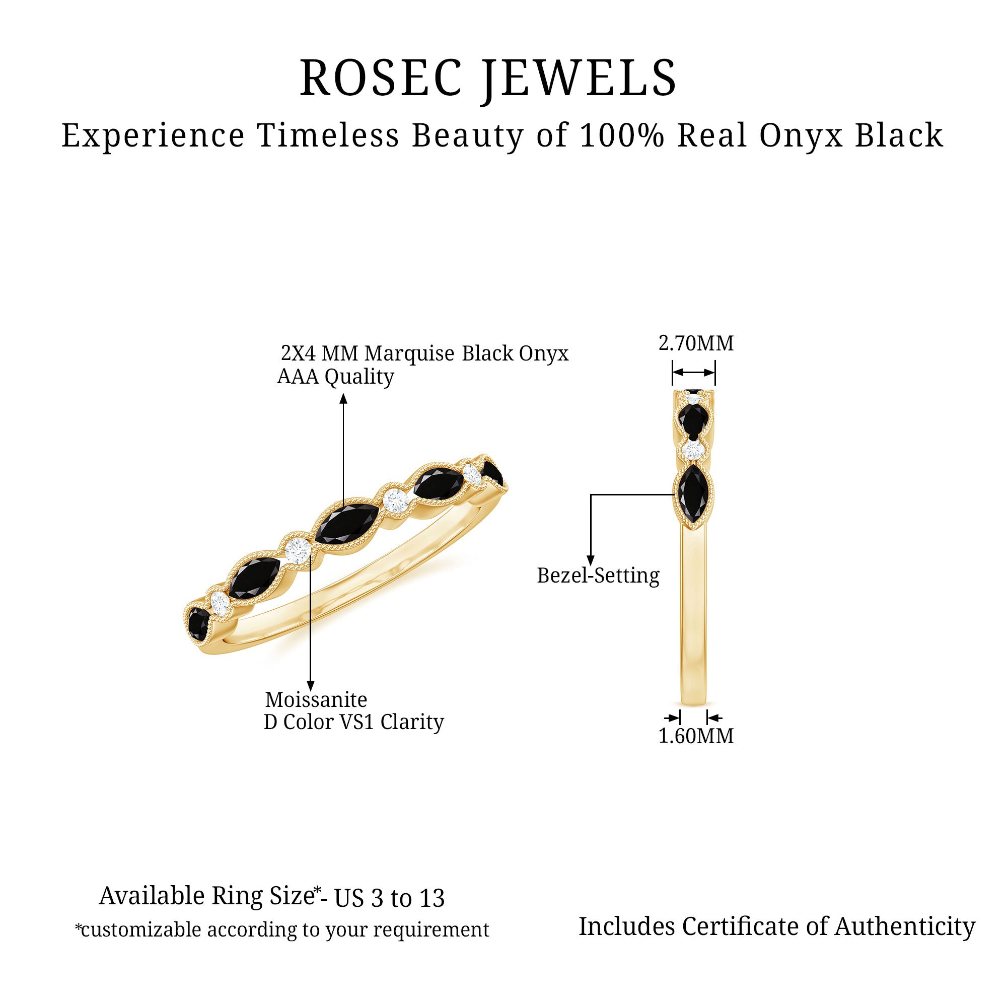 Add a touch of elegance to your everyday style with this beautifully crafted Black Onyx Eternity Ring. Designed to be both simple and eye-catching, it features a graceful pattern of marquise cut black onyx and round moissanite stones set in an alternating style. Each stone is carefully placed in secure half bezel setting, giving the Black Onyx Stackable Ring a smooth and polished look. Delicate beaded detailing adds texture and a vintage inspired charm to the design. The combination of bold black onyx and sparkling moissanite creates a lovely contrast that feels timeless and unique. This Black and White Ring is a great choice for stacking or wearing alone. It fits comfortably on the finger and pairs well with both casual and formal looks. Whether you are heading to work or out for a special occasion, this Half Eternity Ring adds just the right amount of charm. It is also a thoughtful gift, especially for those born under the Leo zodiac sign. Whether you are shopping for yourself or looking for a meaningful gift, this ring is a lovely way to celebrate style, strength, and special moments. Designed by Rosec Jewels with care and attention to detail, it is a piece to treasure every day.