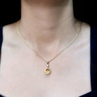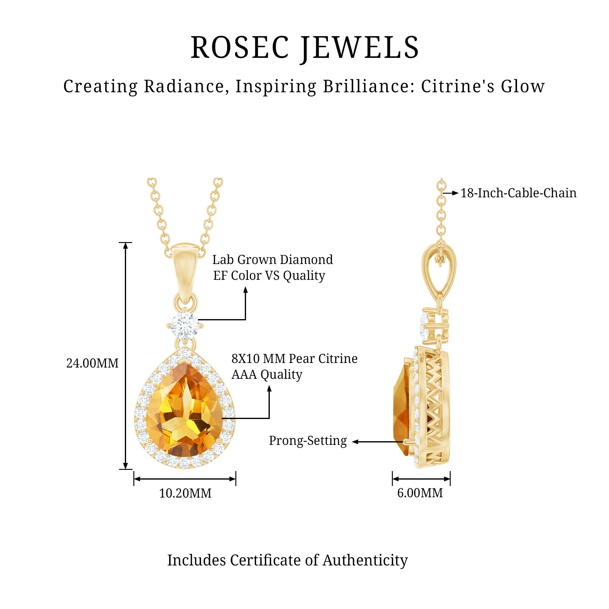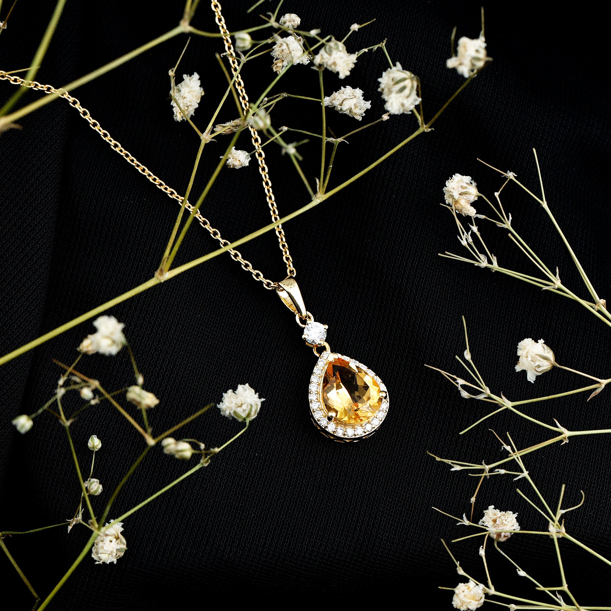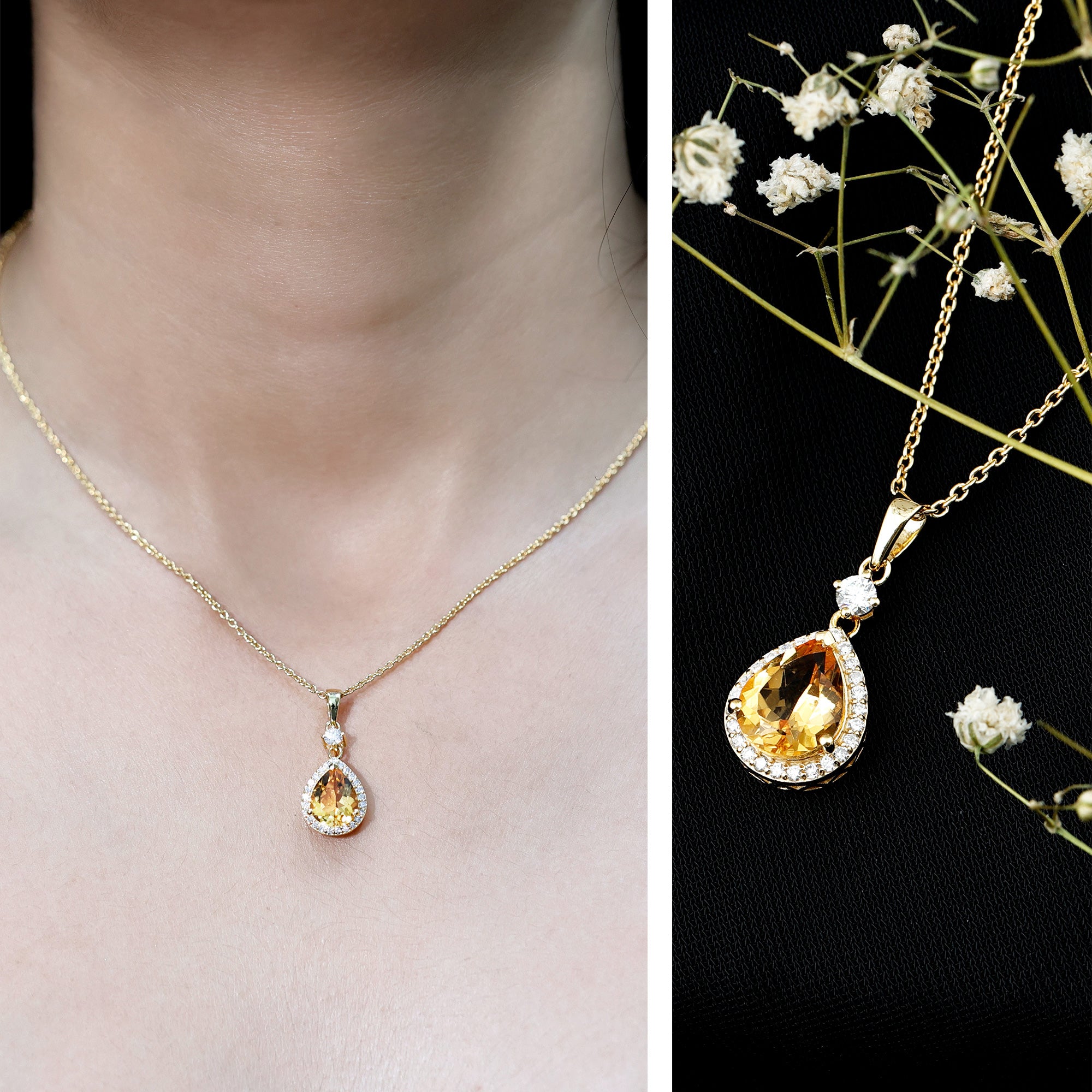 Warm golden tones meet effortless elegance in this Citrine Pendant Necklace designed to capture the essence of November’s birthstone. A vibrant 8X10 MM pear cut citrine of AAA quality takes center stage, full of personality and symbolic meaning like joy, abundance, and vitality. Surrounding the center stone is a brilliant halo of lab grown diamonds (EF-VS quality), carefully set to enhance the depth and fire of the citrine. Just above the teardrop shape, a single round lab grown diamond creates a smooth transition from the stone to the sleek silver bail. Crafted in 14k yellow gold plated sterling silver, the Teardrop Necklace offers a polished finish with durability that is built for daily wear. The sturdy cable chain sits comfortably against the skin and holds the Citrine and Diamond Necklace in place with subtle elegance. Great for meaningful gifting or simply elevating your everyday style, the Pear Shaped Necklace arrives in a beautifully designed signature box, ready to become a favorite piece in any jewelry collection. With its glowing color and delicate sparkle, the Halo Necklace makes a thoughtful choice for birthdays, milestones, or personal moments that deserve a little shine.