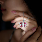 Adorn yourself with the stunning beauty of our Butterfly Pendant Necklace. This exquisite piece features oval and heart shaped Created Ruby stones set on the wings of a butterfly, with round Moissanite halo surrounding each ruby and enhancing its sparkle. This Ruby and Moissanite Necklace is a perfect addition to your everyday jewelry collection and makes for a memorable Valentines Day gift. The intricate butterfly design symbolizes transformation, beauty, and freedom, making it not just a necklace but a meaningful accessory. The combination of vibrant AAAA quality lab made rubies and sparkling D-VS1 quality moissanites adds a luxurious touch, while the delicate chain allows the Nature Inspired Pendant to sit elegantly around the neckline. This Ruby Butterfly Necklace pairs effortlessly with casual wear or more formal attire, making it versatile for any occasion. It comes beautifully packaged in a jewelry box and includes a certificate of authenticity to ensure its quality and value.