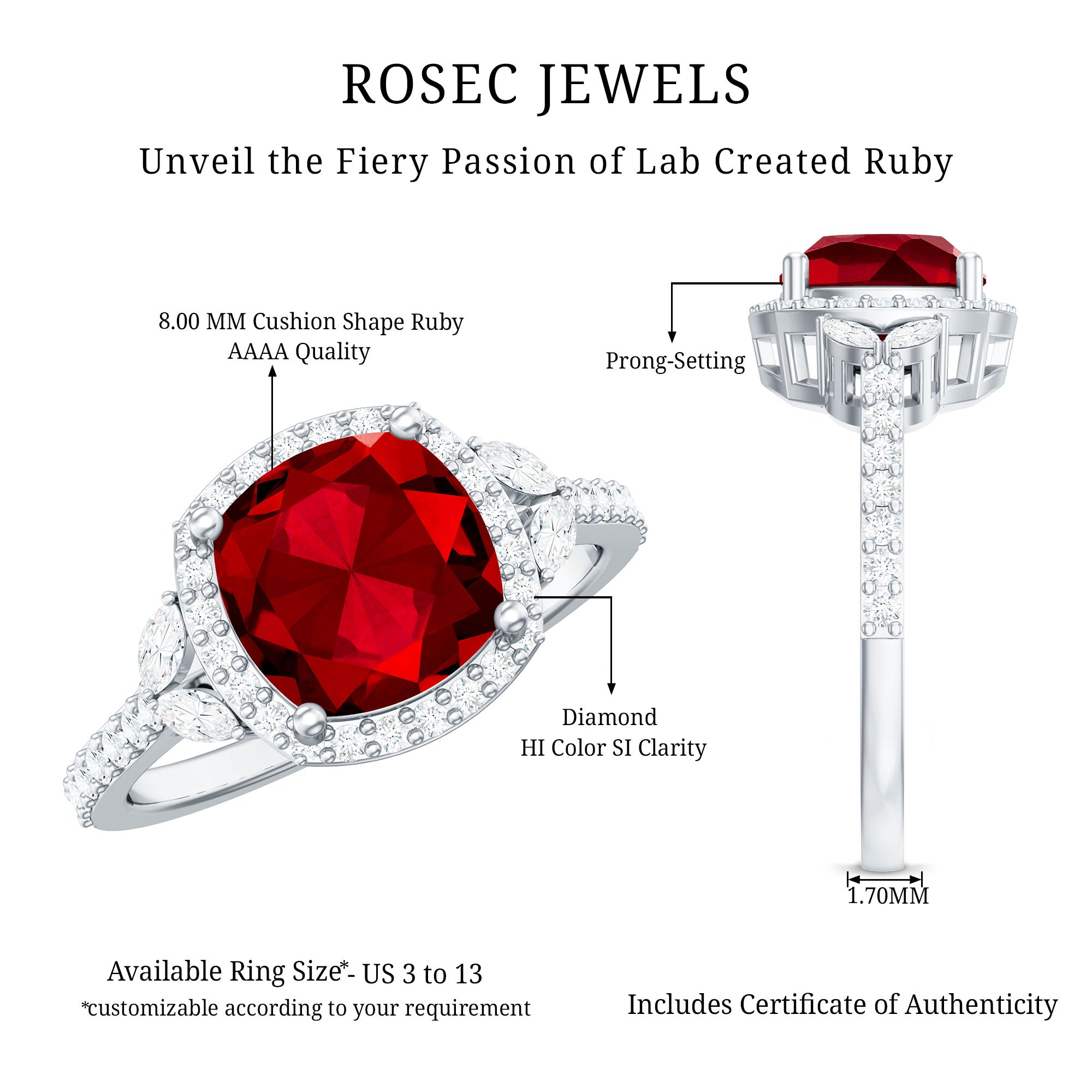 Turn moments into memories with this radiant Lab Grown Ruby Engagement Ring, glowing in the color of love. At its center glows a stunning 8 MM cushion cut lab grown ruby, held securely in claw setting. Surrounding the ruby is a sparkling diamond halo, while the marquise and round diamonds are carefully arranged as side stones to add radiance to the design, creating a captivating harmony of fire and sparkle. The ring’s graceful craftsmanship makes it a timeless choice for celebrating life’s most meaningful moments. Whether it is for a proposal, anniversary, or special occasion, this Halo Engagement Ring is a beautiful symbol of love that never fades. Crafted with precision and care, this Ruby and Diamond Ring combines beauty with durability, making it perfect for everyday wear. Each gemstone is certified for quality and authenticity, ensuring you receive a piece of lasting brilliance. Comes in a signature jewelry box, this Cushion Cut Engagement Ring is ready to gift and treasure forever.