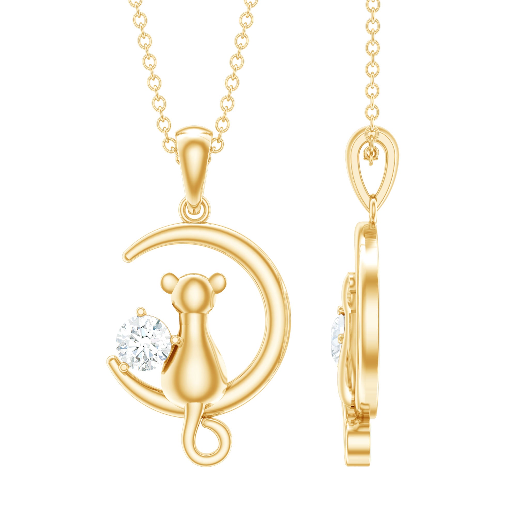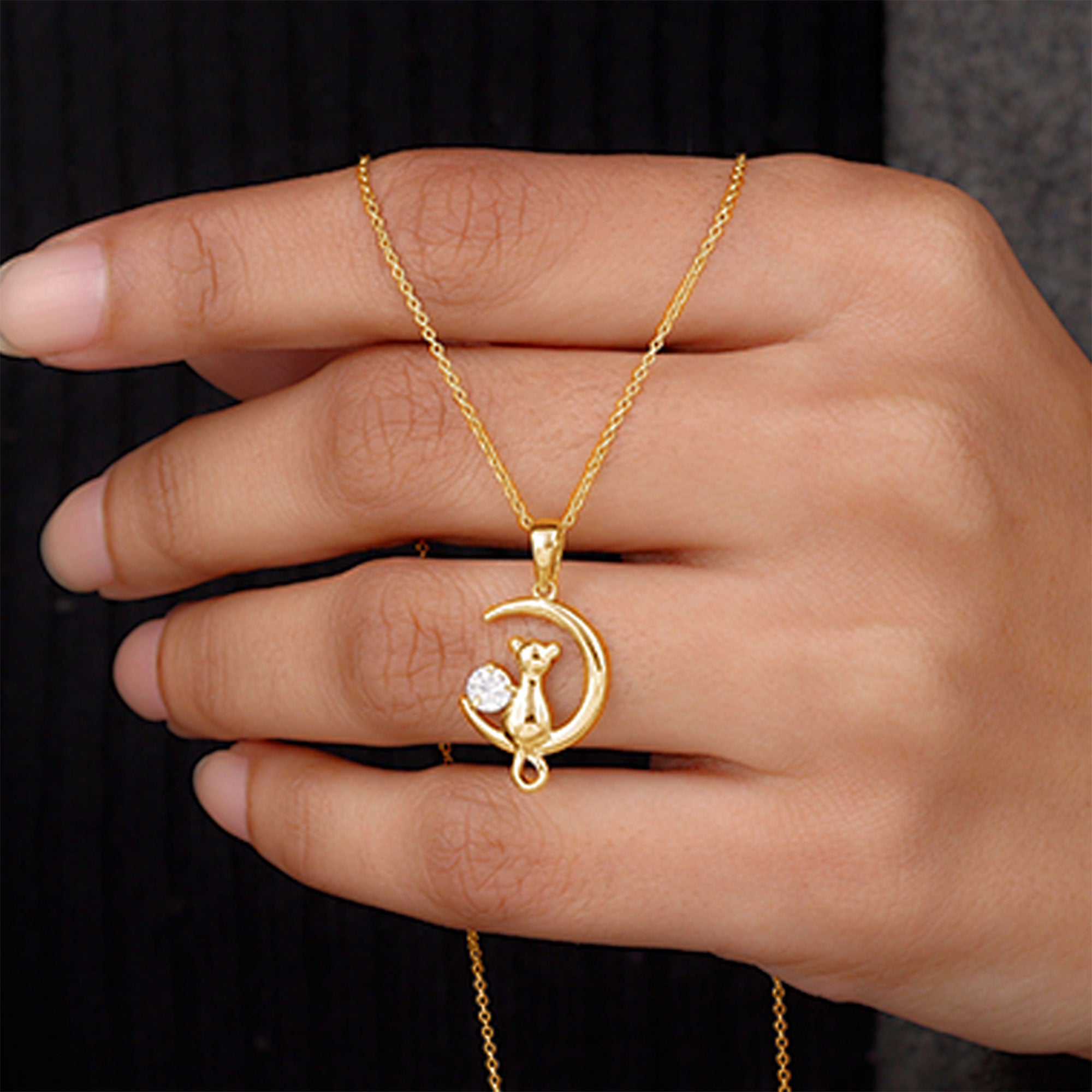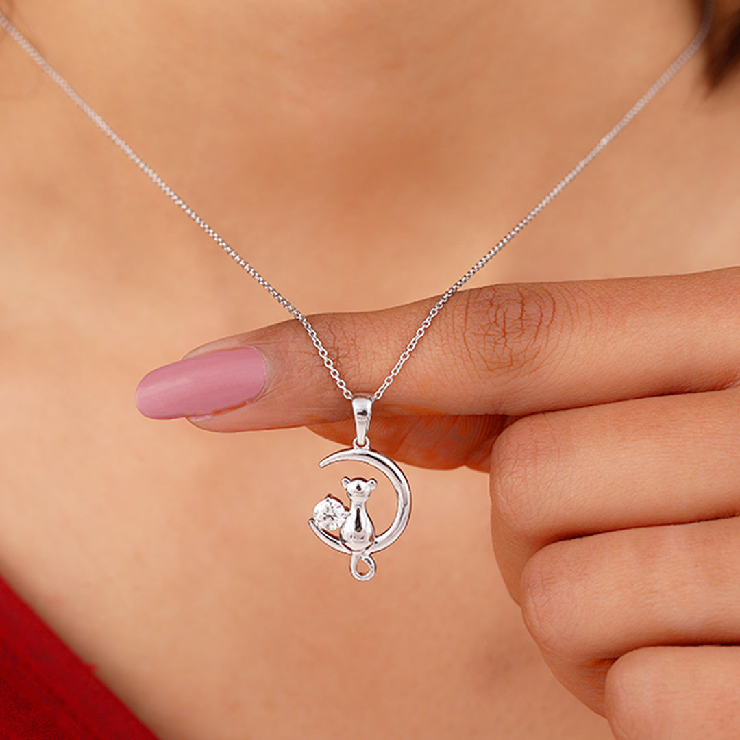 A new more to design for the fellow friends is all here to mesmerize them with this enchanting Cat On Moon Necklace that represents a connection to intuition and inner strength, as well as a celebration of both the feline and celestial realms. Adorn yourself with this Cat Necklace, harnessing fast-moving energy and moon magic. Dangling through a chain, this Diamond Pendant is carefully crafted with a lunar moon and a cat sitting over the moon and a Round brilliant cut Diamond. So, stepped into mystery and symbolism, carrying its energy and meaning. Delicate and with intricate details, this Moon and Cat Necklace is the sweetest gift for your favorite cat lover, which is a fun way to bring a little feline energy into your style with their enigmatic nature and independent spirit. Its gleaming detail captures the ethereal beauty of the night sky, bringing its secrets closer to you. Whether you are celebrating a birthday, marking a special occasion, or simply treating yourself to a little celestial enchantment, this Cat Crescent Moon Necklace is designed to inspire wonder and connection.