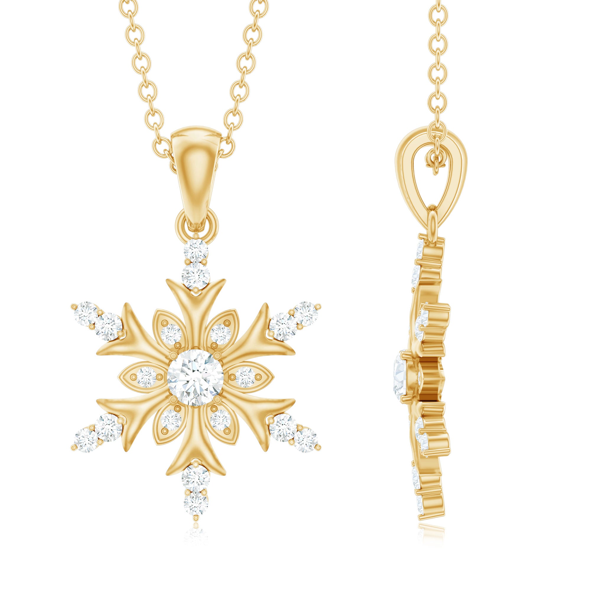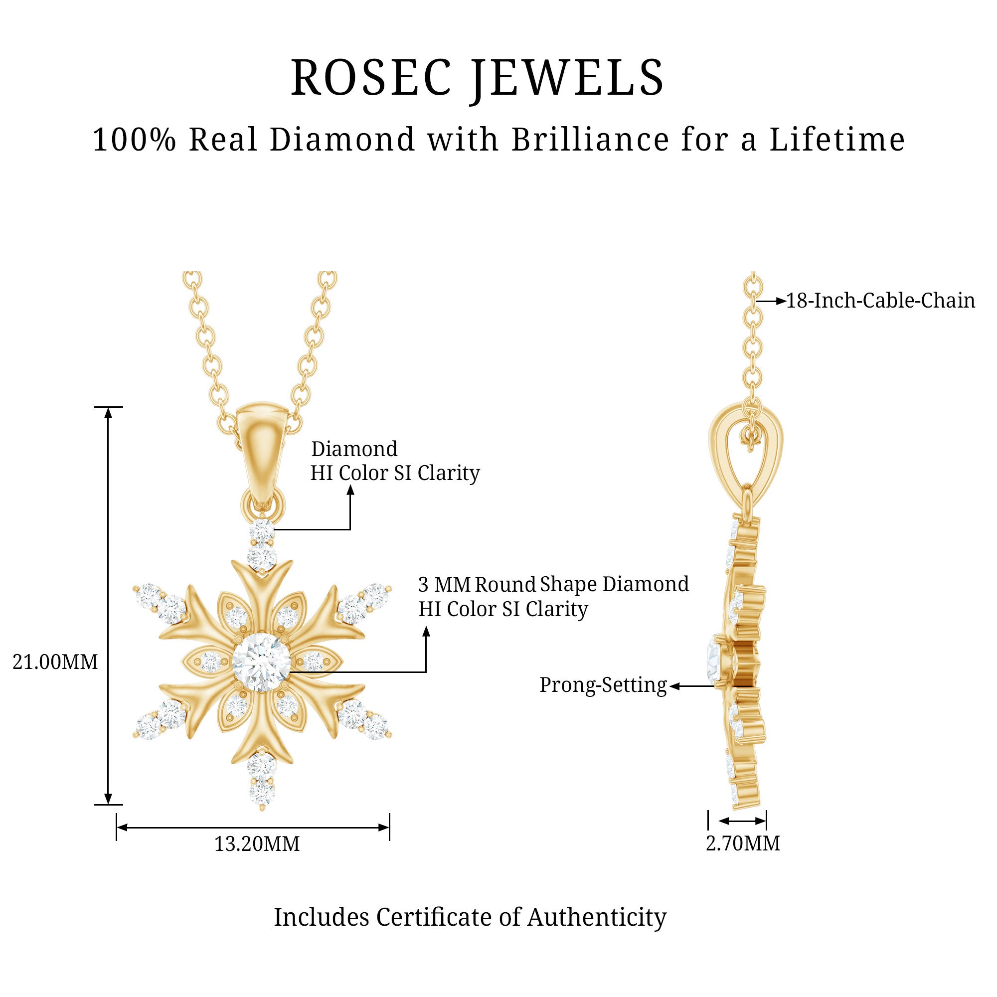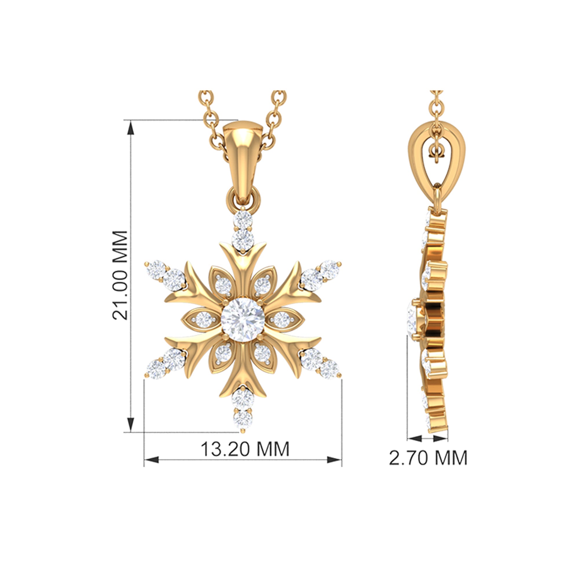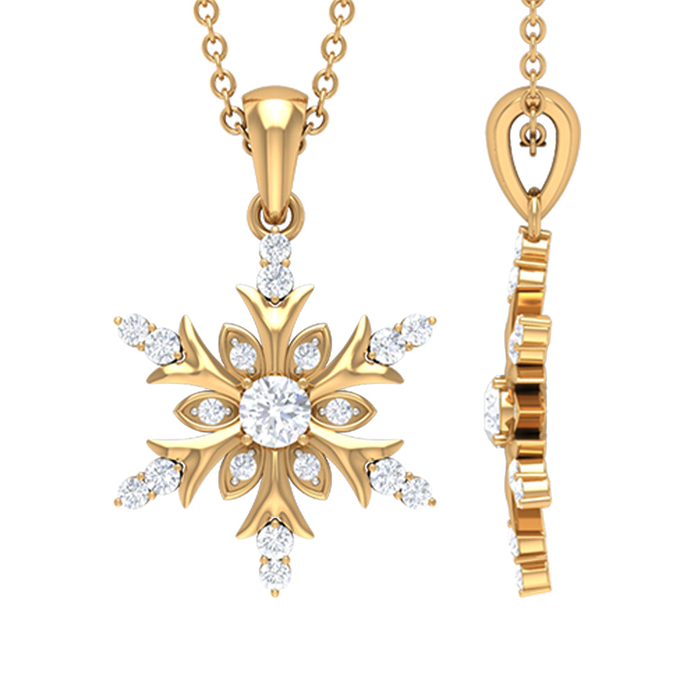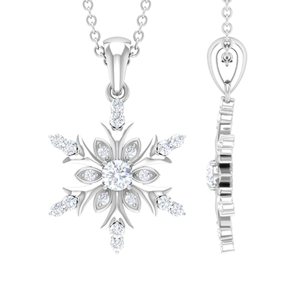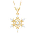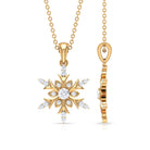 Embrace the spirit of winter with the enchanting Diamond Snowflake Necklace. Made from premium metal, this detailed snowflake design showcases beautiful round cut diamonds of HI-SI quality, securely held in prongs. The pendant hangs from a delicate cable chain, making it a breeze to wear. Its an ideal birthday gift for her, a sweet Valentine’s Day surprise for your girlfriend, or a thoughtful Christmas present for mom - this Snowflake Pendant Necklace is sure to light up their faces with joy. This Real Diamond Pendant is versatile enough to complement any outfit, whether youre going for a casual vibe or dressing up for a fancy evening. Snag yours today and step up your style game! This Snowflake Jewelry is a classic addition to your collection that will be cherished for years. Perfect for the festive season, this Designer Snowflake Necklace will bring a hint of magic to your Christmas ensemble.