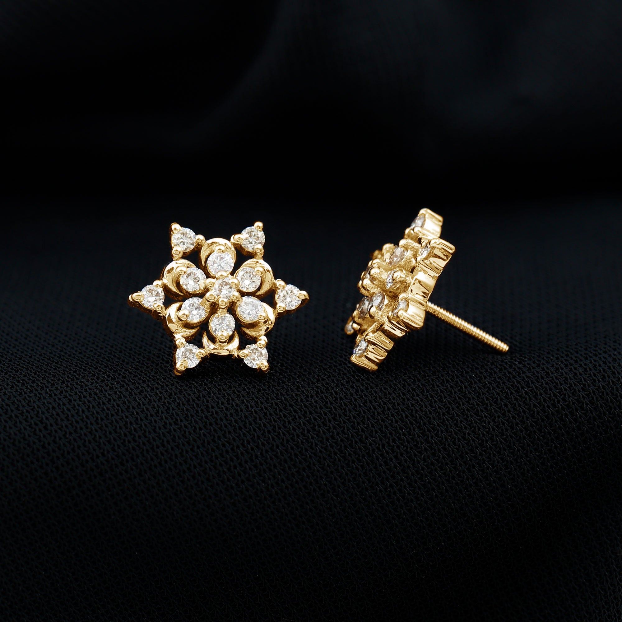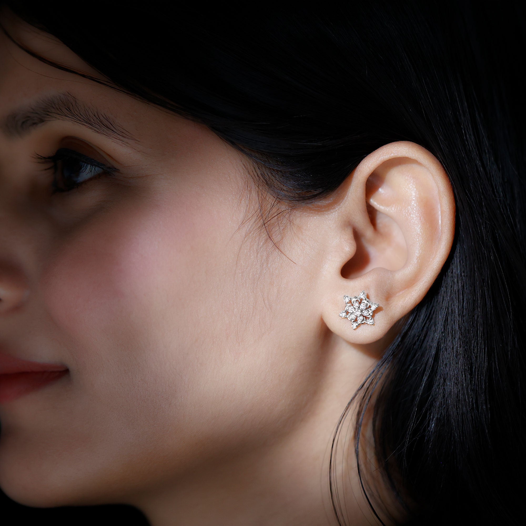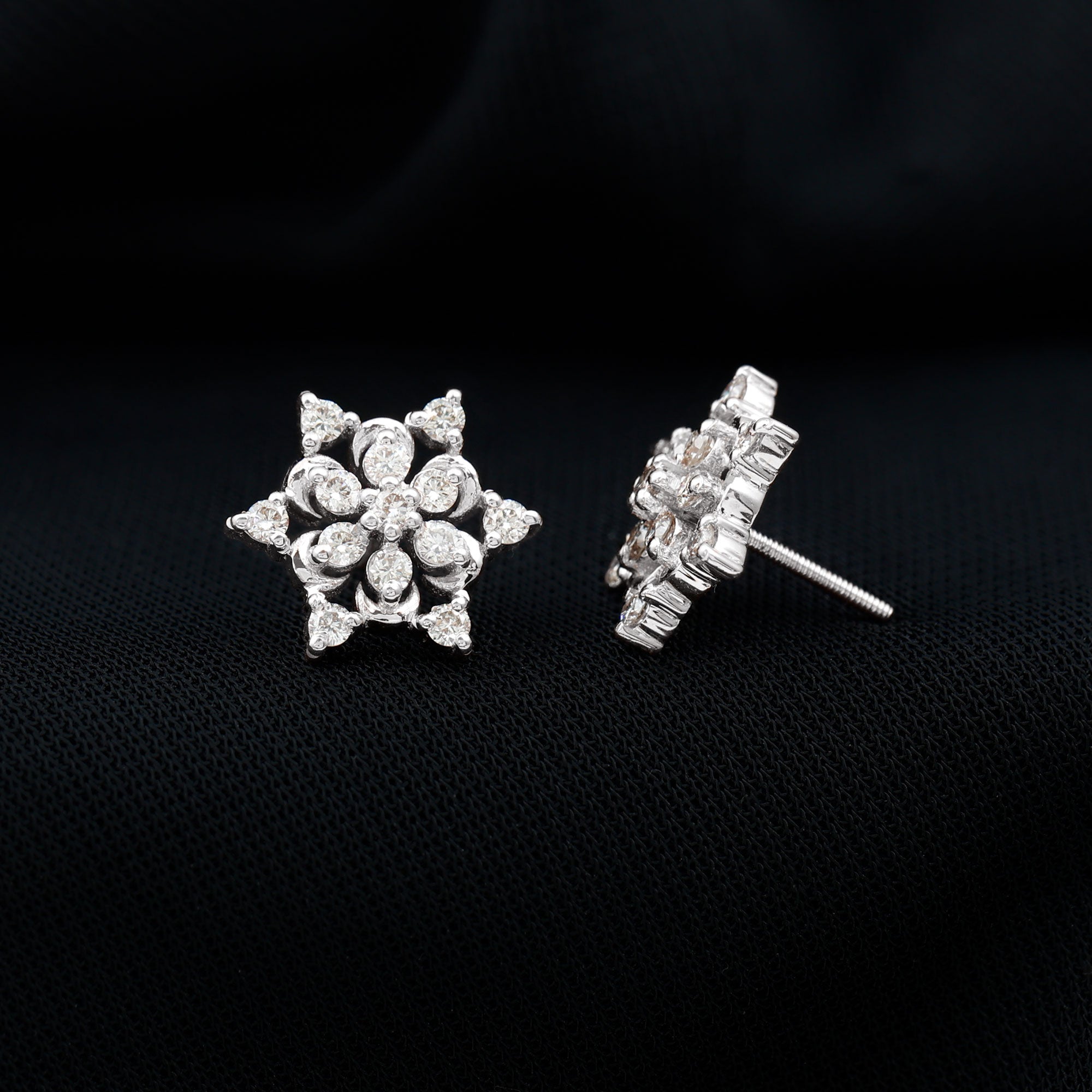 These beautiful Diamond Stud Earrings show the glamorous rendition of nature-inspired theme. Simple yet stunning, these Snowflake Earrings evoke the beauty and wonder of winter and are embellished with Round Shape Diamonds, which are scattered on the design, making the unique Snowflake. Inspired by the delicate and intricate details, these Diamond Snowflake Earrings add elegance and sophitication. As a unique way to commemorate the season and the crisp appeal of winter, these Earrings serve as a reminder of the beauty of individuality and the value of accepting ones own identity. They are secured with Screw back closure that would keep them intact all day long. As a fresh beginning, these Snowflake Stud Earrings are an ideal present for the one who appreciates the beauty of winter or has a connection to the snow. These snowflake-themed jewelry, have a delicate design that provides a magical and elegant touch that embraces the season and makes your look glow. Mystical and mesmerizing, these Snowflake Christmas Earrings let you mimic its beauty and lightness falling from the sky.
