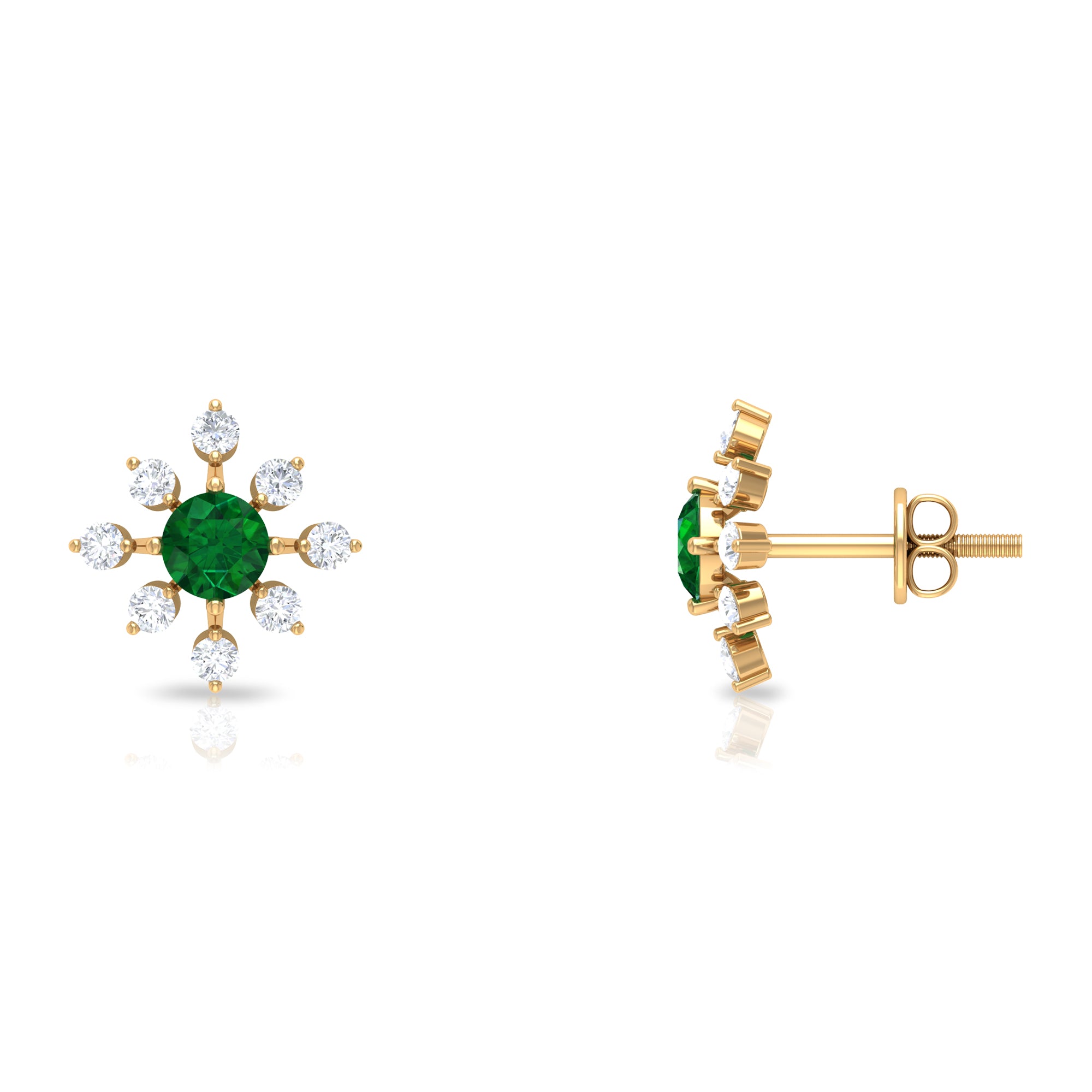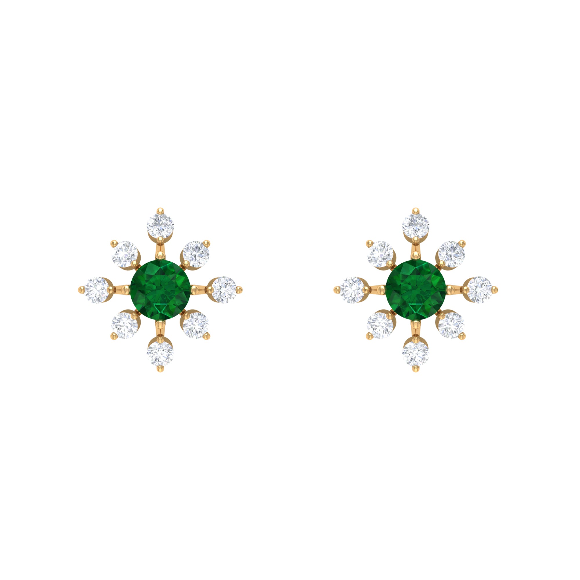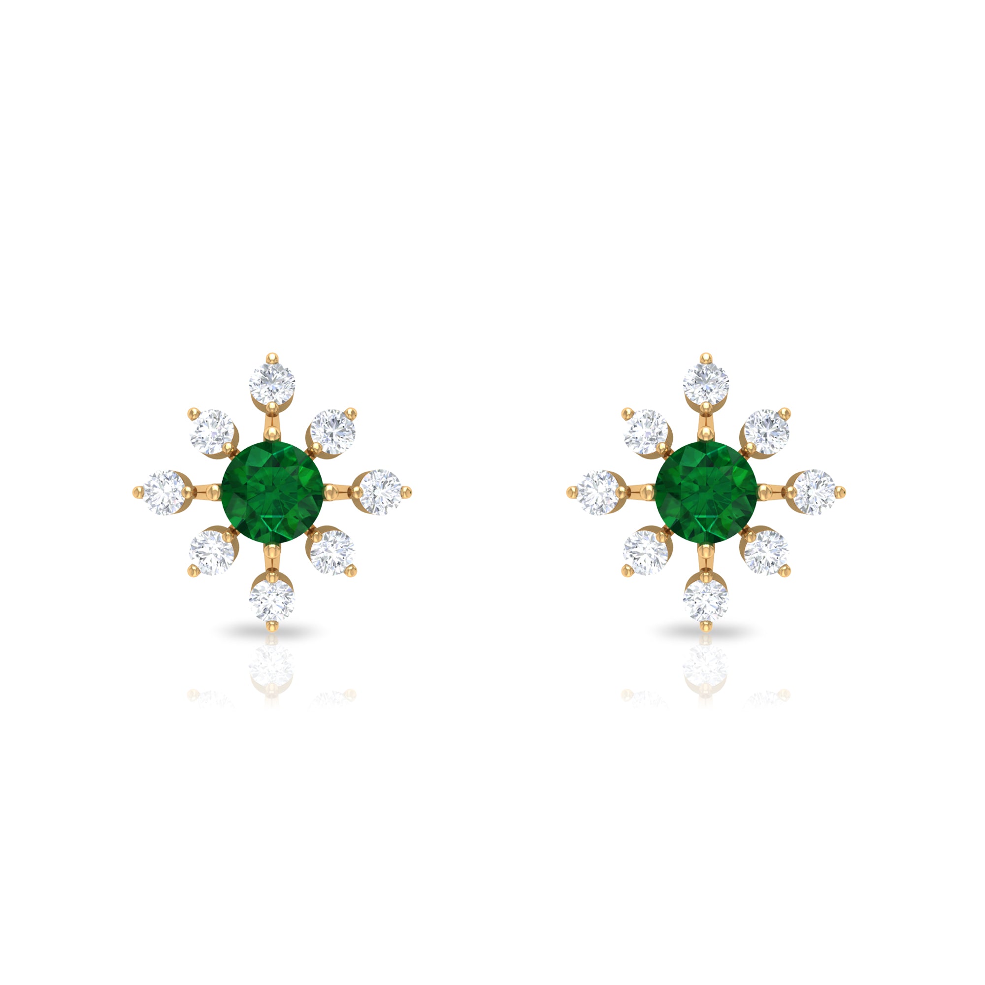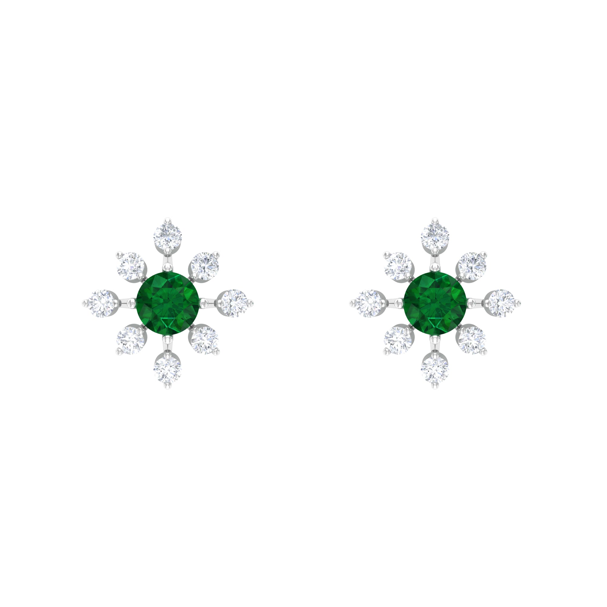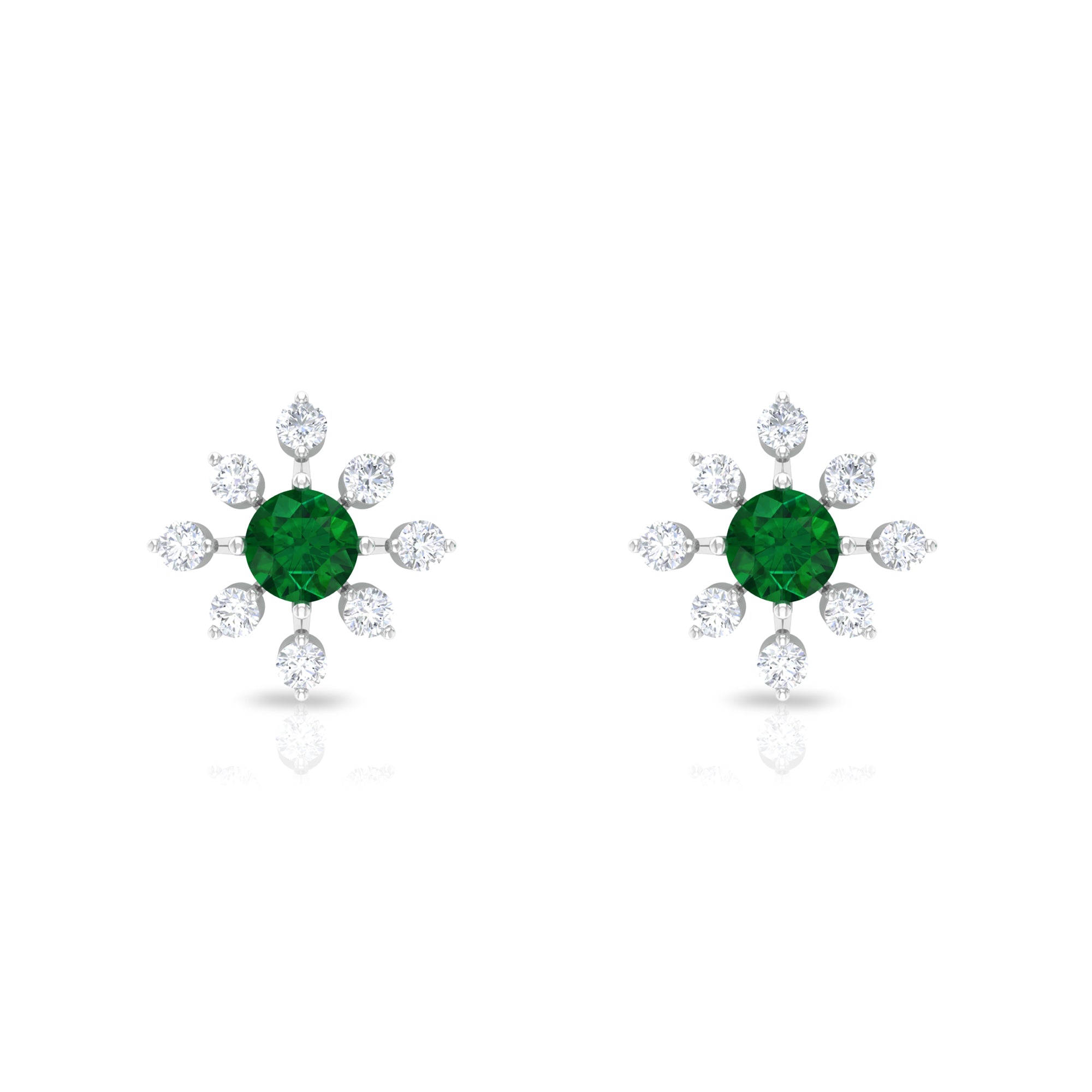 Indeed, the allure of jewelry is undeniable, and our Emerald Diamond Stud Earrings are no exception. These earrings are designed to melt your heart over and over again, featuring a captivating Round Shape Emerald as the center stone, surrounded by Diamonds arranged in a delicate floral pattern within a secure Prong Setting. They are a timeless and enchanting addition to your jewelry collection that youll cherish endlessly.