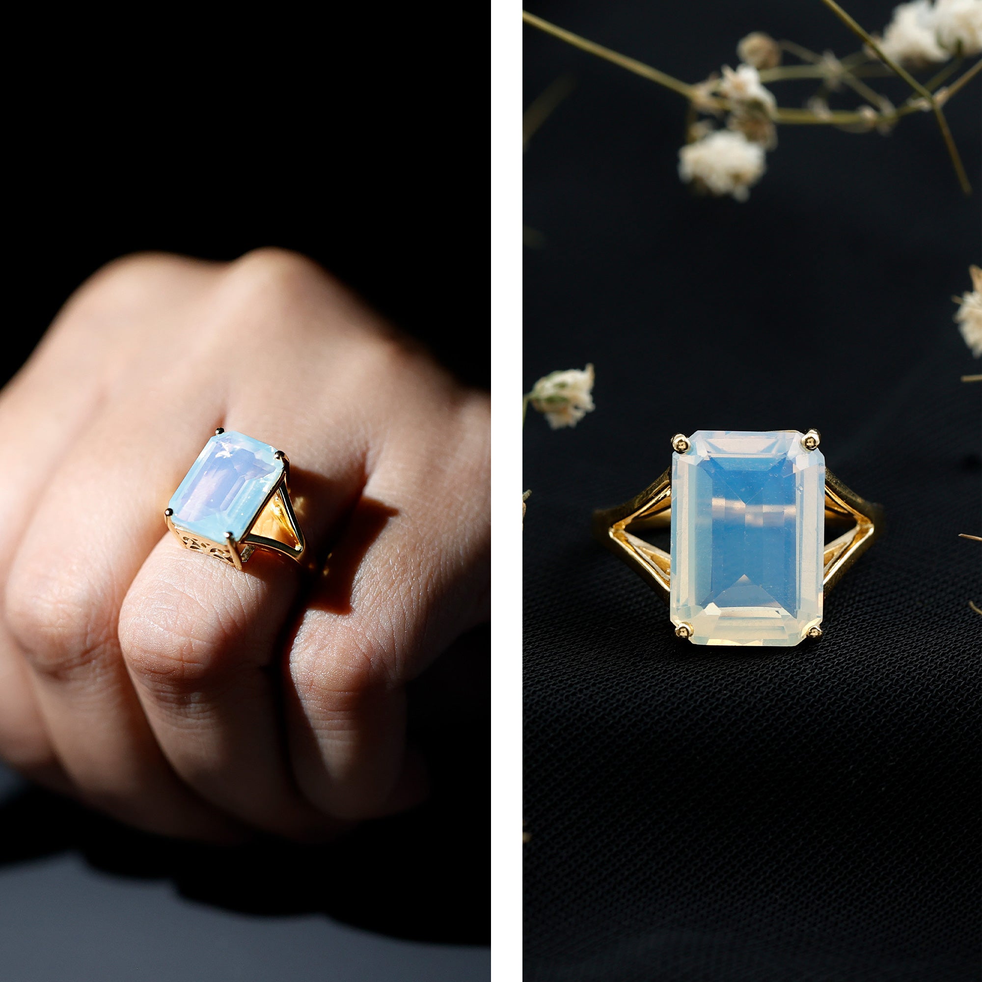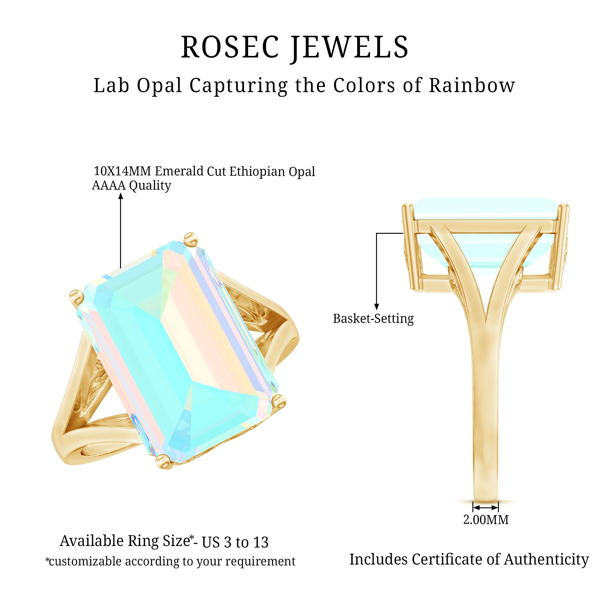 Upgrade your look with this stunning Ethiopian Opal Engagement Ring, crafted to make a striking and memorable impression. This beautiful piece showcases a gorgeous 10X14 MM Emerald Cut Opal, expertly set in secure basket setting with a split shank that amplifies its brilliance and shine. Made for those who appreciate eye-catching jewelry, this Statement Ring is ideal not only for engagements but also for cocktail parties, festive nights, or any special event where you want your style to shine. The Lab Created Ethiopian Opal featured in this Solitaire Engagement Ring is of AAAA Quality, guaranteeing exceptional sparkle and color, giving you a flawless glow similar to a natural stone. Our Cocktail Ring comes in various metal types and colors, allowing you to create a truly customized piece. It is also available in multiple ring sizes to ensure a perfect fit for every hand. Celebrate your lifes most significant moments with a piece of fine jewelry that showcases your unique personality. This Colored Engagement Ring is a fantastic choice that combines luxury, elegance, and modern ethics into one breathtaking design.