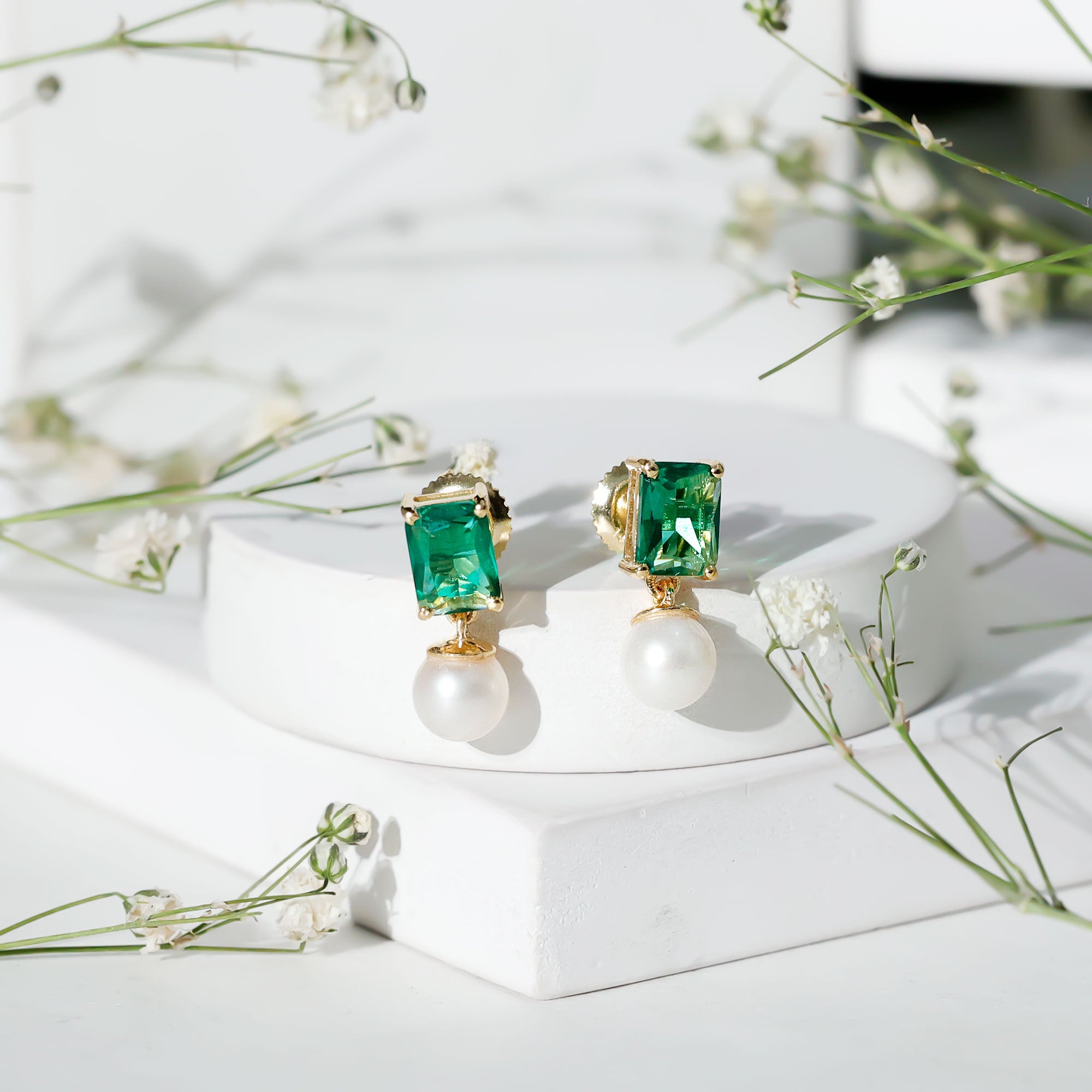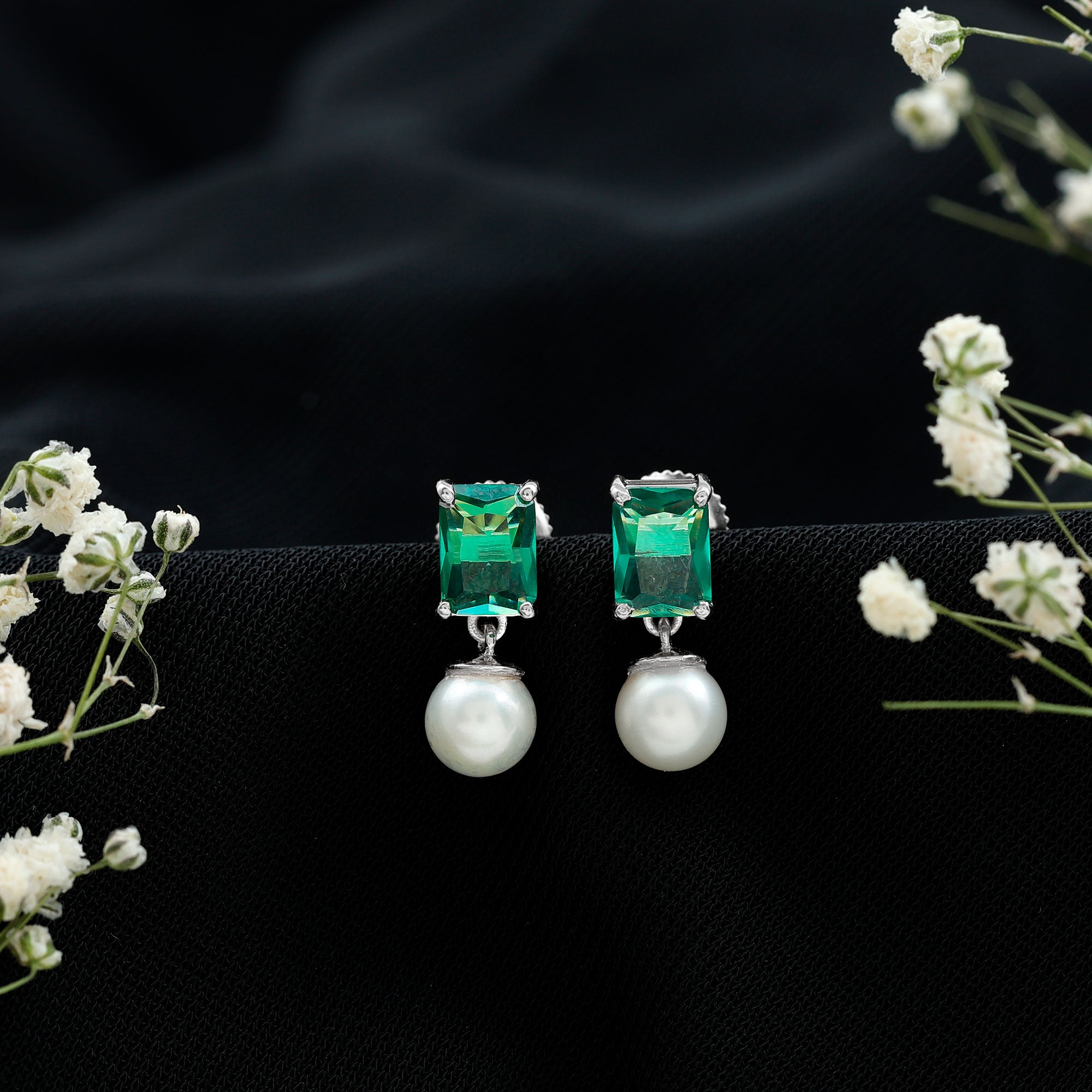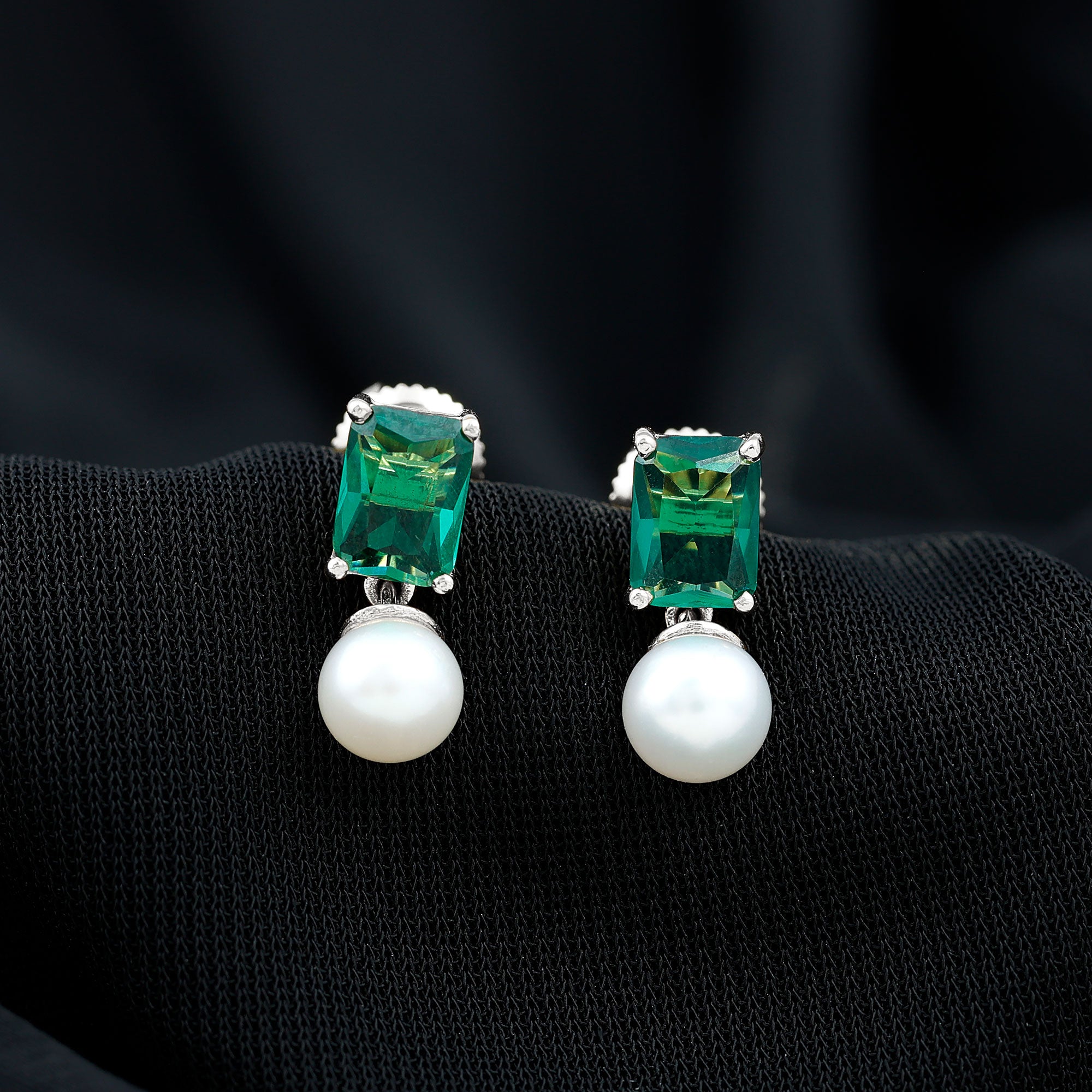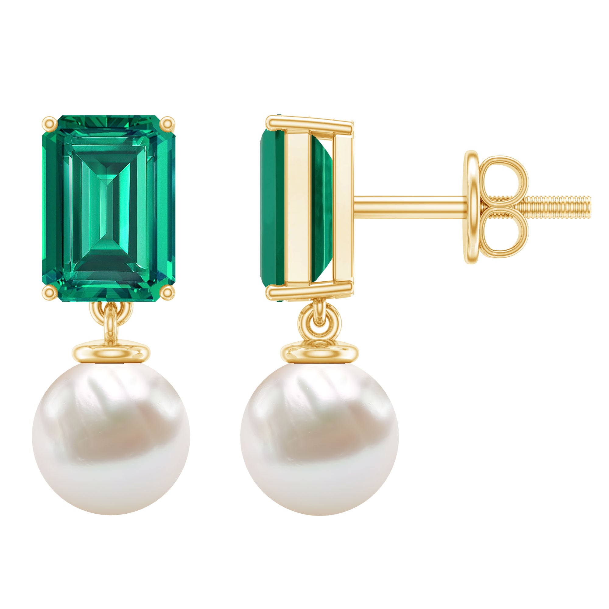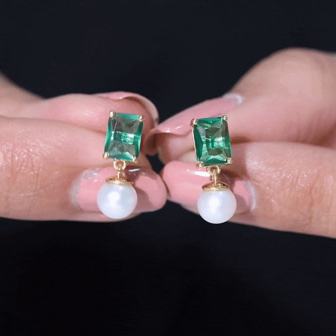 Certified Emerald Cut Lab Grown Emerald and Pearl Drop Earrings