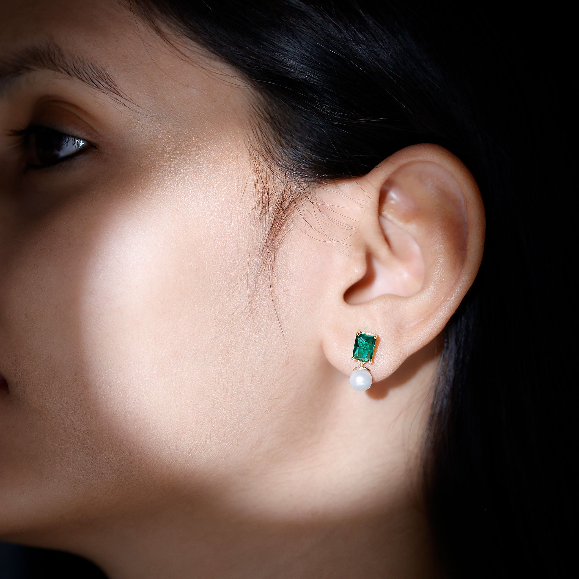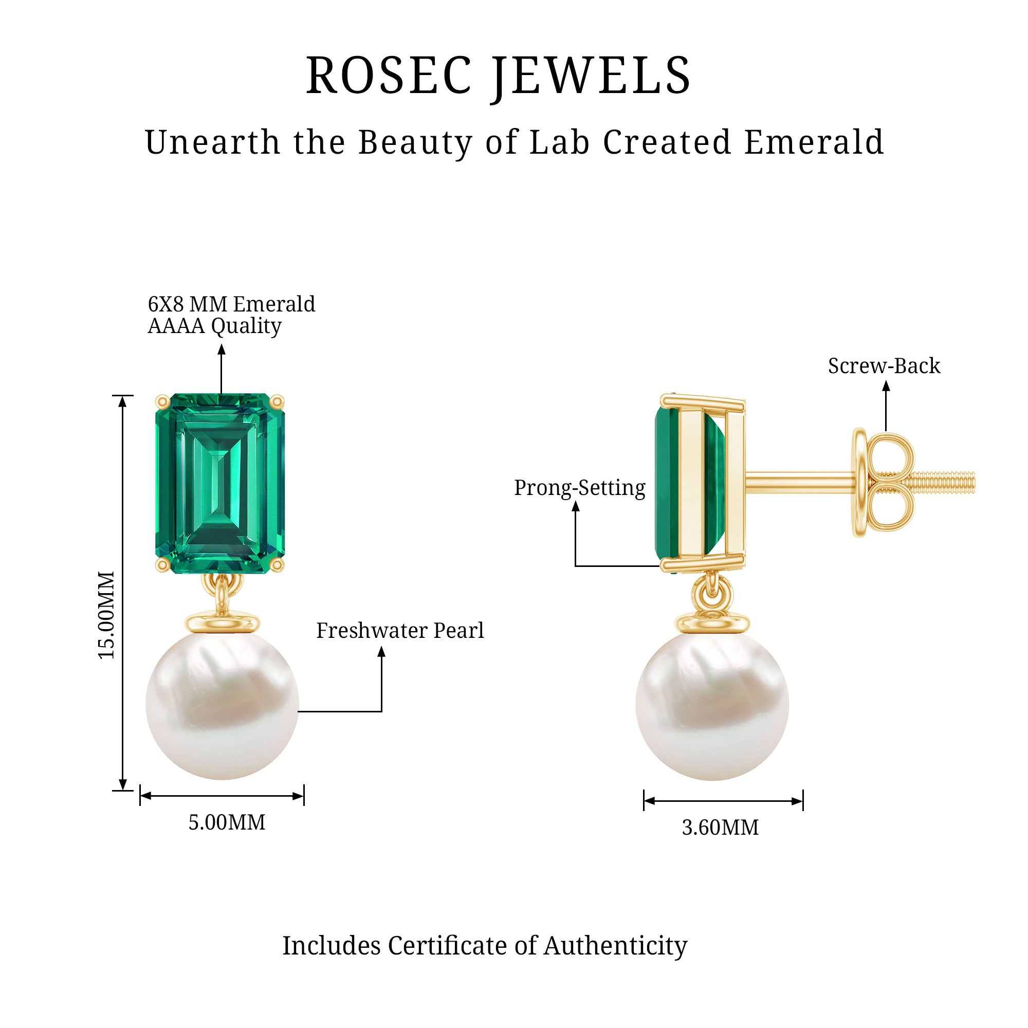 Turn heads with a perfect blend of bold color and timeless elegance. These Drop Earrings feature a stunning 6X8MM emerald cut lab created emerald as the centerpiece, set in prong setting. The rich green hue of the emerald creates a striking contrast against the soft, 6 MM round freshwater pearl drops, giving the Bridal Drop Earrings a sophisticated yet contemporary look. The combination of AAAA lab grown emeralds and lustrous AAA quality freshwater pearls makes them versatile enough to complement formal gowns, office attire, or even chic casual outfits. Crafted from high quality metal, the design ensures durability while maintaining a lightweight and comfortable feel for extended wear. The screw-back closures provide a secure fit, keeping the Freshwater Pearl Earrings in place throughout the day or evening without compromising on elegance. Perfectly packaged in a jewelry box and accompanied by a certificate of authenticity, these Pearl and Emerald Earrings make a thoughtful gift for birthdays, anniversaries, or special celebrations.
