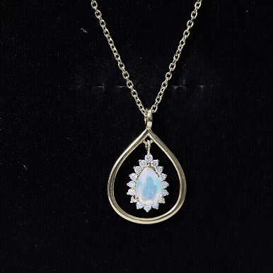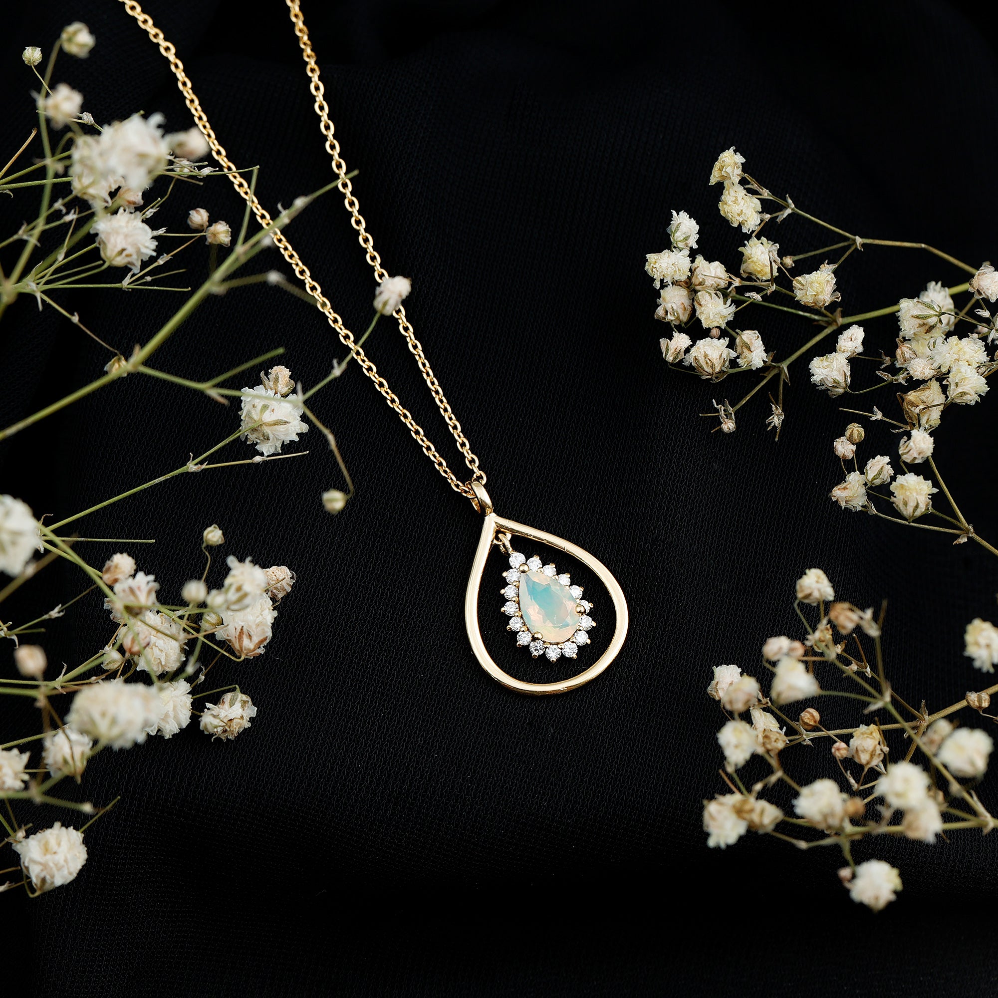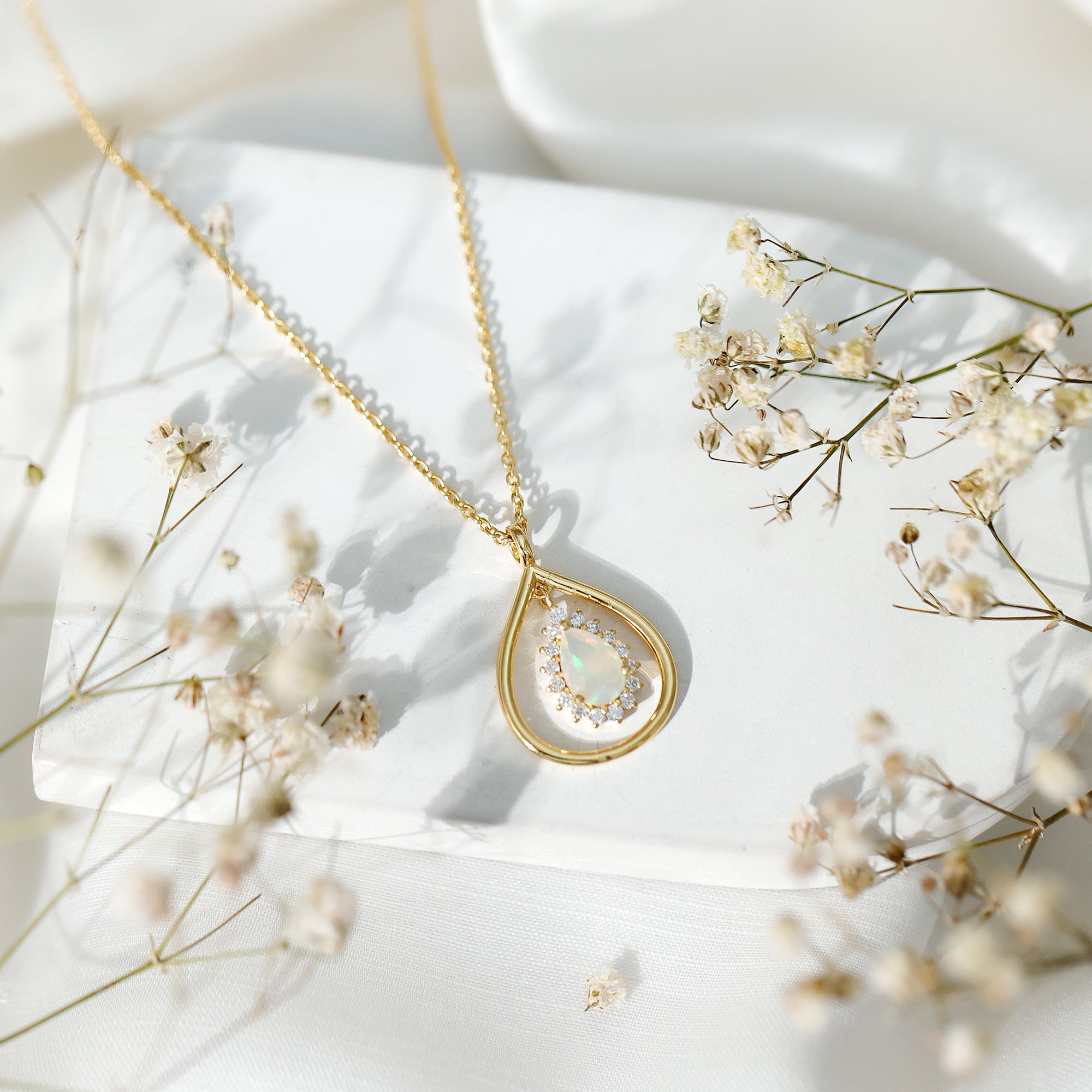 Soft, elegant, and full of meaning, this Ethiopian Opal Necklace is a piece that speaks straight to the heart. Handcrafted in 14k yellow gold plated silver, it features a stunning 5X8 MM pear-shaped Ethiopian Opal, known for its magical play of colors that shift beautifully with every movement. Set in safe prong setting, the opal is surrounded by a halo of sparkling round lab grown diamonds. Together, they sit within an open teardrop frame that hangs gracefully from a matching cable chain. The shape is elegant and timeless, giving the whole Teardrop Necklace a delicate, graceful look that is easy to wear every day or dress up for special moments. This Opal and Diamond Necklace is a beautiful way to celebrate anyone born in October, since Ethiopian Opal is the October birthstone. It makes a thoughtful birthday gift or a meaningful surprise for someone who loves jewelry with personality and charm. With its dreamy glow and subtle sparkle, it is perfect for marking personal milestones or simply bringing a little beauty into someone’s day. Whether you are buying it for yourself or gifting it to someone you love, this October Birthstone Necklace is the kind of piece that always feels special. It tells a story, holds emotions, and adds a soft, elegant touch to any outfit, making it a favorite jewelry piece.
