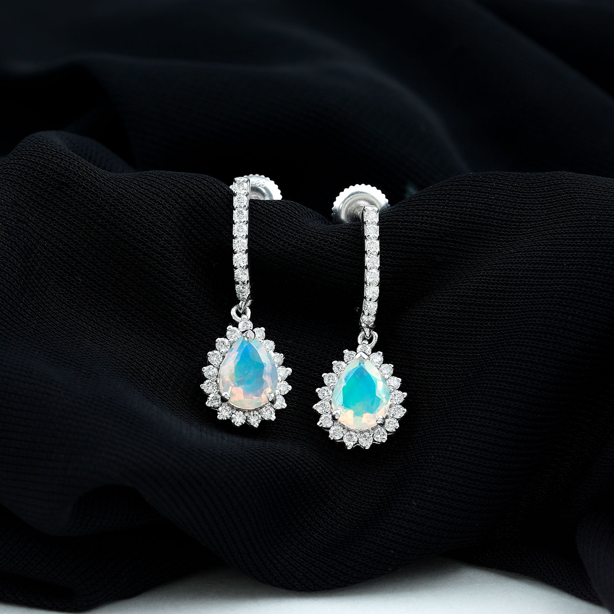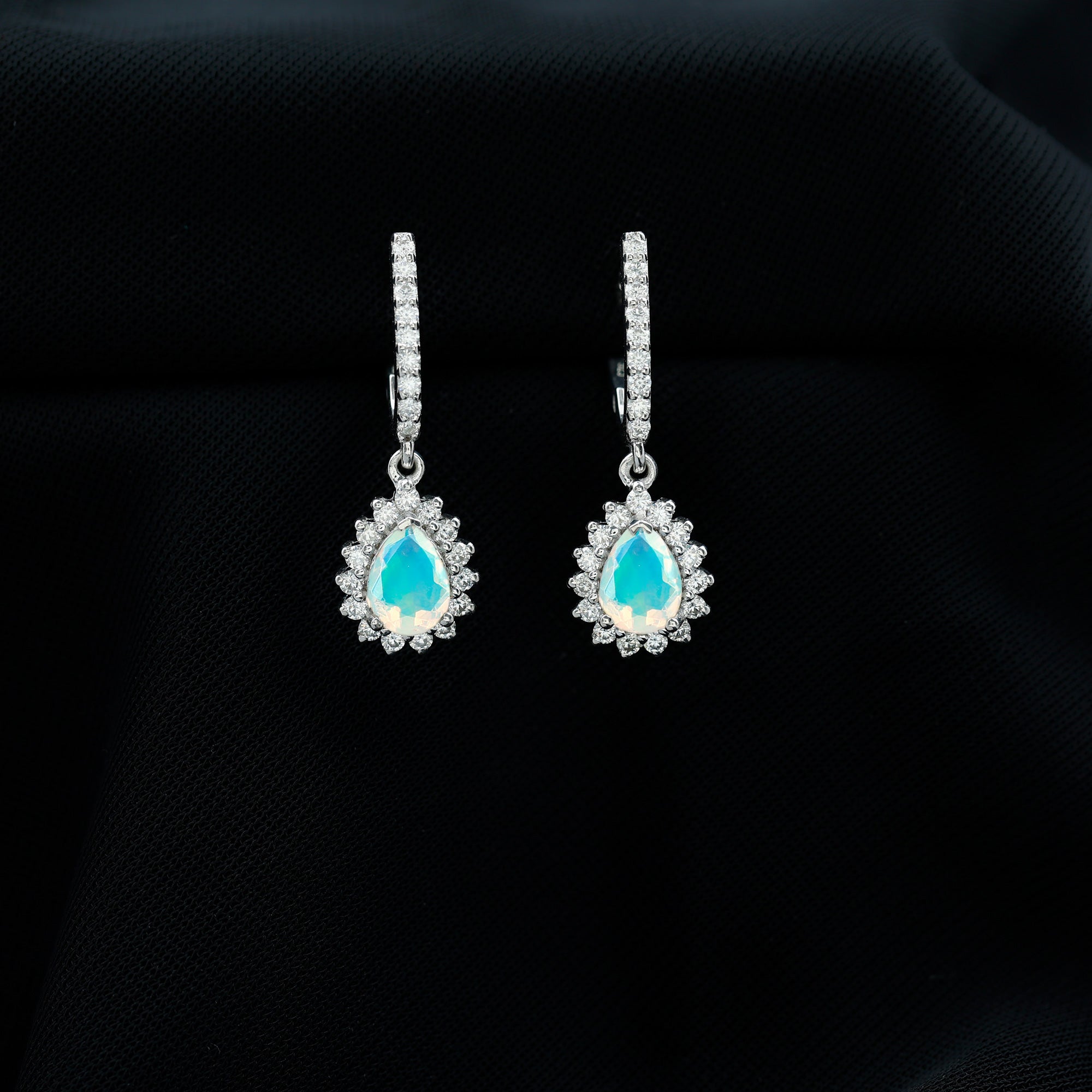 Certified Ethiopian Opal Pear Drop Earrings with Moissanite Halo