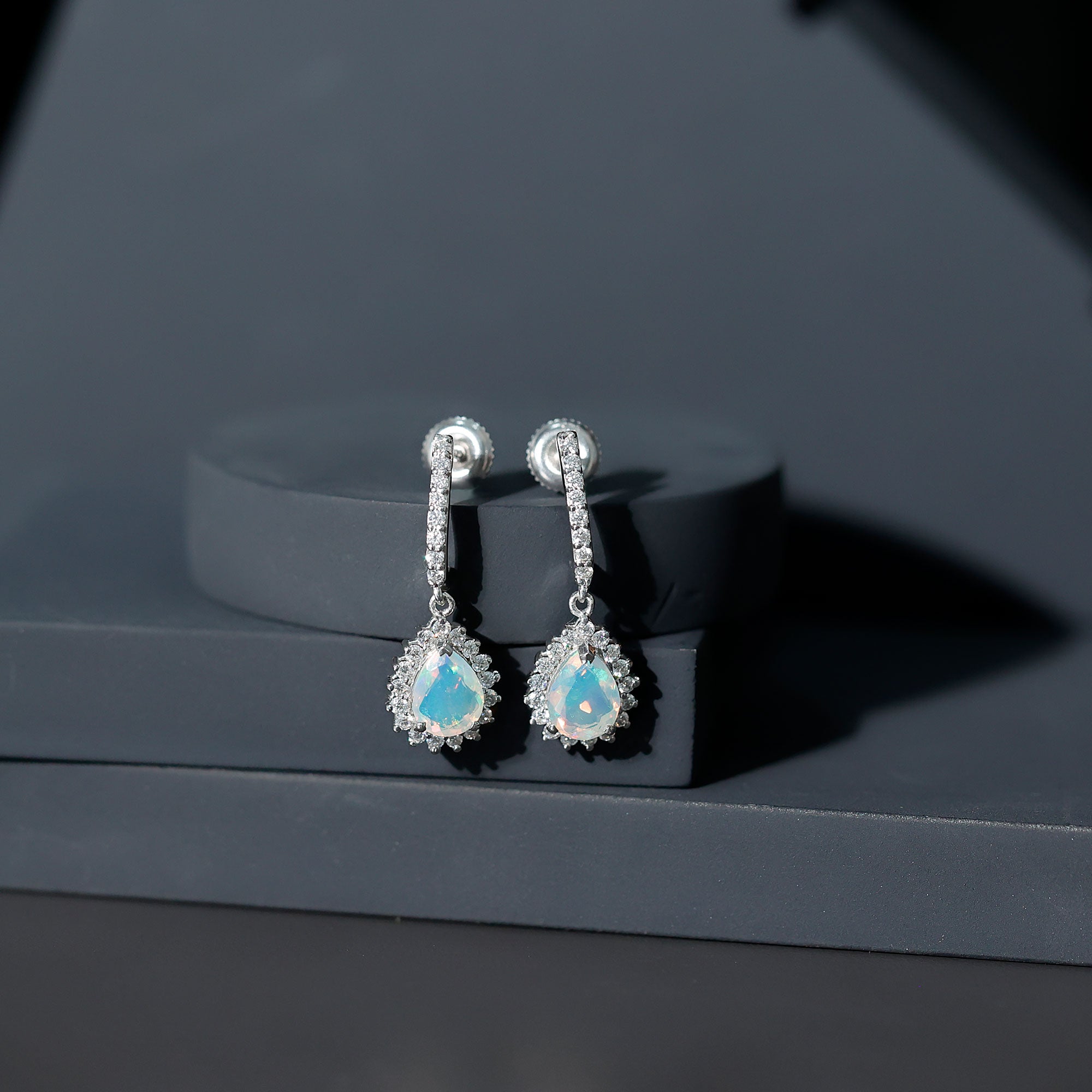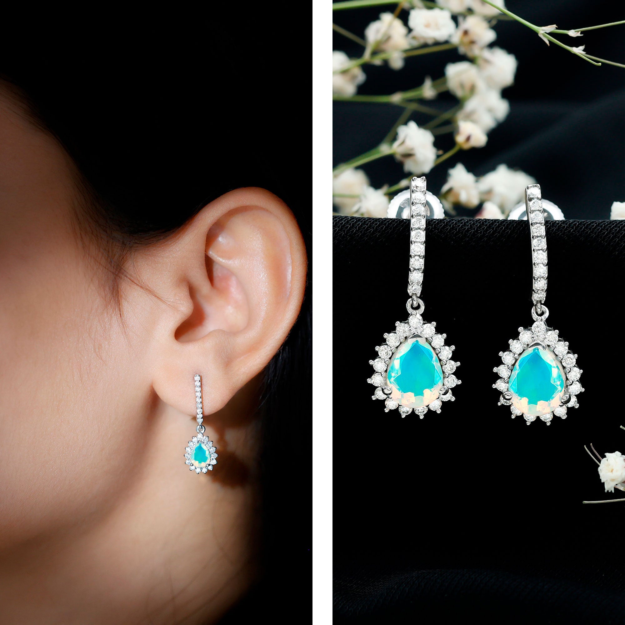 These classic Ethiopian Opal Drop Earrings are a perfect dazzler to complete the overall look. It features a 5X7 MM Ethiopian Opal delicately placed in Prong Setting encircled with the Halo of Round Shape Moissanite. These Teardrop Earrings reflect the classic shine of AAA Quality Ethiopian Opal that will light up the room. These Ethiopian Opal Earrings are the perfect choice for D-Day to complete your bridal look. Get yourself these Wedding Earrings that also depict love, passion, and hope. These earrings are crafted with 14K White Gold Plated Silver