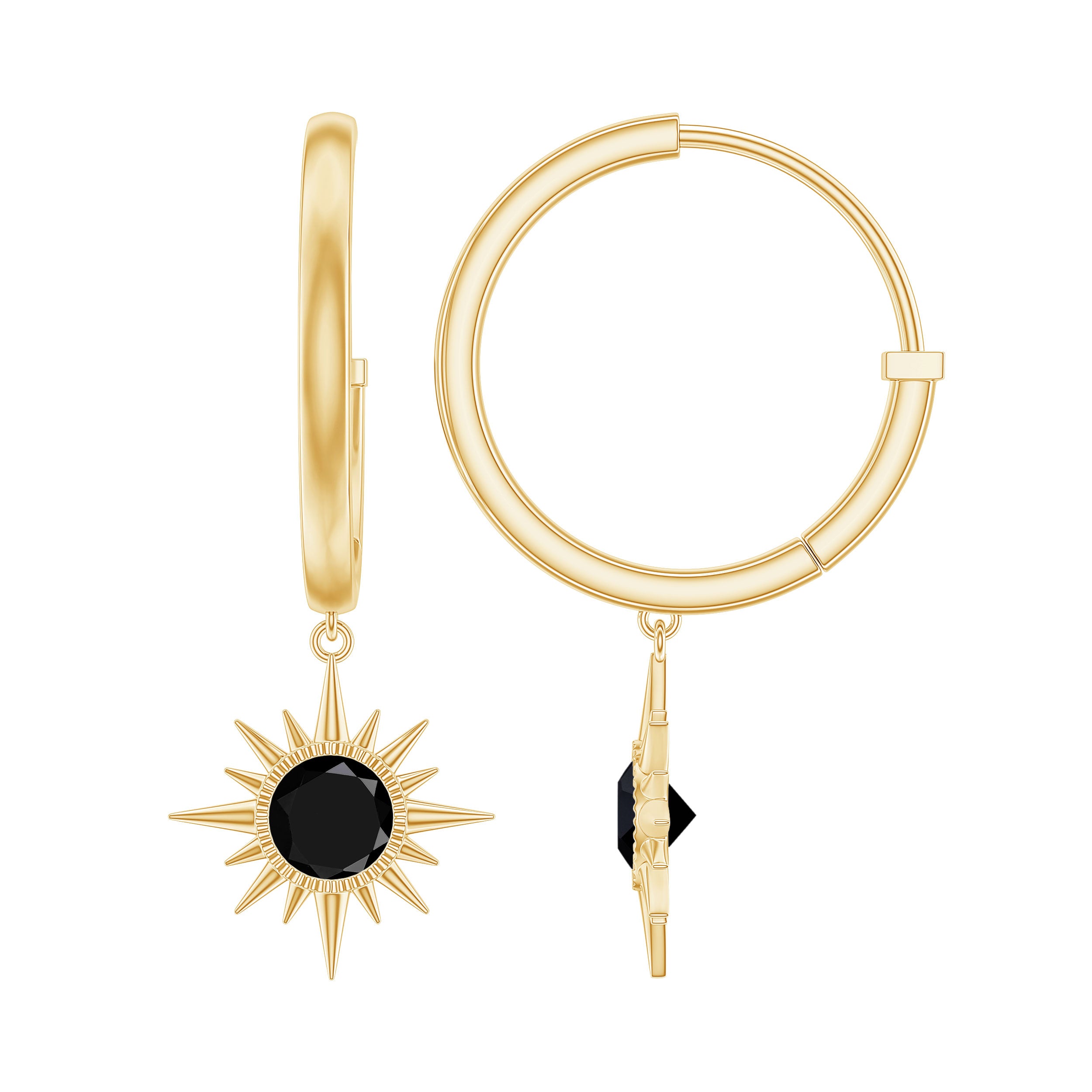 Radiating bold elegance and undeniable charm, these Sunburst Earrings are the perfect way to light up any occasion. The striking sunburst design features 4 mm Round Shape Black Diamond set in Bezel Setting, creating a captivating effect that catches the eye from every angle. The dark sparkle of the AAA Quality Black Diamond adds a touch of mystery and sophistication, while the hoop drop style brings a modern twist to a classic look. The Hinged Hoop Closure ensures a secure and comfortable fit, making these Hoop Drop Earrings as easy to wear as they are beautiful. Whether you are dressing up for a night out, adding some edge to a casual look or looking for a statement piece for a special event, these Black Diamond Earrings are the perfect choice. Their unique combination of boldness and elegance makes them versatile enough to pair with almost any outfit. Presented in an elegant jewelry box, these Black Diamond Hoop Earrings make a stunning gift for someone special or a fabulous treat for yourself.