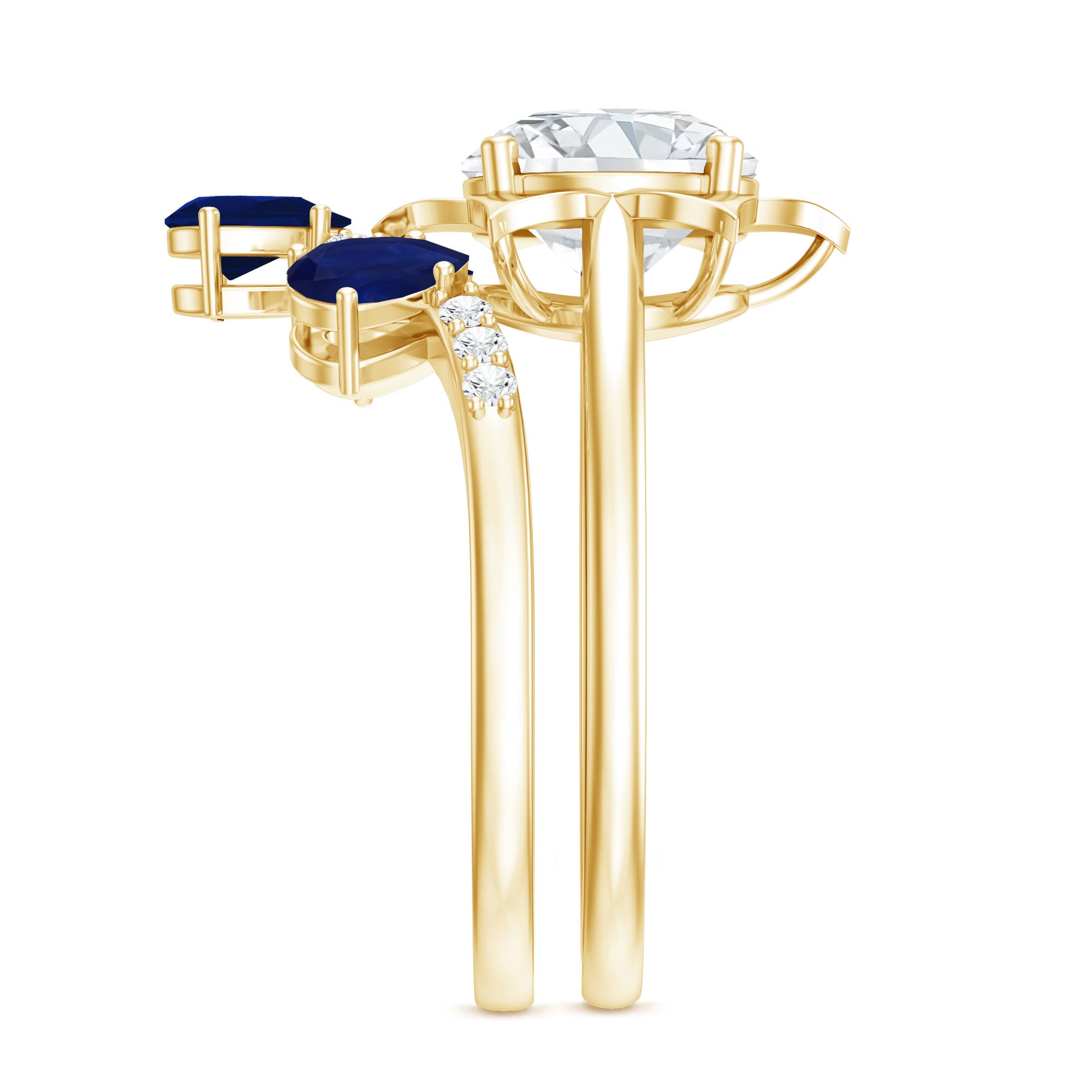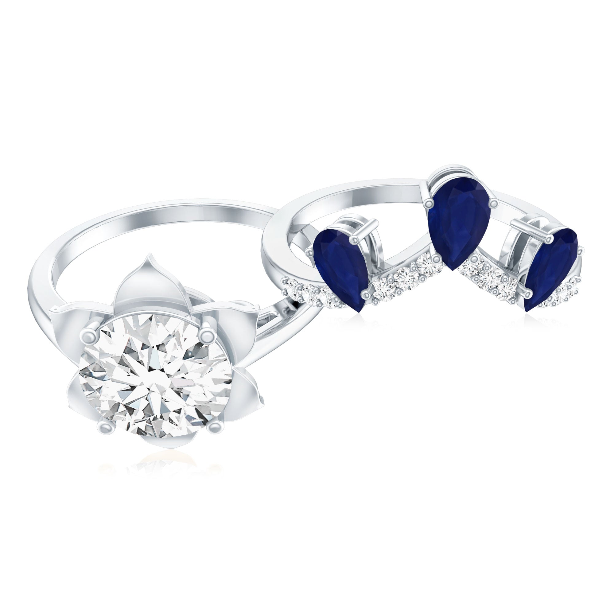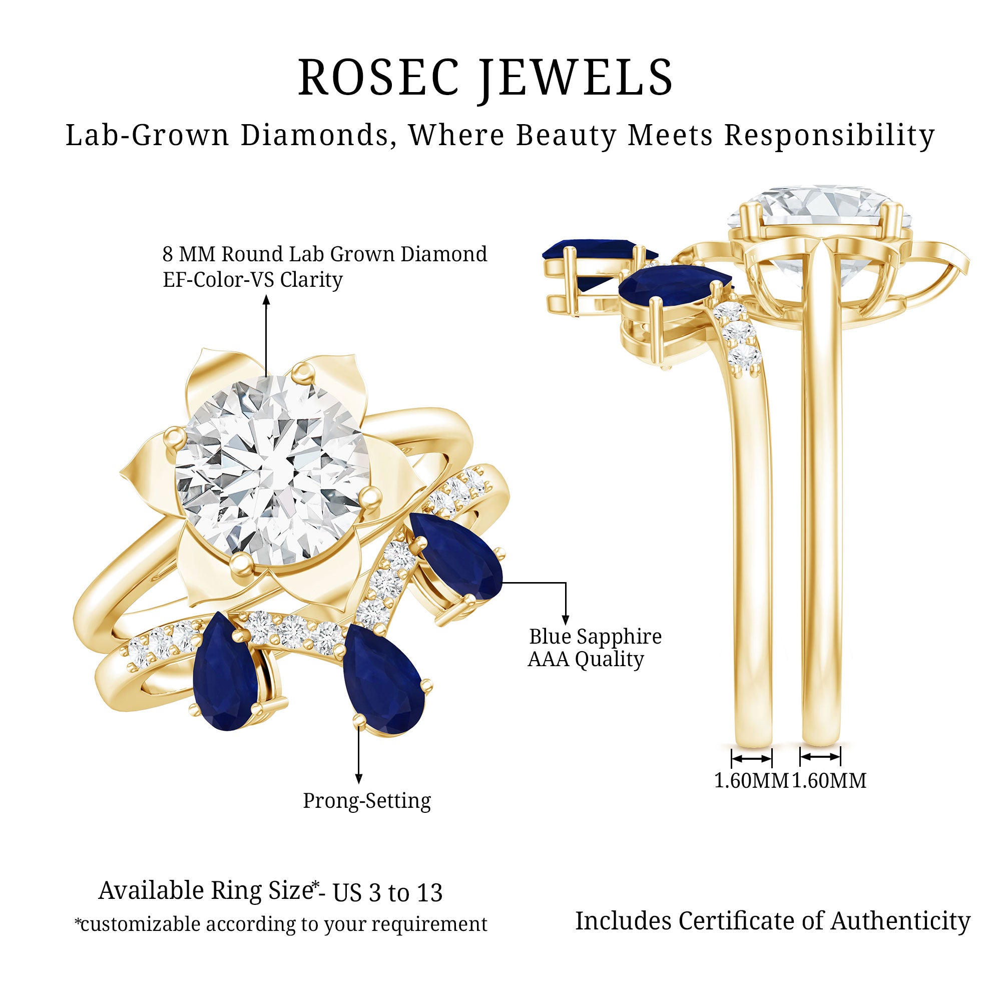 Inspired by natures beauty, this Diamond Flower Ring Set is a breathtaking reflection of love, growth, and timeless elegance. The engagement ring is embellished with an 8 MM round shaped synthetic diamond set in prong setting, where sculpted metal petals embrace the center stone. Complementing the Solitaire Ring is a gracefully curved wedding band adorned with shimmering round cut diamonds and pear-shaped blue sapphire. This Diamond Bridal Ring Set is perfect for nature lovers, you can wear it separately for an understated yet elegant look or stack it with the band for a layered style. Meticulously created by Rosec Jewels, this Engagement Wedding Ring Set blends modern innovation with classic beauty, ensuring a unique and ethically sourced symbol of your everlasting love.