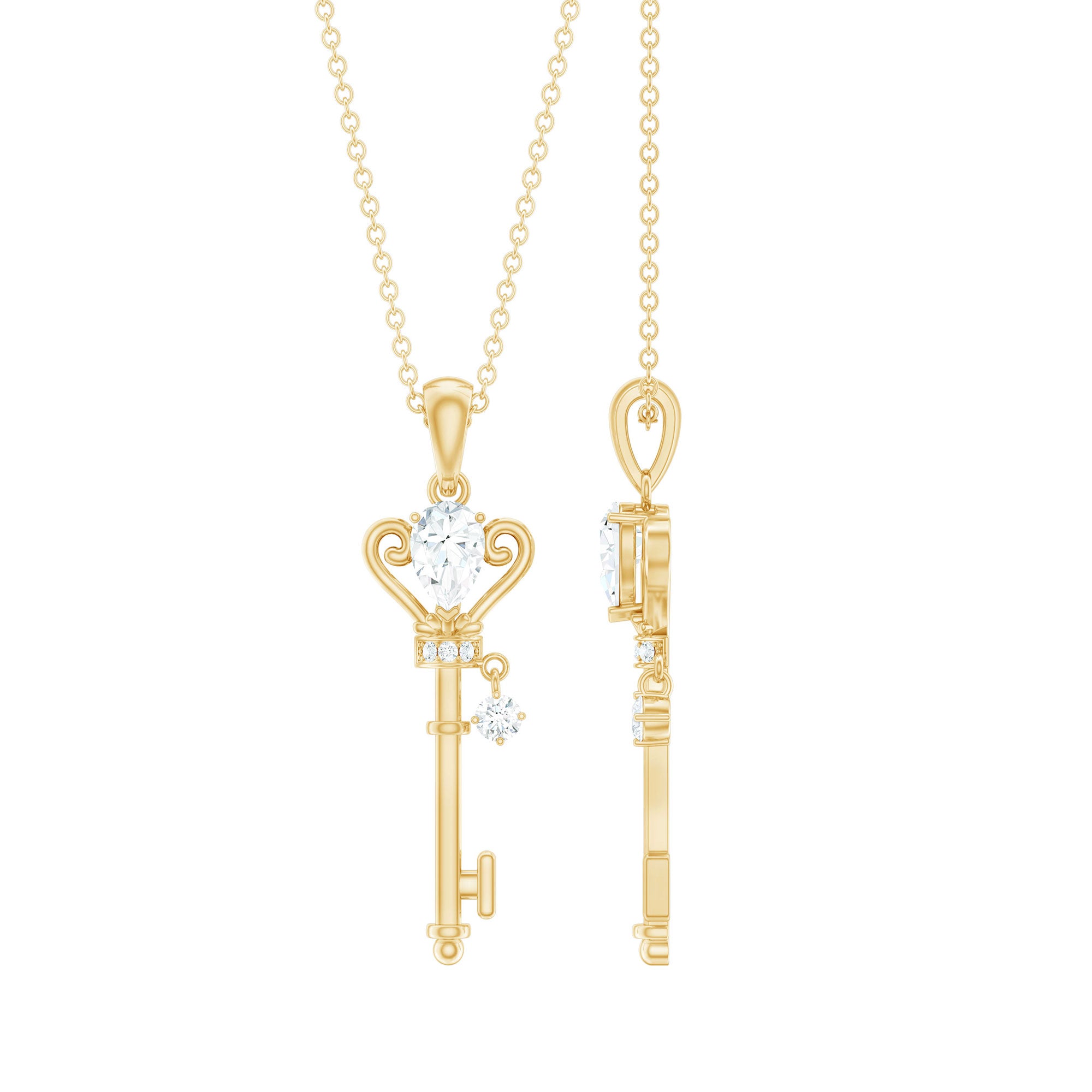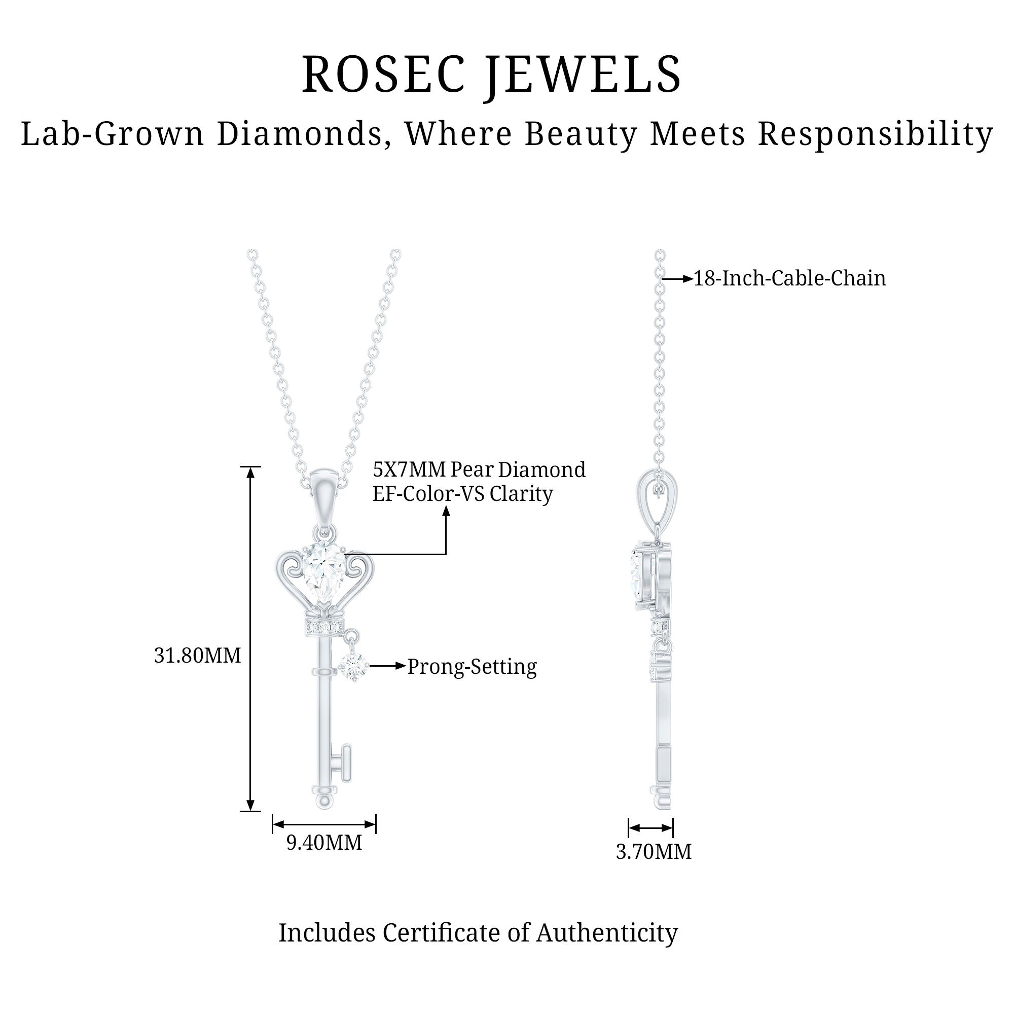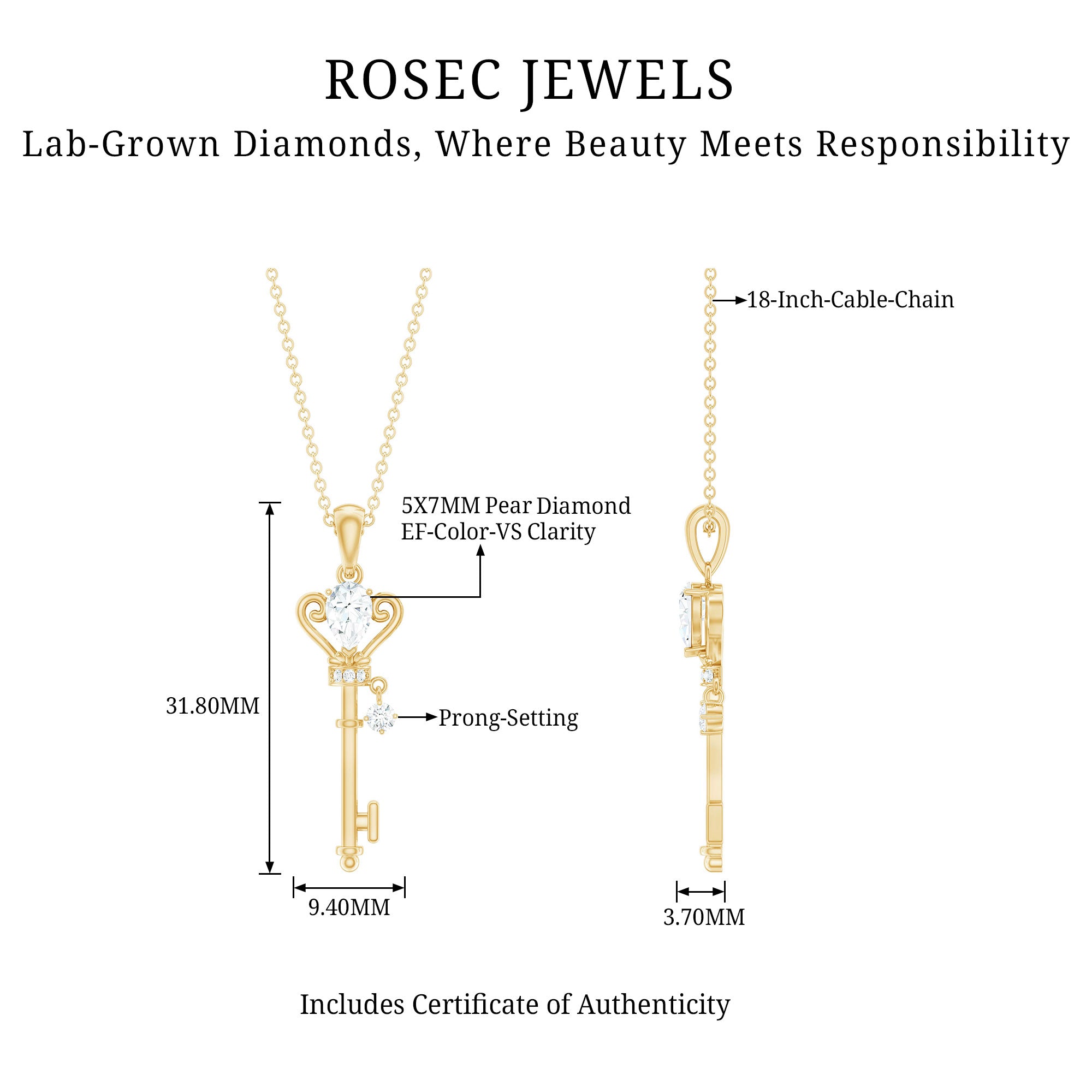 Unlock a Sweet relationship with this Key Pendant Necklace. This beautiful pendant features metal key embedded with the 5X7 MM Pear Shape Lab Grown Diamond as a center stone along with the Diamond charm. This Key Charm Pendant dangles with the help of an Accented Bail, adding more shine to the overall design. This Necklace with Key makes a wonderful gift for birthdays, anniversaries, Valentines Day, Christmas, New Year, holidays, Mothers Day, or any special celebration.