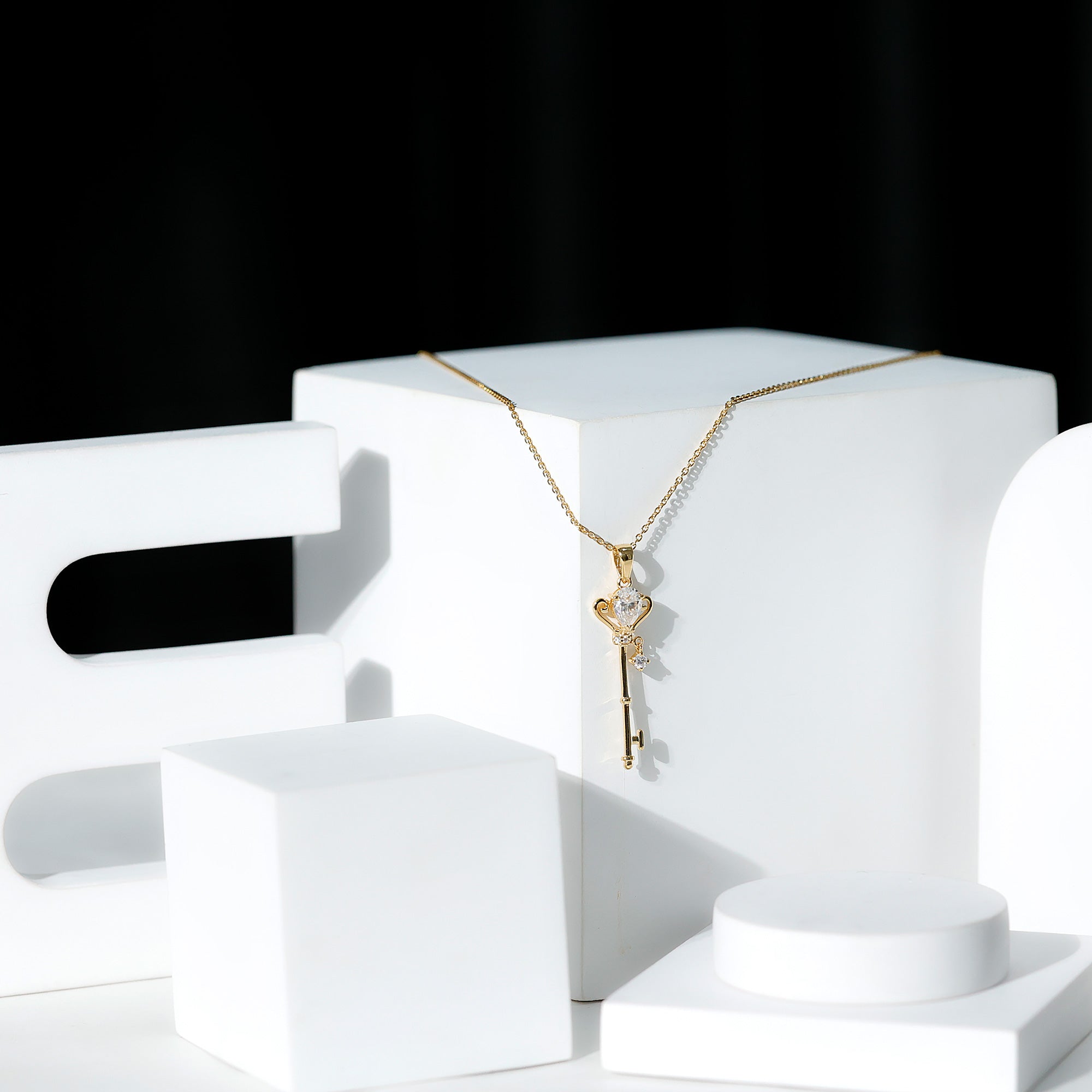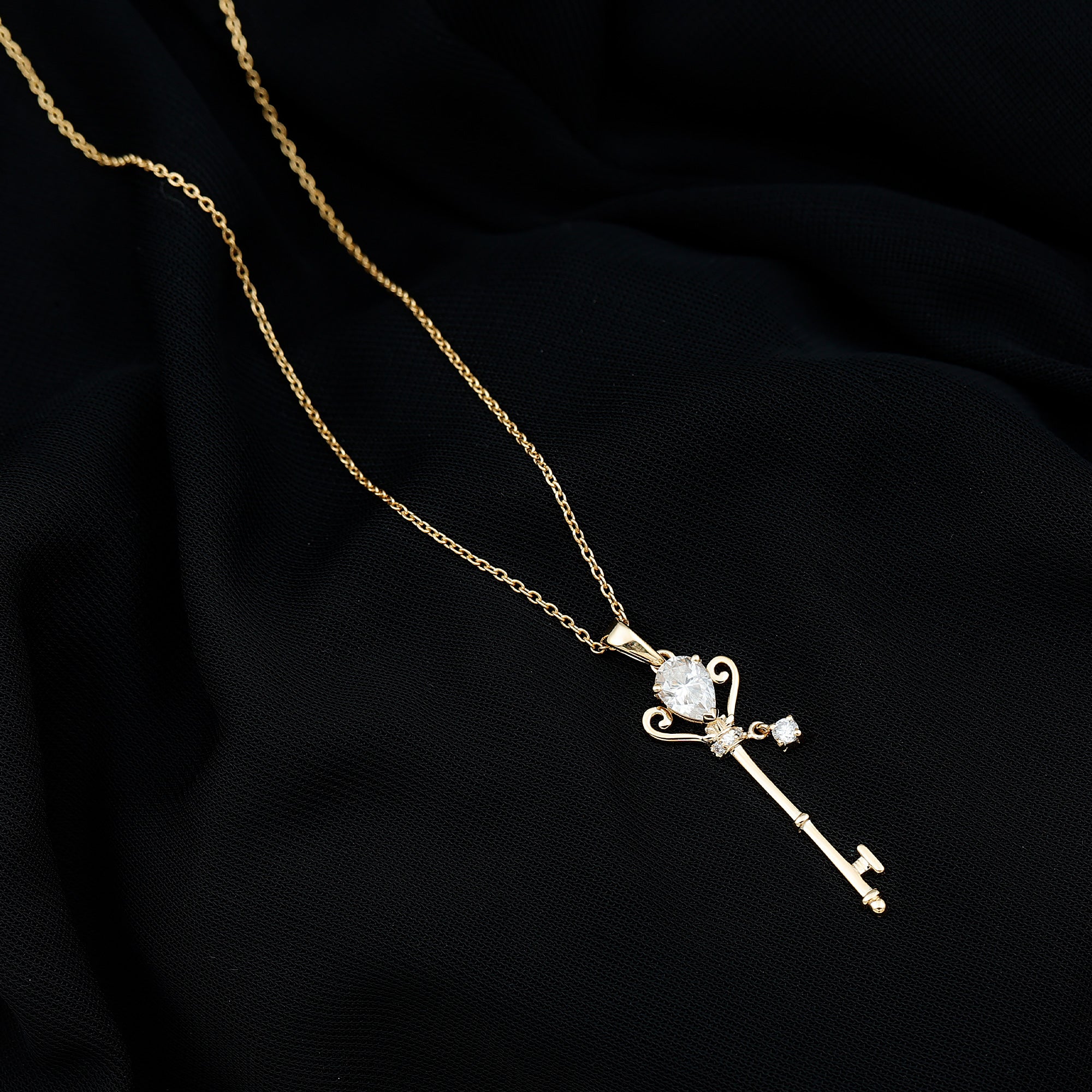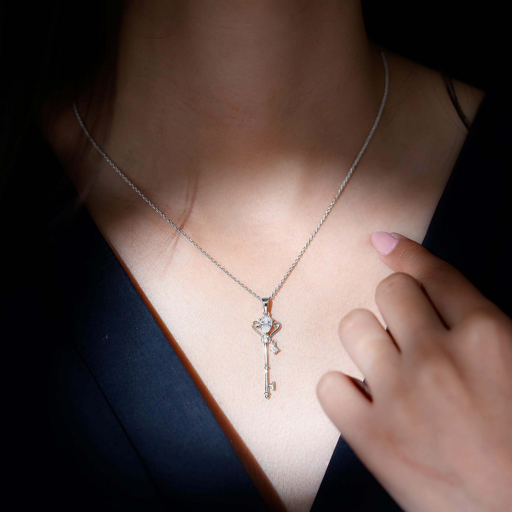 Unlock a Sweet relationship with this Key Pendant Necklace. This beautiful pendant features metal key embedded with the 5X7 MM Pear Shape Lab Grown Diamond as a center stone along with the Diamond charm. This Key Charm Pendant dangles with the help of an Accented Bail, adding more shine to the overall design. This Necklace with Key makes a wonderful gift for birthdays, anniversaries, Valentines Day, Christmas, New Year, holidays, Mothers Day, or any special celebration.