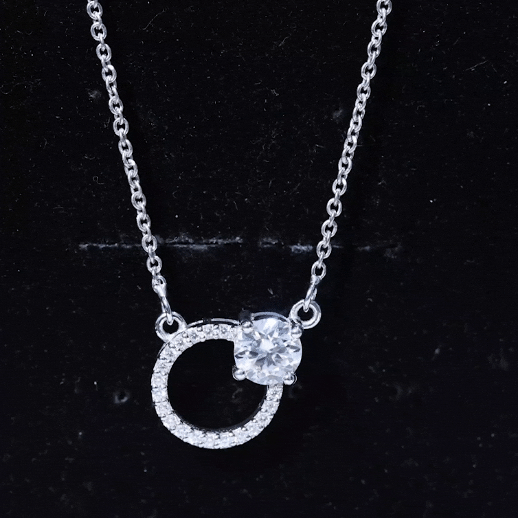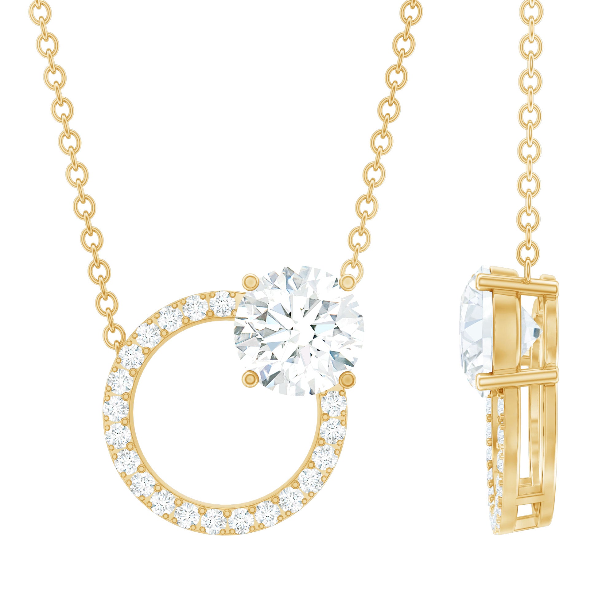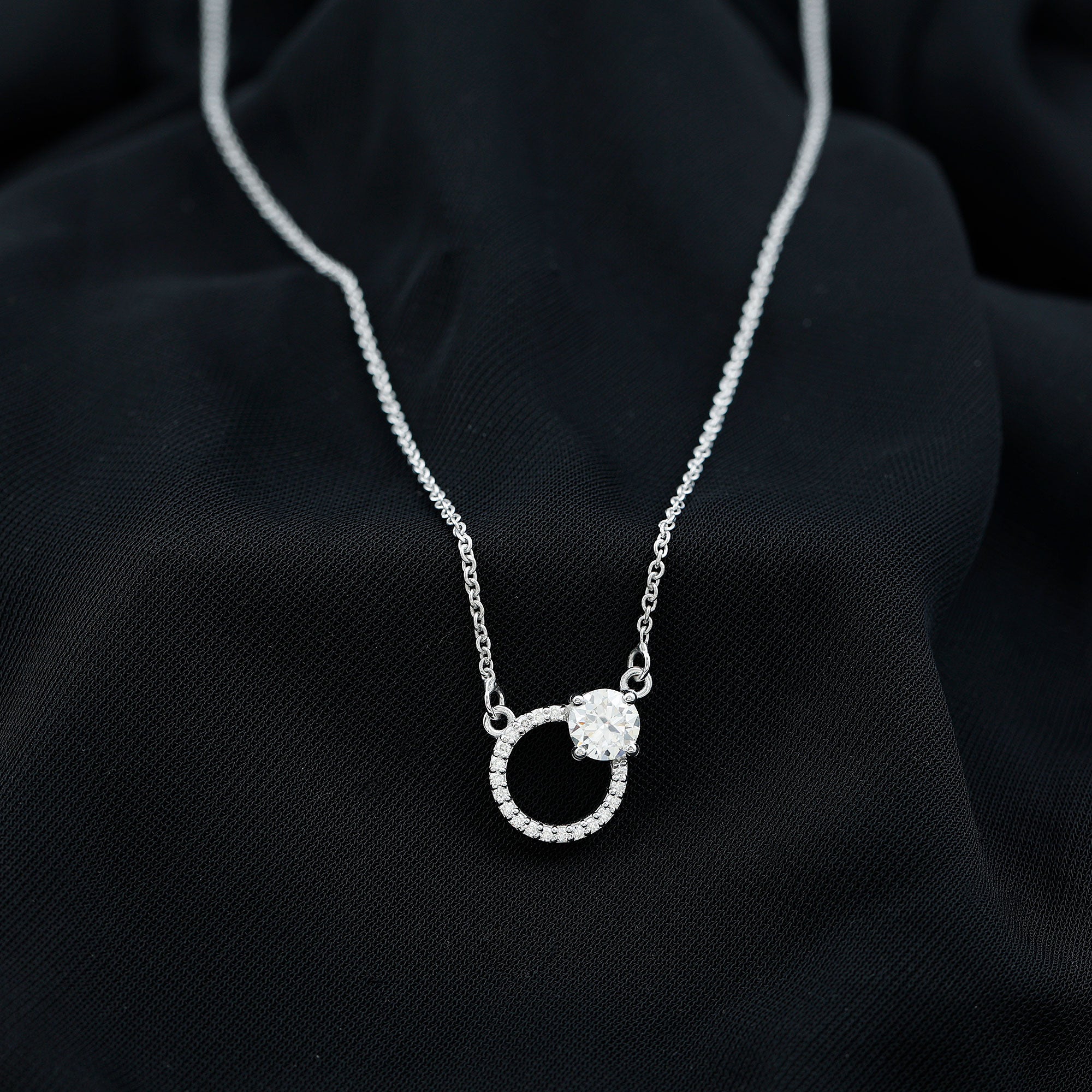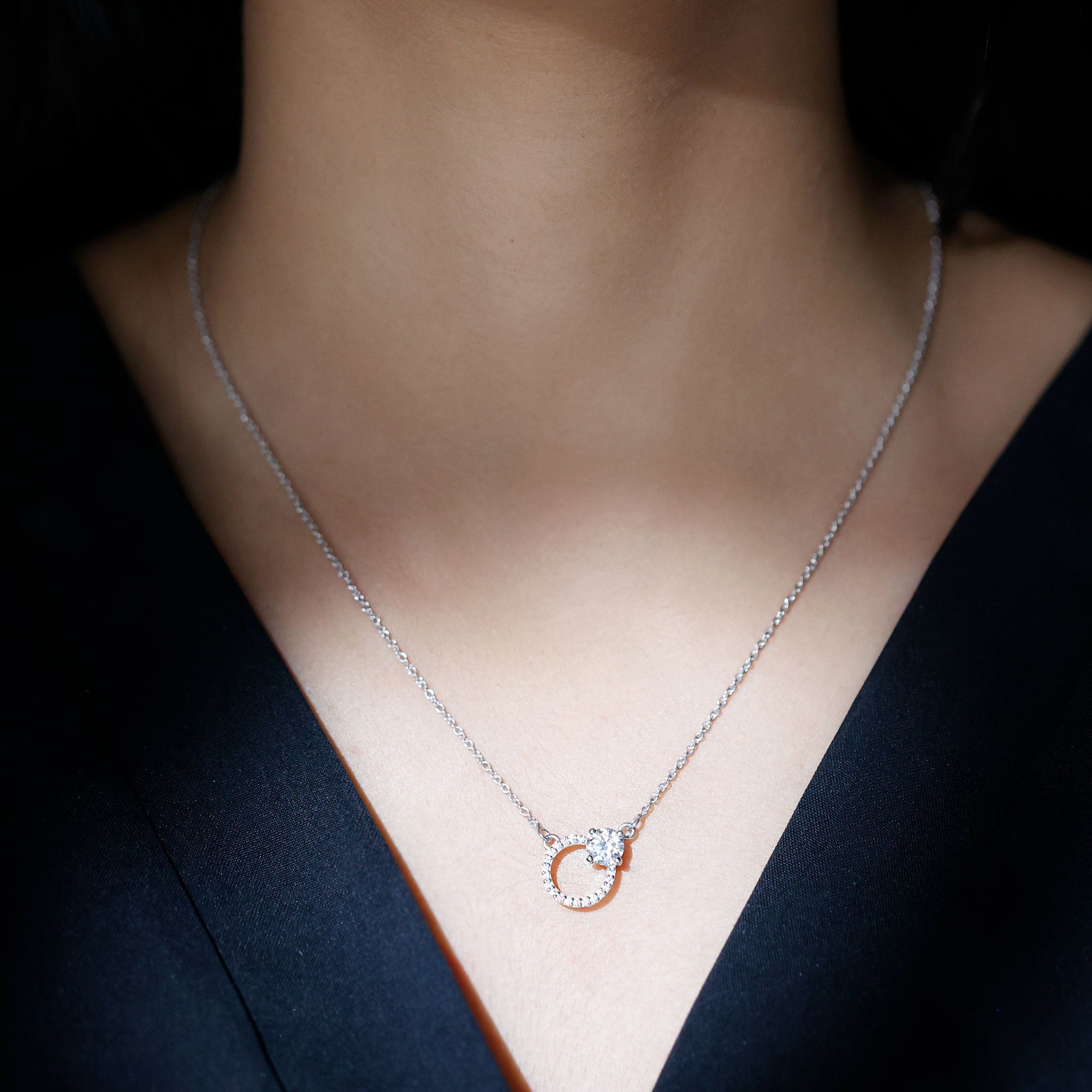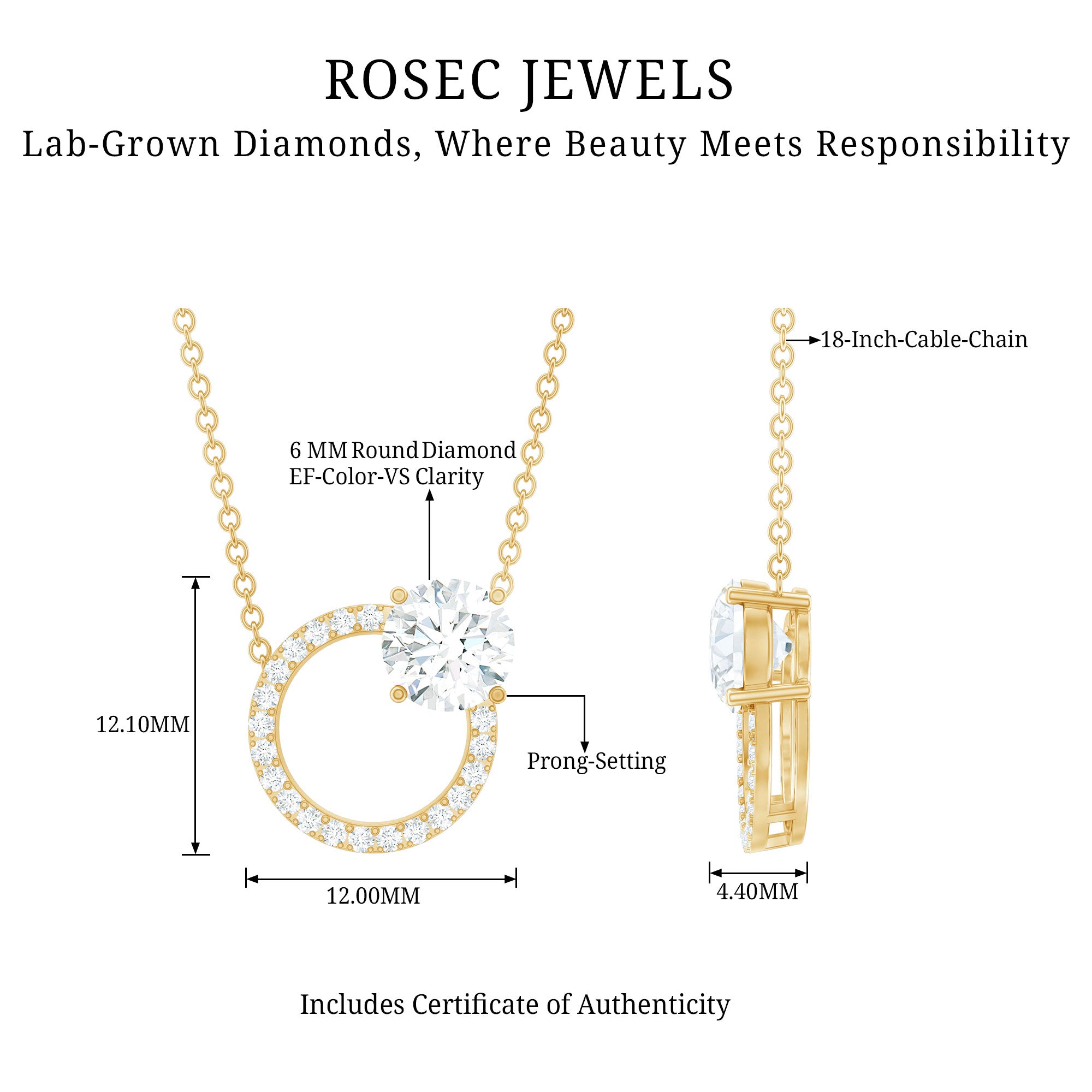 This lightweight and sparkly Open Circle Necklace with sustainably grown Diamonds is a lovely symbol of eternity. It features a 6 MM round cut lab made diamond as a main stone set in secure prong setting with an open circle studded with dainty diamonds. Designed with care and attention to detail, this Circular Necklace offers both style and comfort, making it a perfect piece of jewelry for all day long. This Diamond Necklace is incredibly versatile and ideal for both casual and formal occasions. For making a statement, pair it with a matching pair of earrings and bracelet - also available on our website. Present it to your girlfriend or wife and let this 1 ct Diamond Necklace speak volumes about your enduring affection. Get ready to shine like never before.