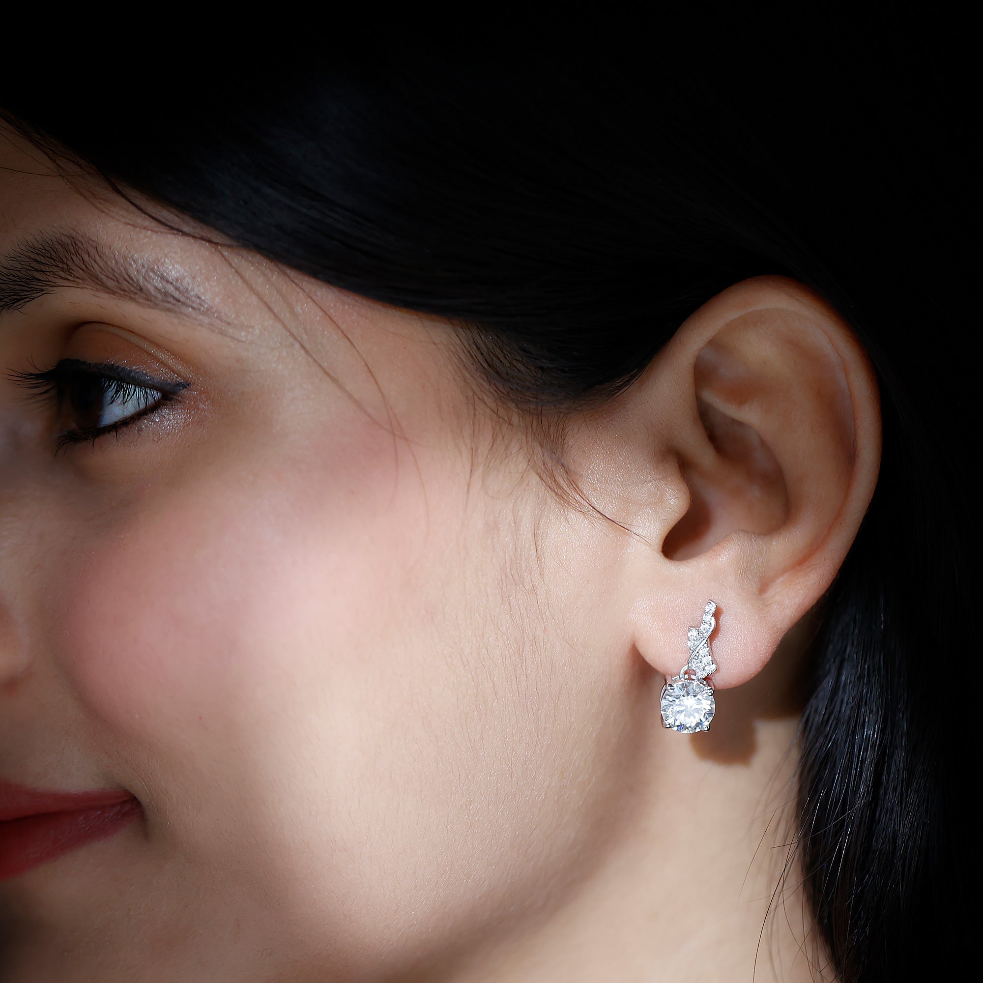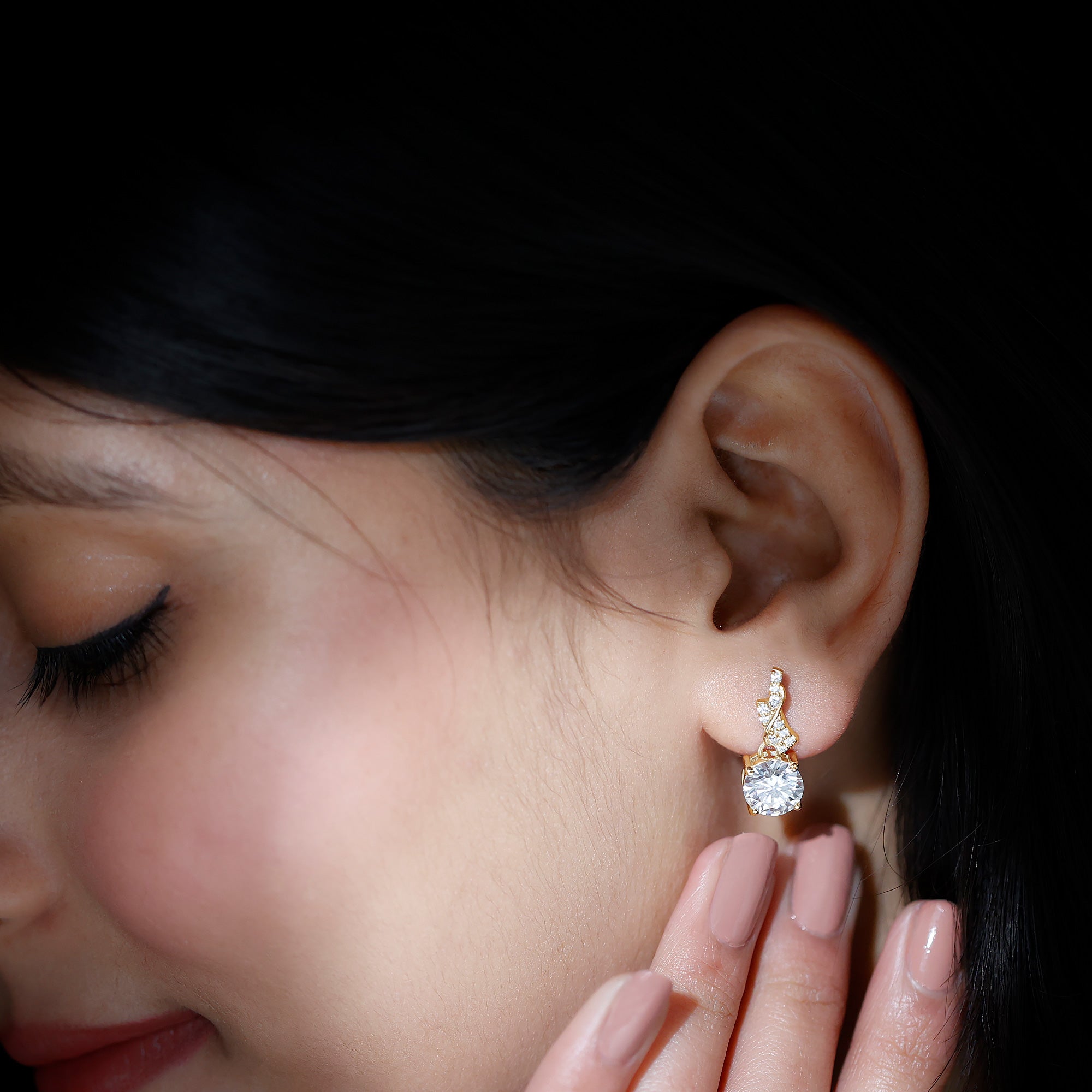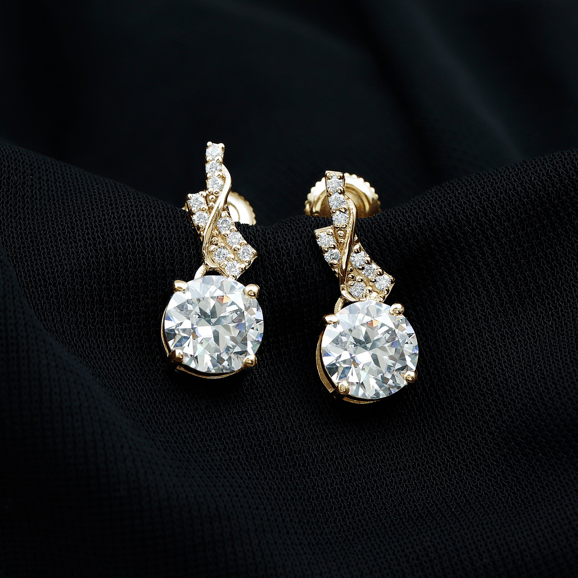Make a bold statement of love and elegance with these Round Diamond Earrings. An 8 MM round cut diamond (lab-grown) is set in safe prong setting and above this stone are two curved bars adorned with smaller round cut gemstones with twisted metal detail. These Diamond Drop Earrings will make you feel like you are on top of the world, turning heads and catching compliments wherever you go. These Solitaire Earrings make a perfect Valentines Day gift for girlfriend, 1st anniversary gift for wife, a birthday gift for her, and a graduation gift for daughter. Also, they come with a screw back closure, so she doesnt have to worry about them slipping off, providing comfort and security.