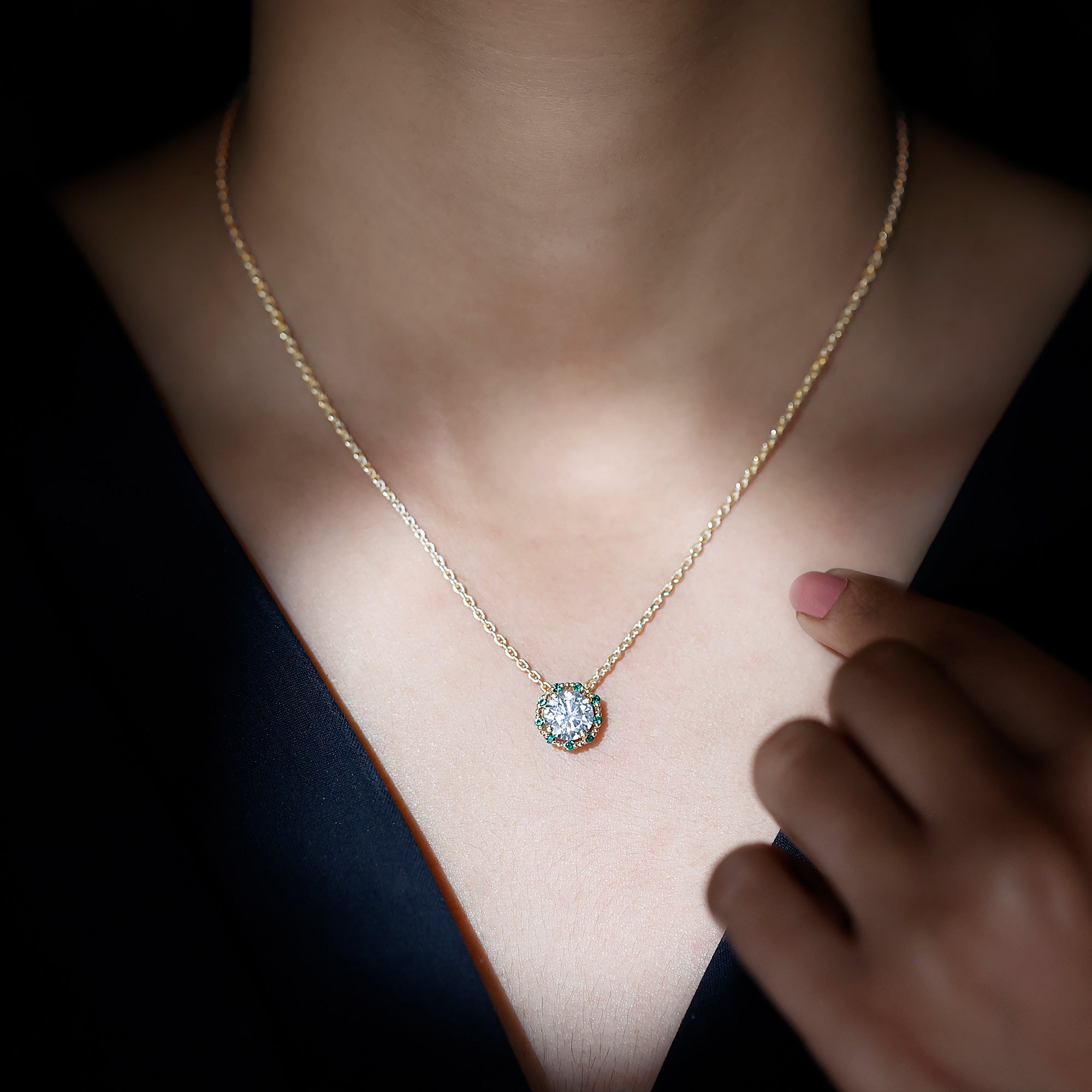 Introducing this stunning Diamond Pendant Necklace, a beautiful combination of classic elegance and modern appeal. Adorned with an 8 MM round cut diamond of EF-VS quality set in the center in prong setting, encircled by vintage inspired beadwork and deep green emerald gemstones. This hidden bail gives this 2 CT Diamond Necklace a floating effect without any distraction and makes it a versatile piece of jewelry for casual and formal outfits. This Halo Pendant is a thoughtful and affordable present for your loved one. Made with ethically sourced, lab grown diamonds, it offers the luxury of fine jewelry while being environmentally friendly.