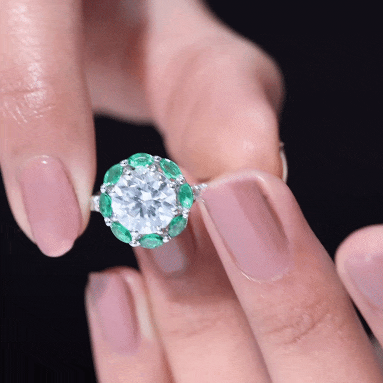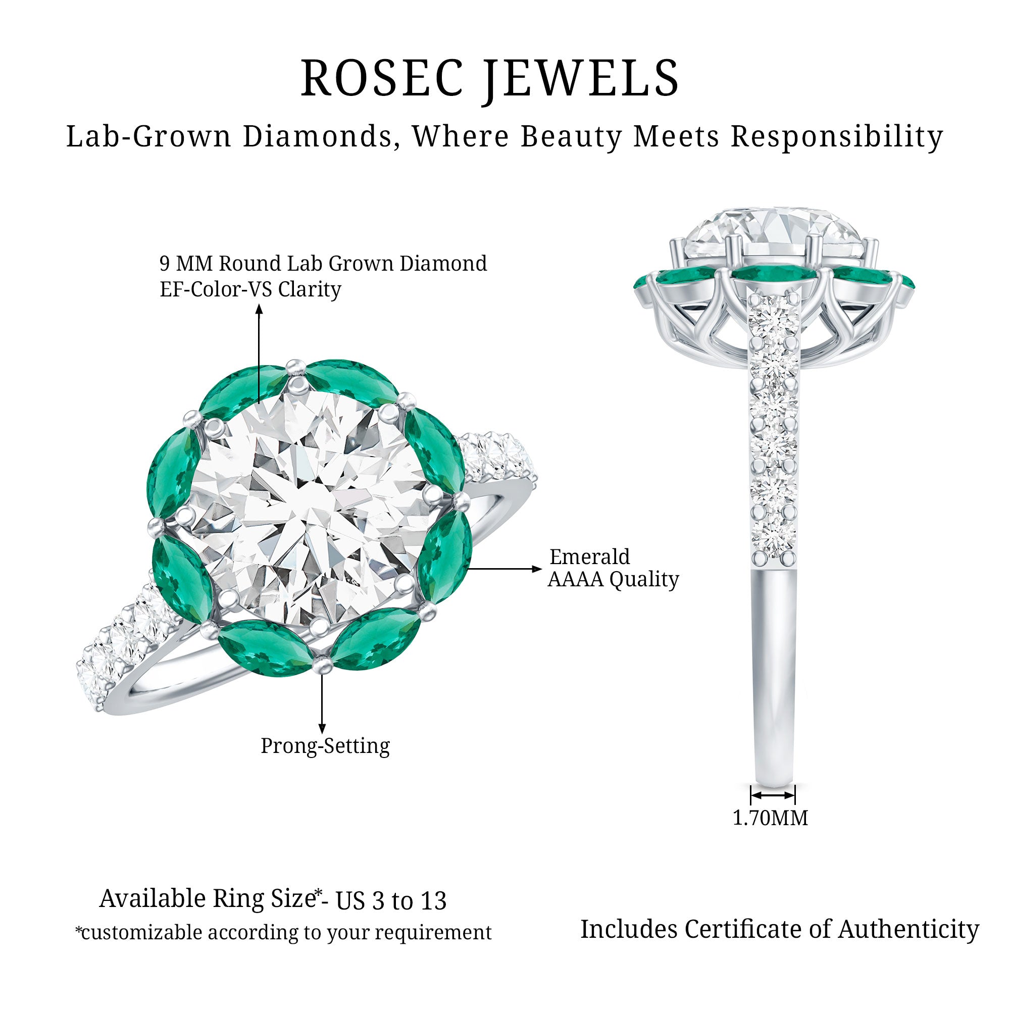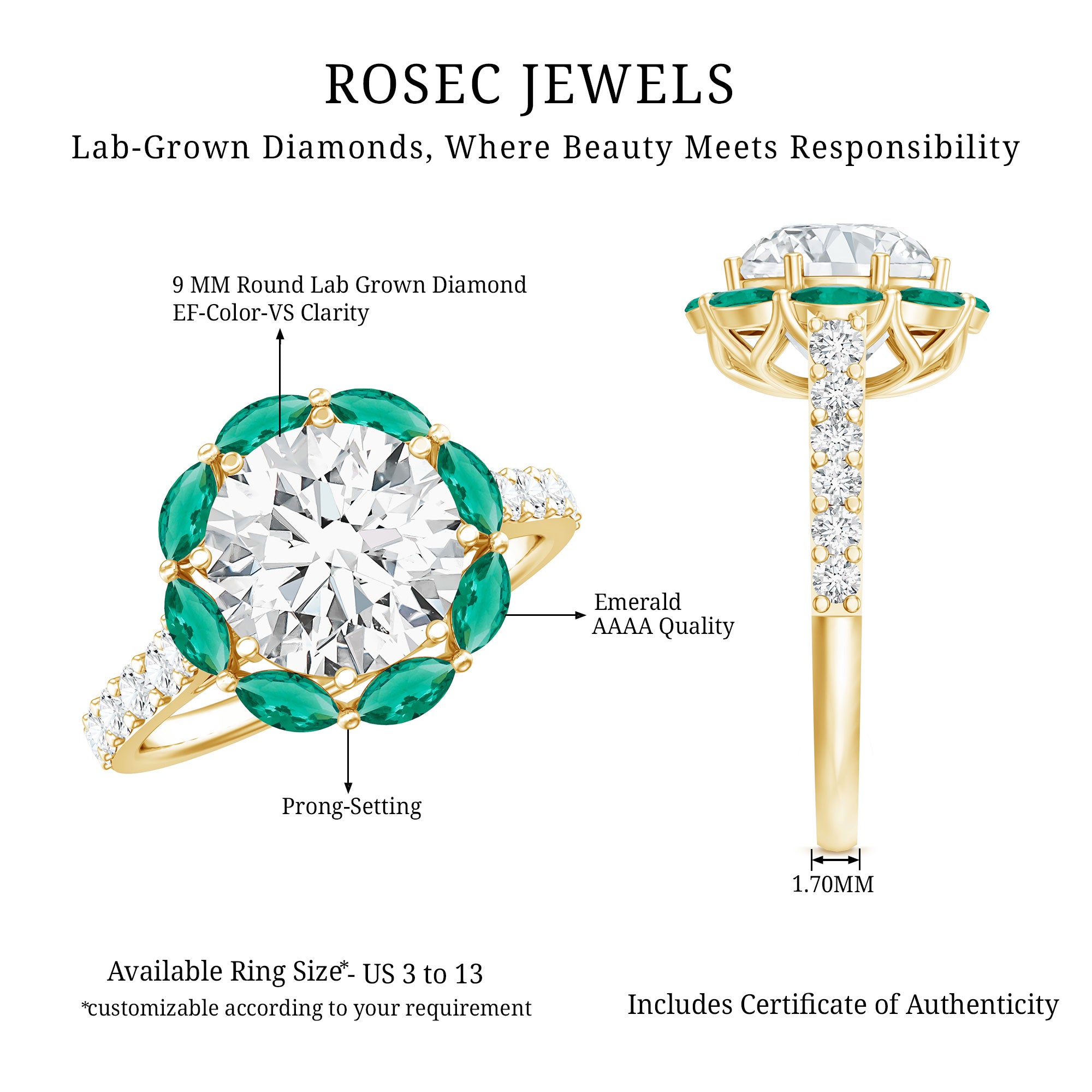 Why settle for an ordinary Halo Diamond Ring when you can have this masterpiece, full of contrast and modern charm - at its center sits a 9 MM round shaped EF-VS quality diamond (lab grown) held in secure 8-prong setting. Highlighting the center stone is a classic halo, curated with marquise shaped lab made emerald stones and diamond encrusted band, creating a contrast that is sure to catch everyones eye. What makes this Diamond Cocktail Ring unique is its versatility - whether you are looking for an Engagement Ring that stands out, a Proposal Ring to pop the question in style, or just a present for your lady love to celebrate your milestones, this piece is the perfect choice. Also, a diamond is an April birthstone, symbolizing everlasting love, strength, and wealth, making this Round Engagement Ring a meaningful and thoughtful accessory in your jewelry collection.