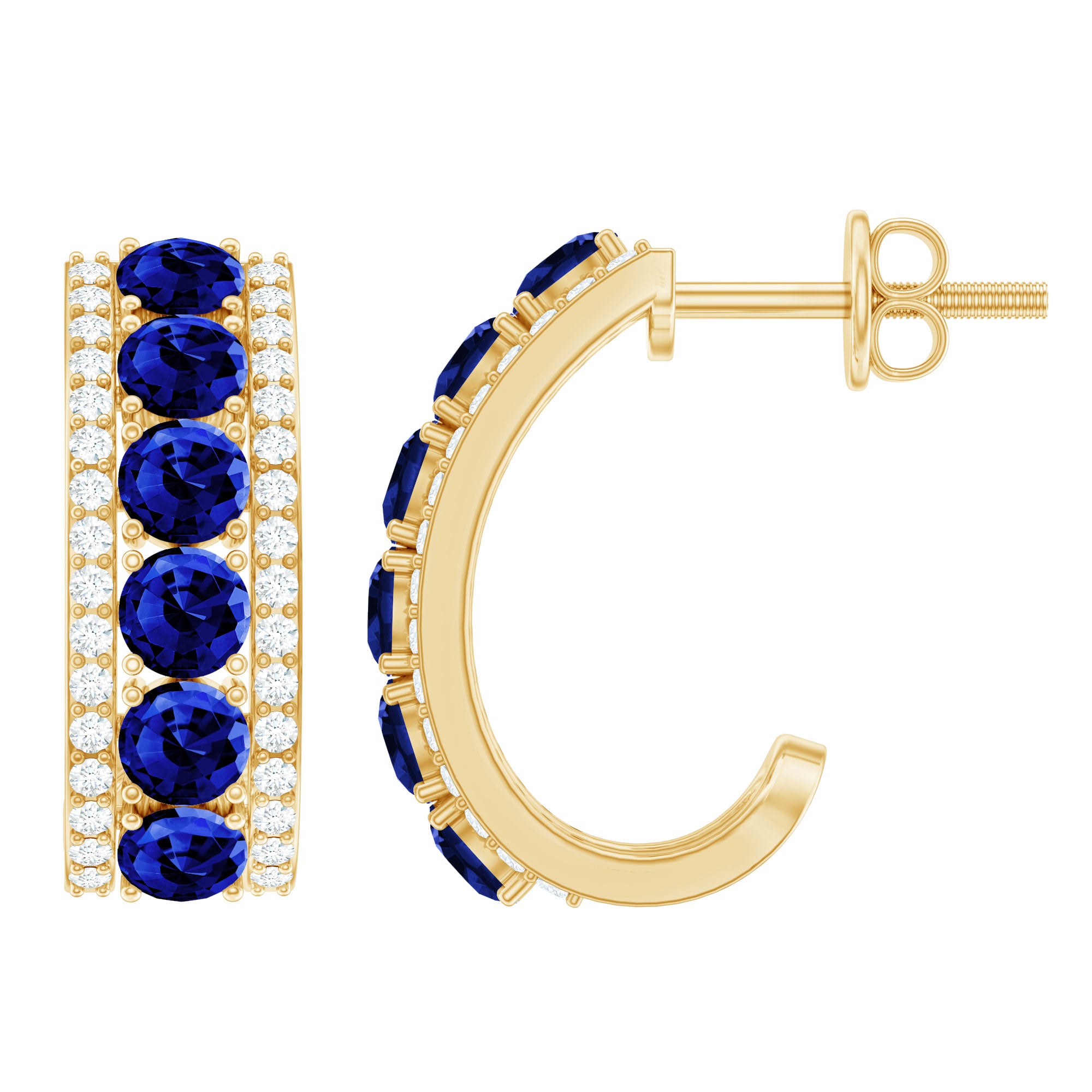 Bright blue color has a way of making any jewelry piece feel a little more royal, and these Lab Grown Blue Sapphire Earrings bring that feeling to life with every wear. These J Hoop Earrings feature a curve that hugs the ear in a stylish way. Along the center of each hoop sits a row of round lab created blue sapphires, held by prongs. On each side of the sapphires, tiny sparkling moissanite stones add a gentle shine, giving the Sapphire Hoop Earrings a balanced and elegant look. The J-shaped hoop design brings a modern twist to a classic style. These Sapphire and Moissanite Earrings add color to everyday outfits and bring a graceful touch to dressy looks. A secure screw-back closure keeps the earrings in place, making them comfortable for all-day wear. They stay steady on the ear and feel light, so you can enjoy them from morning to night without any discomfort. These Half Hoop Earrings also make a thoughtful gift for birthdays, anniversaries, or celebrations that call for something meaningful. You can wear them alone as a standout piece or layer them with other favorites.