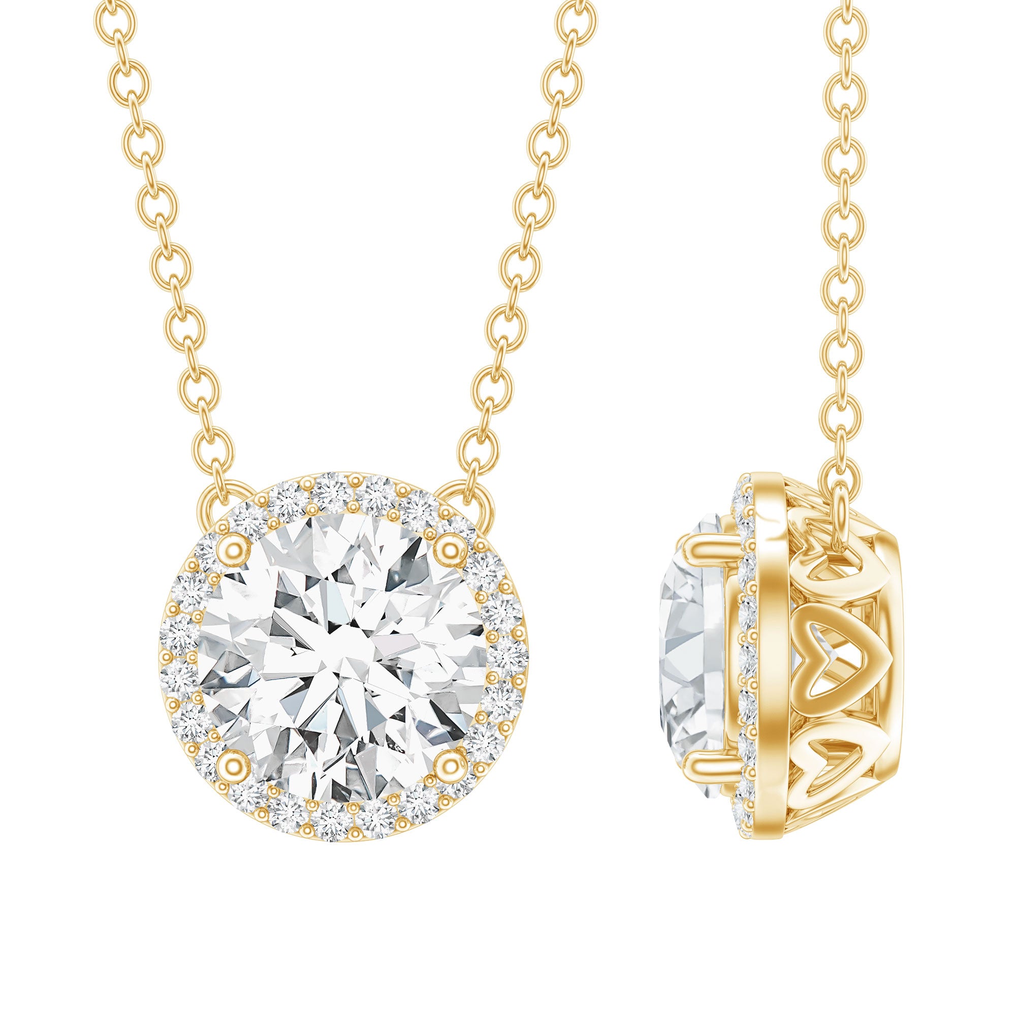This stunning Halo Necklace is timelessly beautiful, featuring a dazzling 7 MM round-shaped lab-grown diamond at its center, encircled by a halo of shimmering white gemstones in prong setting. The Lab Grown Diamond Necklace hangs gracefully from an 18-inch cable chain, secured with a lobster clasp for adjustable length, ensuring a comfortable and secure fit, making it ideal for all-day wear. Not only does this Round Diamond Necklace radiate luxury, but it also represents a thoughtful choice, as it is handcrafted with lab-made diamonds, making it both eco-friendly and budget-friendly. Furthermore, this Timeless Necklace comes in a range of metal color options, allowing you to select the one that best matches your personal style, creating a truly customized piece. If you seek something unique, timeless, and radiant, this pendant is the perfect way to celebrate your love. Beautifully packaged in a lovely jewelry box, this 1 Carat Diamond Necklace (Lab Diamond) is ready to be cherished the moment it is opened. From romantic dinners to special occasions, this Halo Diamond Necklace serves as a gentle reminder that you deserve to shine brightly.