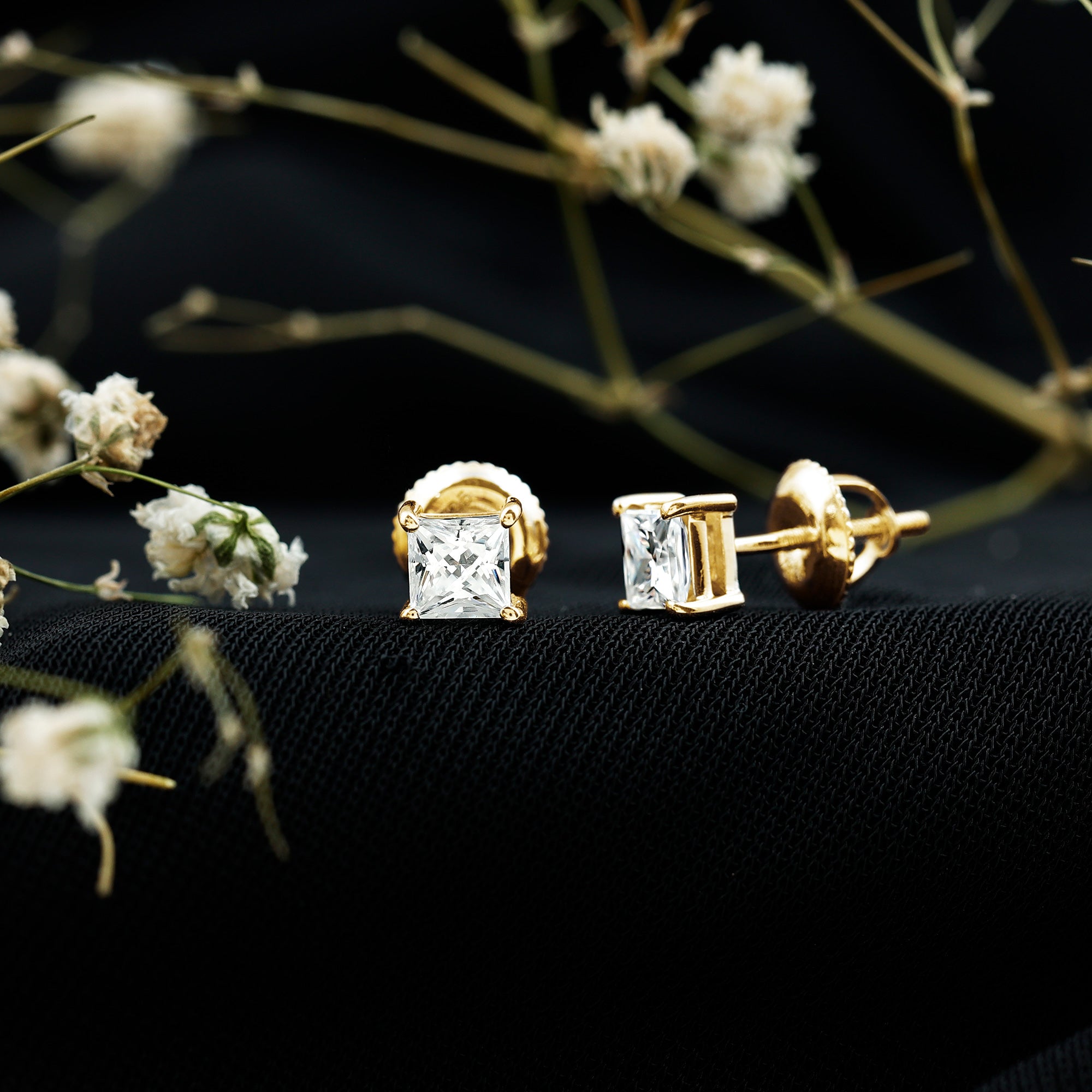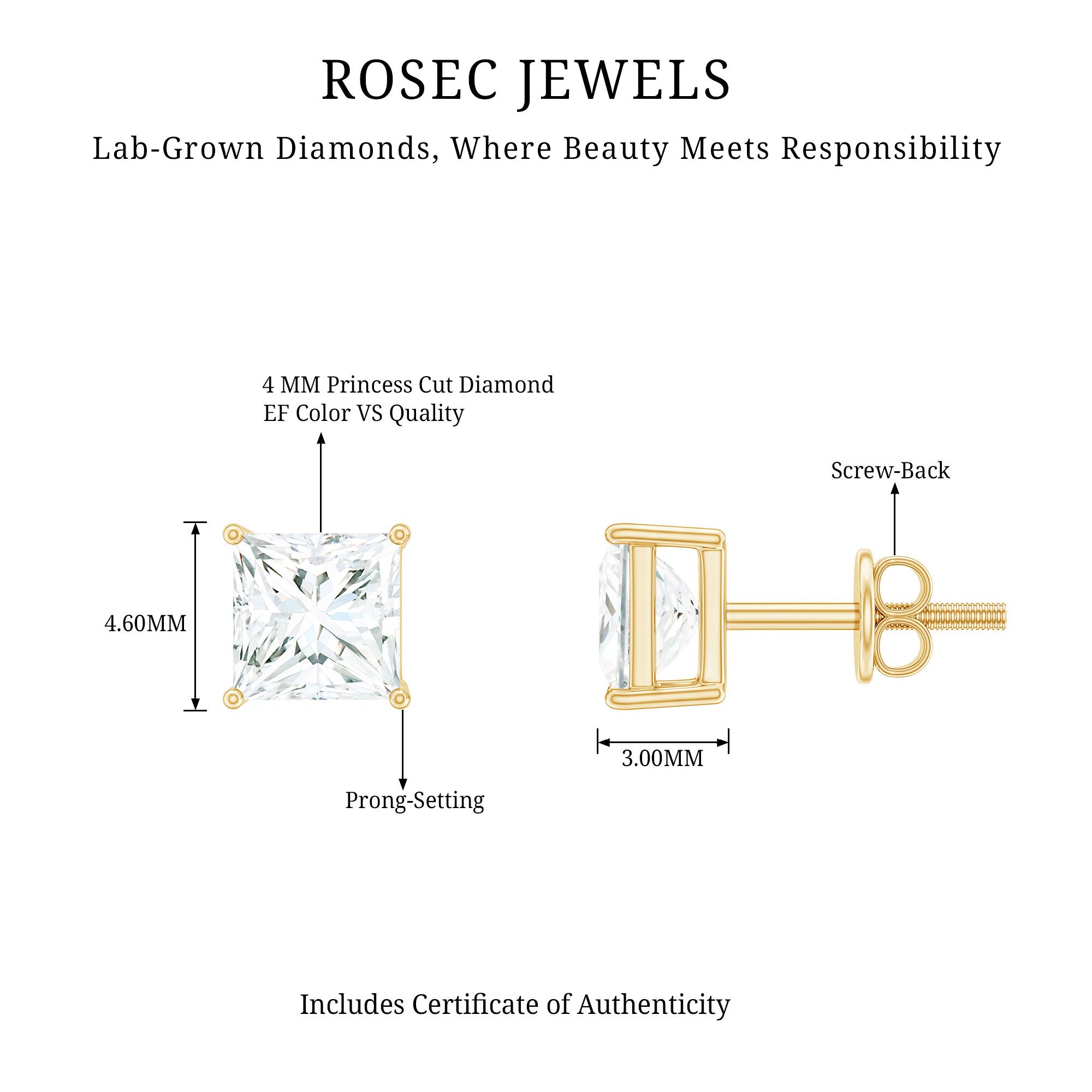 Nothing can make you feel as special as these Princess Cut Diamond Earrings. This beautiful pair of Solitaire Earrings exemplifies how modern cuts can elevate your everyday style. Meticulously crafted and featuring a thoughtful selection of EF-VS quality diamonds that bring the design to life, each earring displays outstanding craftsmanship and pleasing proportions. These Solitaire Studs are designed with 4 MM princess cut lab-created diamonds, selected for their unmatched beauty and brilliance. Each stone is securely set in a polished 4-prong setting, reflecting light beautifully with every movement. These Everyday Earrings come with screw back closures for comfort and safety. Sleek and contemporary, these Lab Grown Diamond Stud Earrings are always a popular choice for gifting to a loved one on their birthday or a special anniversary. The aesthetic appeal of these Square Diamond Earrings holds significance, adding a layer to the timeless accessories. As the epitome of luxury and refinement, these Studs make it a cherished piece for the jewelry collection.
