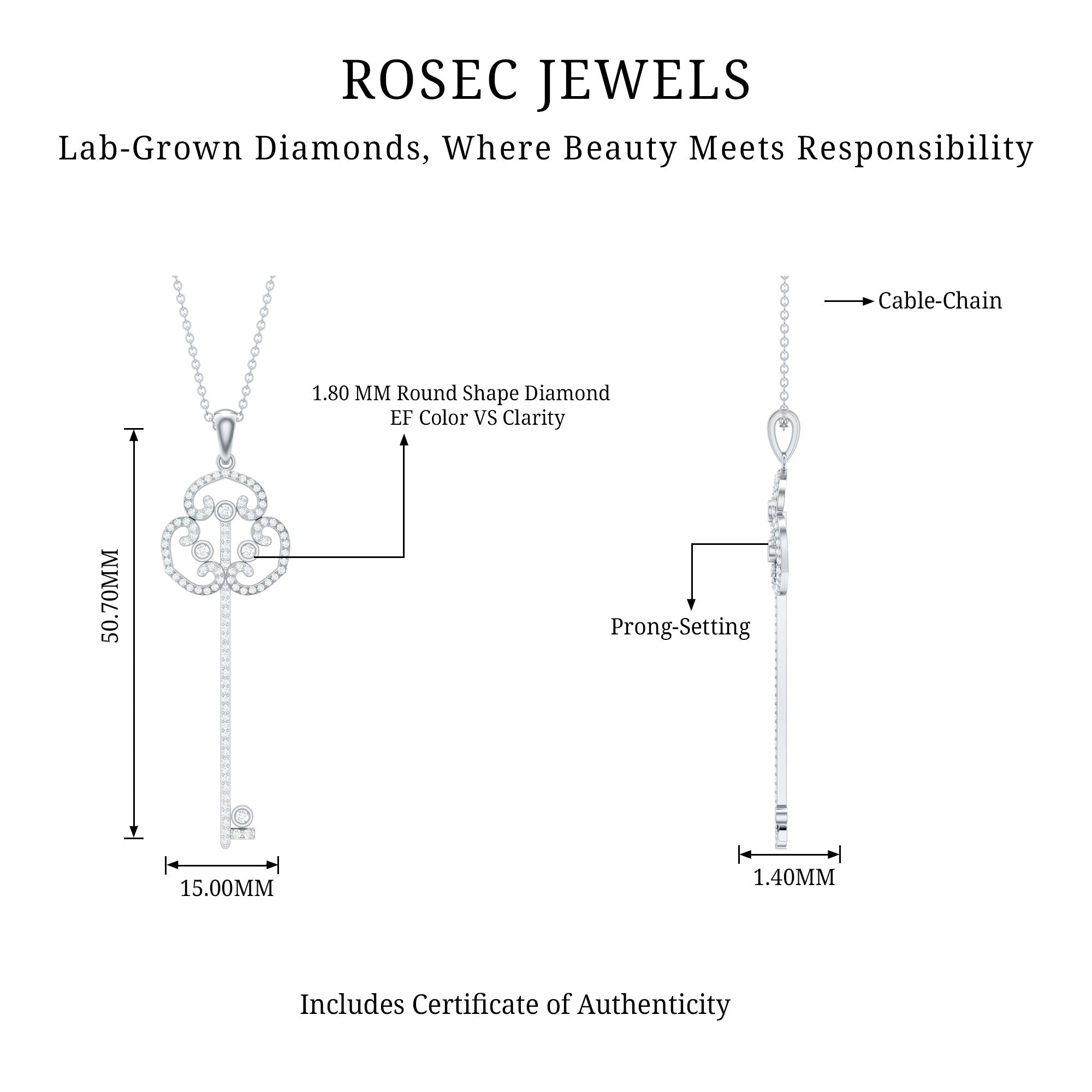 This captivating Key Necklace is a beautiful mix of sparkle, meaning, and timeless style. The pendant is shaped like a classic key and is adorned with Round Shape Lab Grown Diamond stones that shine with every movement. This Key Charm Necklace is the kind of piece that feels special the moment you put it on. The top of the key features a Vintage Inspired design that adds a soft, elegant touch. This Lab Grown Diamond Necklace is simple yet unique, perfect for adding a little charm to your everyday outfits or for making a subtle statement at special events. Made with Lab Grown Diamond stones of EF-VS Quality, this Lab Made Diamond Necklace offers the same brilliance as natural gemstones, but more sustainably and thoughtfully. Whether you are buying it as a gift or treating yourself, this Vintage Style Necklace is a lovely reminder of new beginnings and open doors. The necklace comes in a beautiful jewelry box, ready to give or enjoy. Delicate, meaningful, and easy to wear, this Diamond Key Pendant (Lab Created) is a little piece of elegance you will love having in your collection.
