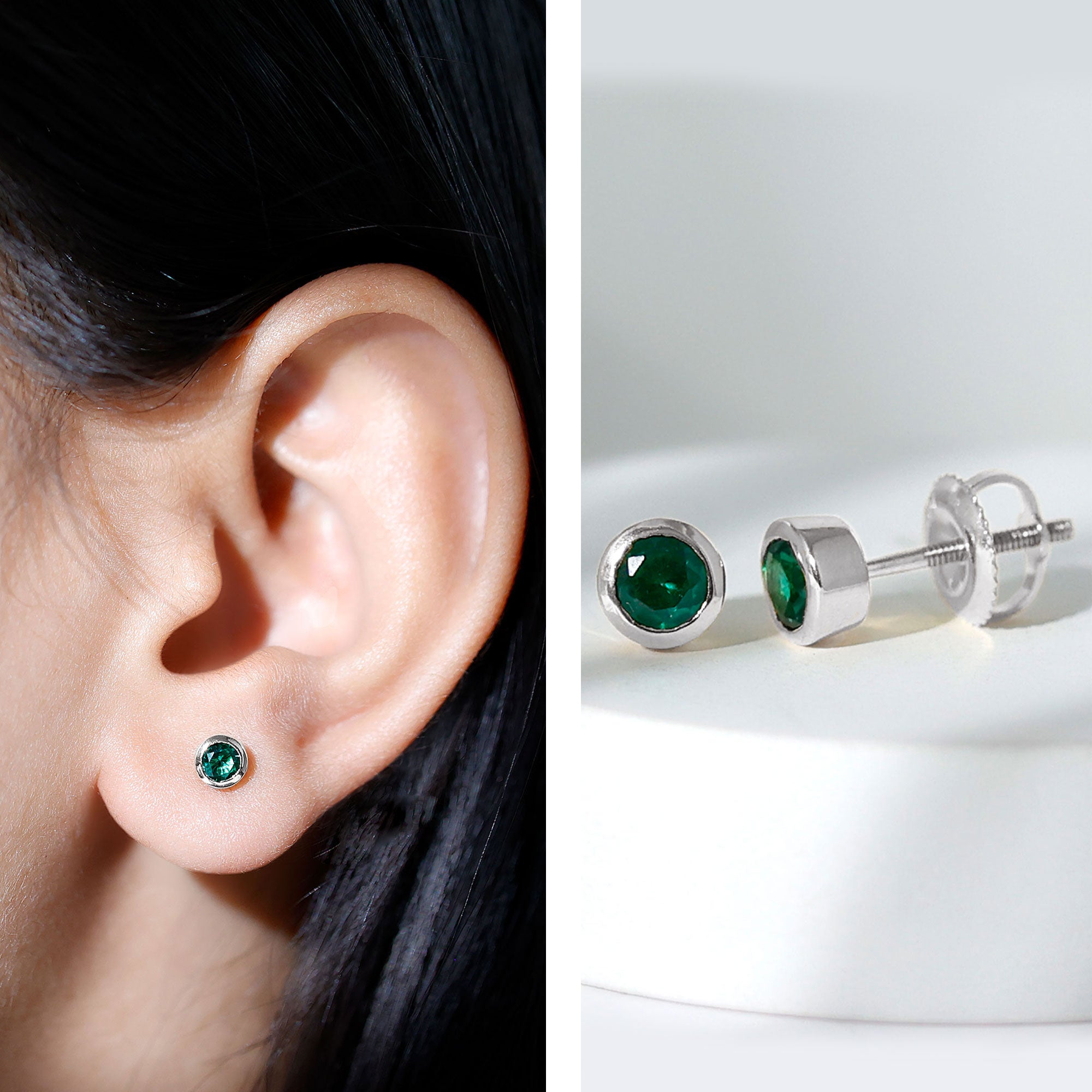 Everyday style feels more special when you have a pair of earrings that fit any moment with ease, and the Emerald Stud Earrings are crafted with that purpose. Each earring holds a 4 MM round lab created emerald, placed neatly in bezel setting. The setting also keeps the stone protected, making the studs perfect for regular wear without any worry. Their minimal design brings a soft elegance that suits simple outfits just as well as dressy ones. The Solitaire Stud Earrings feel light on the ears, and the screw back closures offer a firm fit so you can wear them comfortably all day. Made with AAAA quality lab created emeralds, the studs shine beautifully while staying durable and eco-friendly. If you enjoy dainty and simple designs, these Minimalist Emerald Earrings are sure to become a favorite. They carry a touch of charm, making them easy to pair with other jewelry or wear on their own. Presented in a lovely jewelry box, the Bezel Set Earrings make a sweet and thoughtful gift for someone close to your heart.
