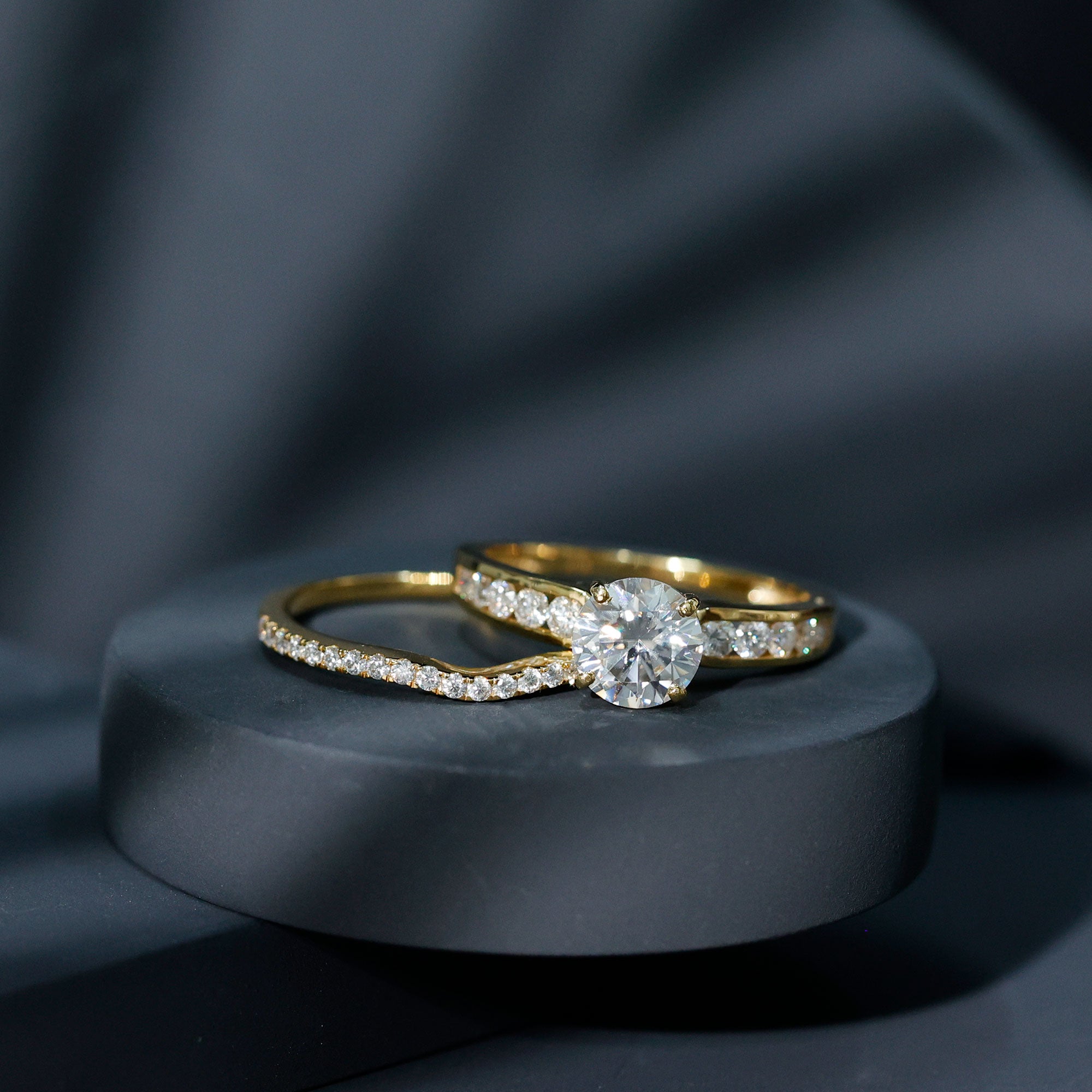 The unique and stunning Lab Grown Diamond Ring Set is designed to grab attention and make your day even more memorable. Celebrate your emotions with a symbol of joy, complemented by the elegant design of the Bridal Ring Set. This beautiful 2 Piece Ring Set includes an Engagement Ring and a Wedding band, ready to dazzle and create a breathtaking stack. The Engagement Ring features an 8 MM round cut lab grown diamond in 4 prong basket setting, enhanced by additional round gemstones as side stones in a graduated style, elevating the center stones beauty. The slightly curved Wedding Band studded with a row of lab diamonds, perfectly hugs the main ring and representing everlasting love. The EF Color VS Clarity Lab Grown Diamond offers a clean, bright look with exceptional visual appeal. This Wedding Engagement Ring set stands as a testament to unity in relationships, embodying sophistication and capturing every gaze. Its beauty combines simplicity and grace, symbolizing the crafting of a remarkable shared future.