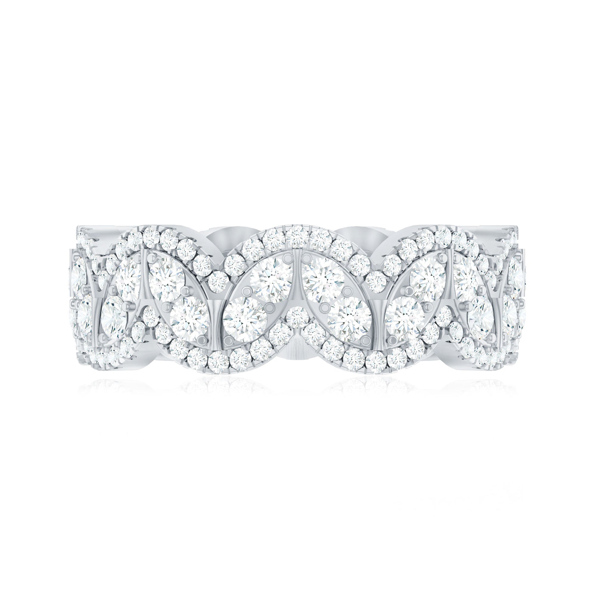 Step into the charm of a bygone era with this vintage inspired diamond eternity band, designed for those who adore old-school elegance with a modern touch. This Wide Band Ring features an elaborate pattern of round cut lab made diamonds, arranged in marquise shaped motifs. Surrounding these central motifs are smaller round cut diamonds, meticulously set along the edges, enhancing the overall brilliance of the piece. Designed for both comfort and durability, this Vintage Style Wedding Ring is not only a statement piece for your D-day but also a timeless treasure you can wear daily.