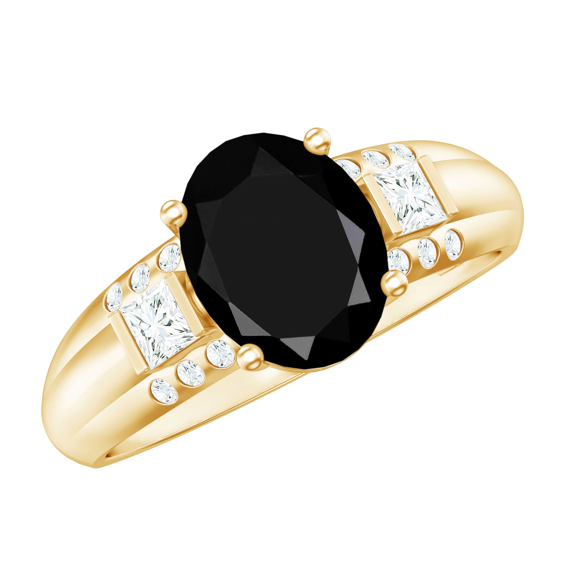 This Solitaire Ring is a delightful accessory crafted with Solid Metal and embellished with Oval Cut Lab Grown Black Diamond secured by Prong Setting while Princess and Round Diamonds studded on the shank. Wear our Lab Grown Black Diamond Ring on any special occasion to stand out from the crowd. Present this ring to your wife and make her feel special on your 1st anniversary.