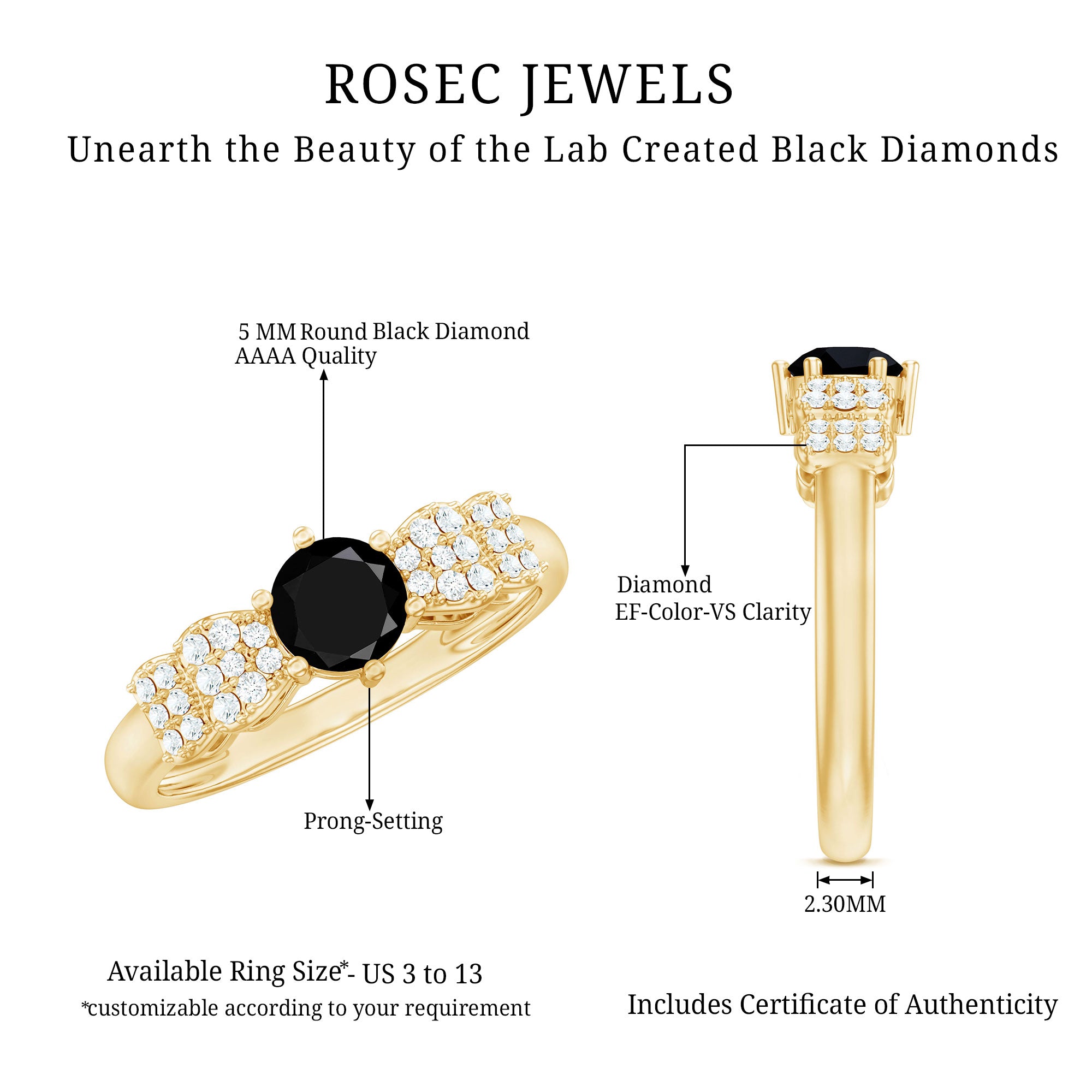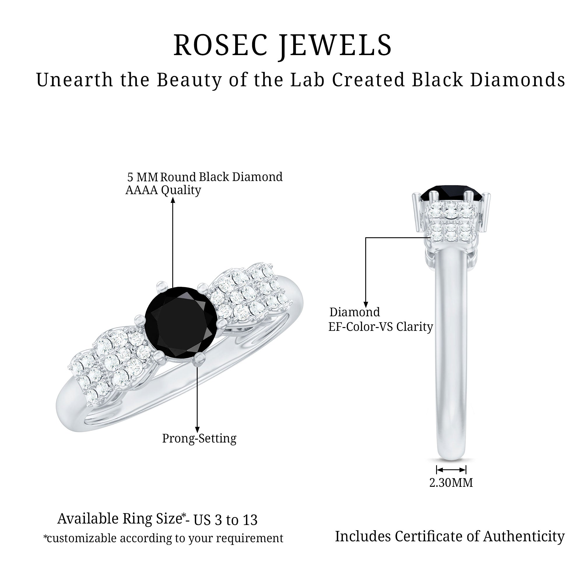 Radiate elegance with this Minimal Promise Ring, this exquisite piece seamlessly blends sophistication and simplicity. The 5 mm Round Shaped Black Diamond, takes center stage, exuding timeless allure. Delicate Diamond gemstones (Synthetic) enhance the charm of this Unnatural Black and White Diamond Ring, creating a symbol of enduring commitment. Aaaa Quality Black Diamond and Ef-Vs Quality Diamonds synonymous with ethical luxury, ensures every detail is perfected for a stunning adornment.