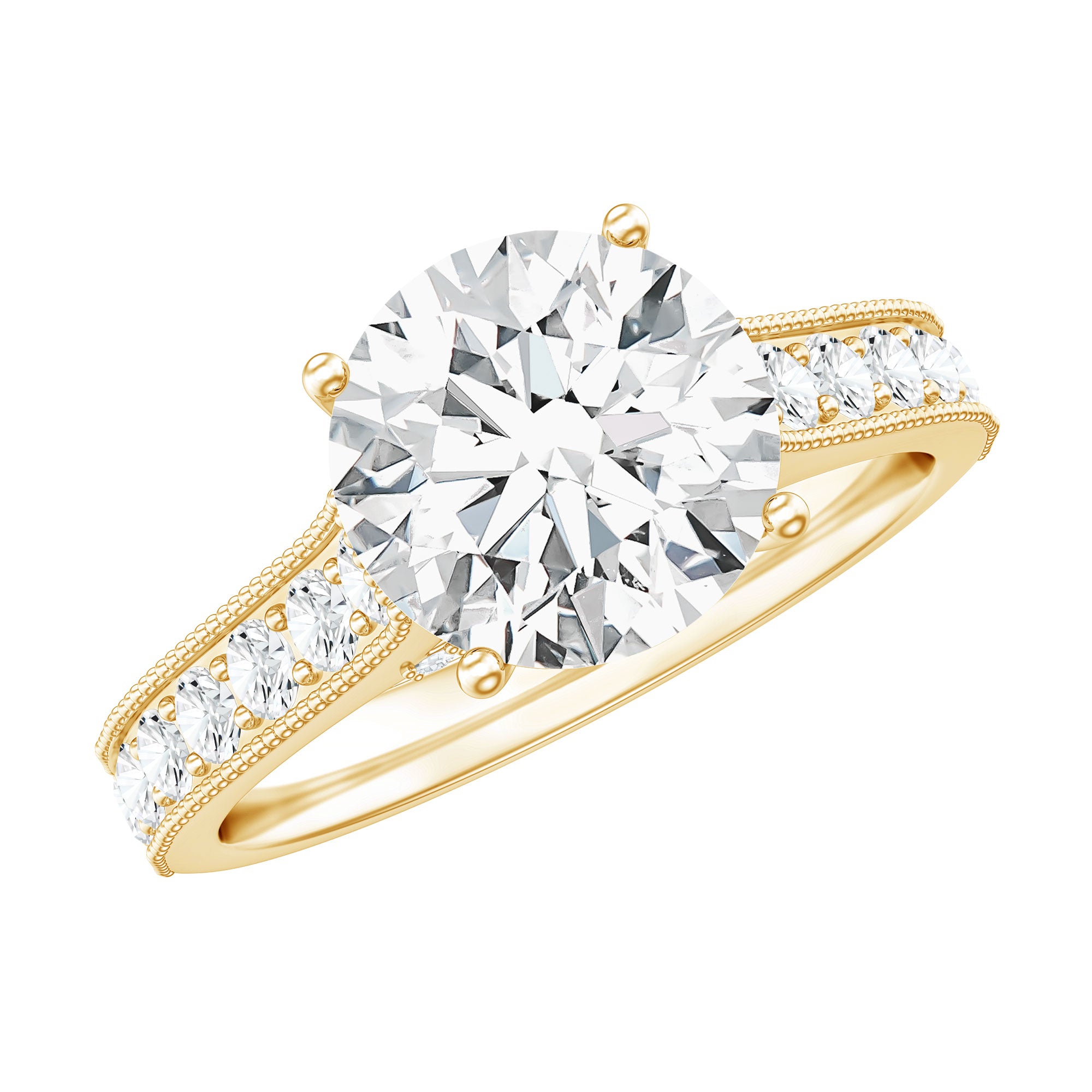 The Diamond Solitaire Ring is a cherished piece of jewelry that will enhance your style and make you truly appreciate it. The iconic Timeless Engagement Ring serves as a signature element with its elegant design, ensuring you to stand out. This High Profile Engagement Ring features an 8 MM round lab-grown diamond, securely held in prong setting as the Solitaire gemstone. The band captures attention beautifully, adorned with small stones and bordered with beaded detailing, making it a breathtaking choice for any bride-to-be. The luxurious aspects of this ring include the solitaire gemstone, complemented by petite peek-a-boo diamonds set under the main stone. This gemstone has been tested in lab and comes with authenticity certification. The round ring is available in US sizes ranging from 3 to 13 and arrives in a signature jewelry box that ensures safe and secure storage. With a variety of options in metal colors and types, this Lab Created Engagement Ring is ideal for celebrating special occasions, whether it's a birthday, anniversary, wedding, engagement, or any other memorable moment.