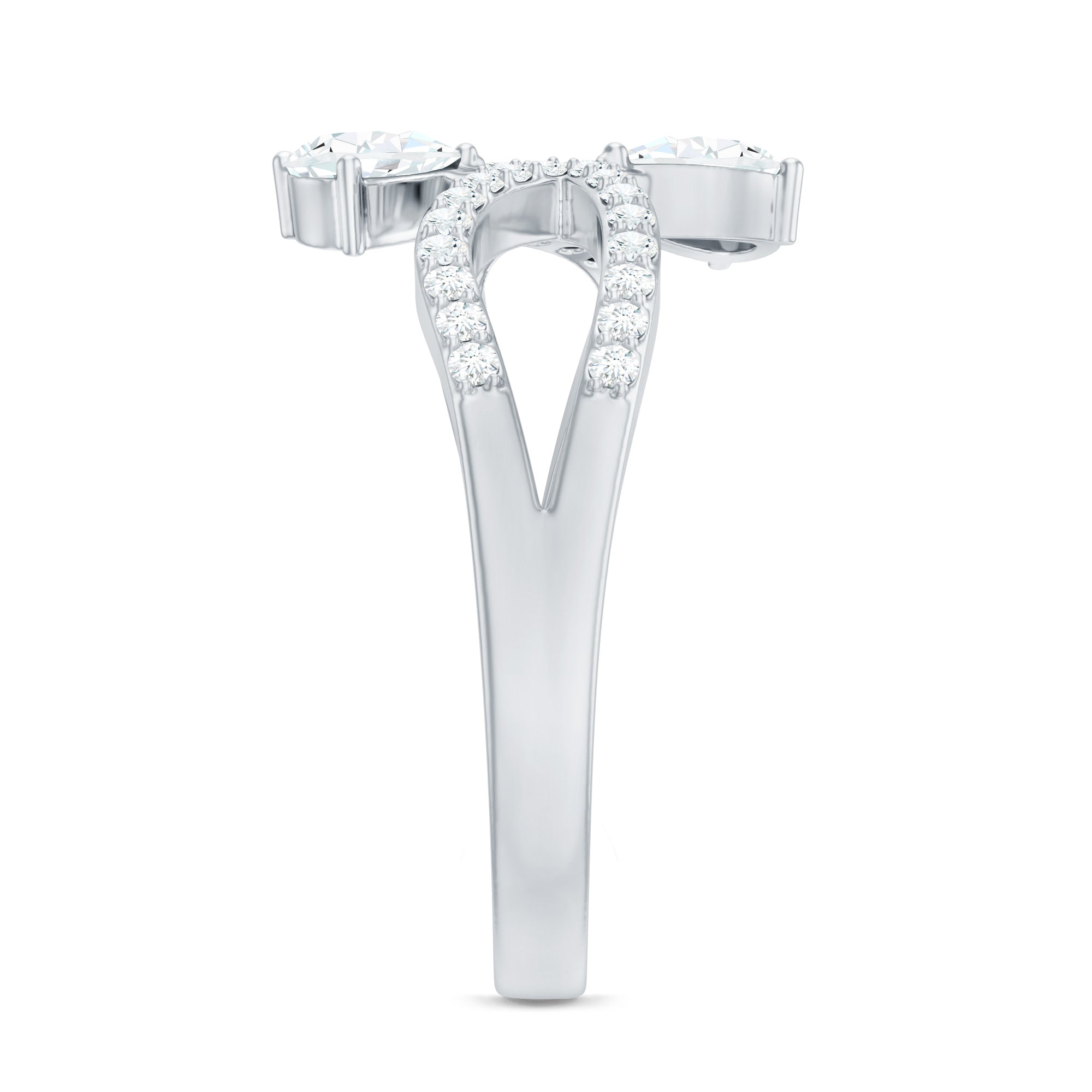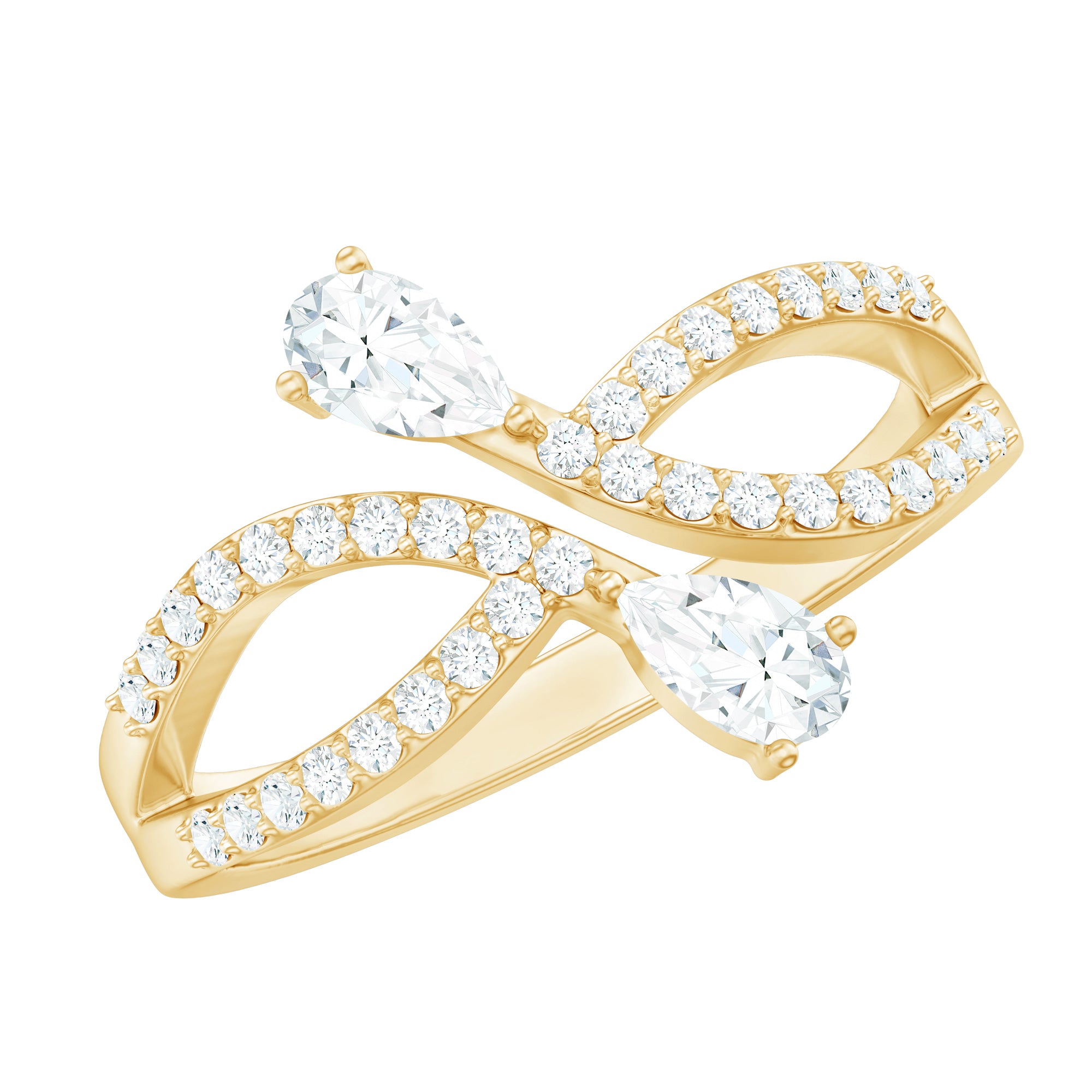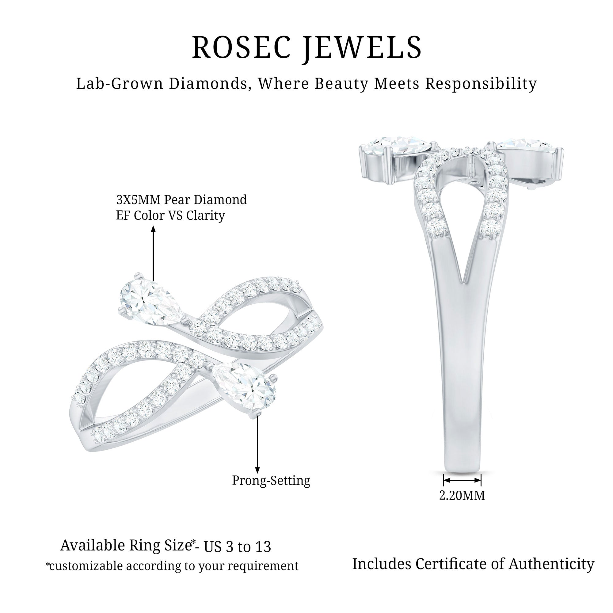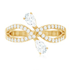 Designed by Rosec Jewels, this Lab Grown Diamond Ring has a toi et moi pattern with a meaningful infinity shank. Embark on a journey of love with this 2 Stone Promise Ring, a captivating symbol of a shared past and promising future. This exquisite design features an open structure with two ends adorned with pear shaped diamonds in prong setting. Adorning the infinity shank are the brilliant round cut diamonds, that embrace its beauty. Every curve, every stone, and every detail in this Diamond Promise Ring is a testament to fine craftsmanship, representing two souls with eternity symbolism in a way that feels both timeless and mesmerizing.