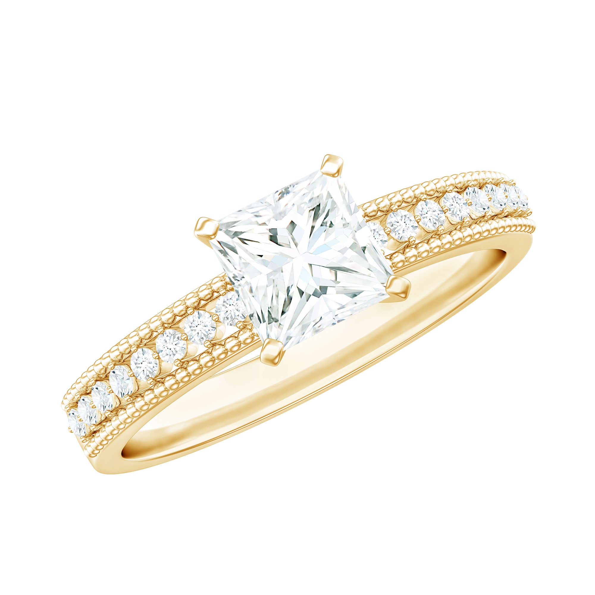 Beautiful in its simplicity, this classic Solitaire Engagement Ring features a 5 MM princess cut lab grown diamond set in a safe prong setting. The shank is adorned with round cut diamonds and bordered with beadwork, giving this Princess Cut Ring an eye catching appeal. Handcrafted properly, this 1 carat Diamond Ring is a meaningful accessory as it can also serve as an affordable April Birthstone Ring. It comes with a certificate of authenticity, ensuring its superior quality. If you are looking for a Diamond Solitaire Ring thats timeless and speaks volumes about your love, this is the one.