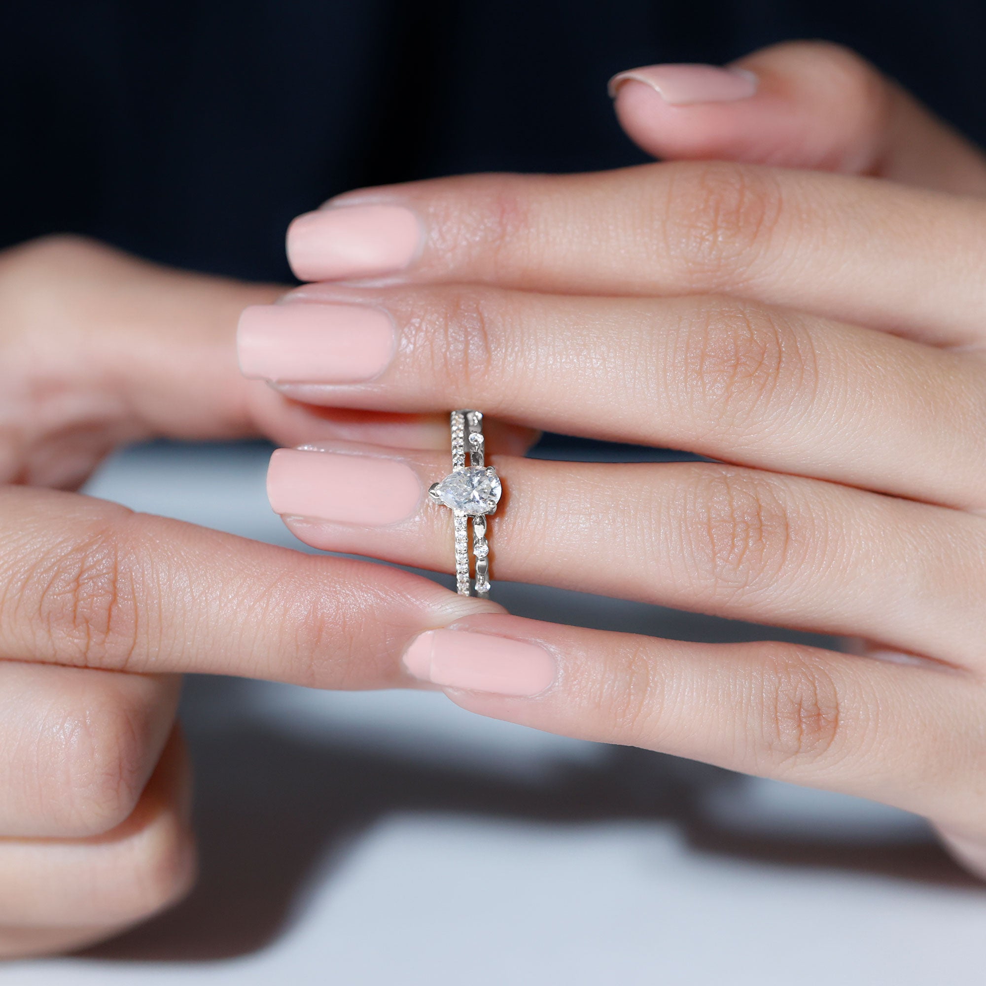 This Teardrop Engagement Ring features a classic design, making it the perfect Alternative Engagement Ring for brides who appreciate ethically crafted jewelry. The total gemstone weight of this Diamond Solitaire Ring is approximately 1 carat. It features a 5X7 MM pear cut lab grown diamond set in the center over two bands, set side by side creating a look of unity and strength, and adorned with dainty stones and marquise shape motifs. A secure 3 prong setting held the center EF-VS quality diamond, allowing light to enter from all directions for maximum brilliance. Utterly enchanting this Double Band Diamond Ring has a graceful radiance with an undeniable charm which is perfect to celebrate your one-of-a-kind love.