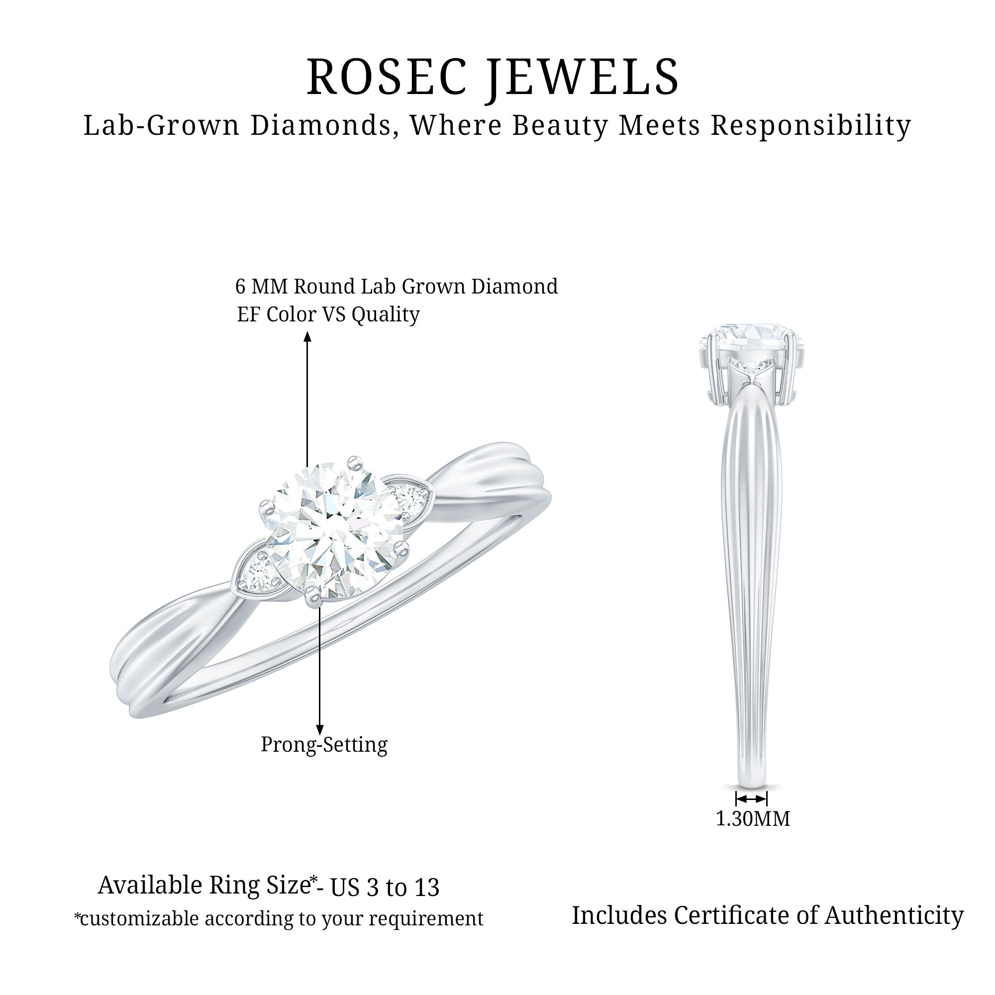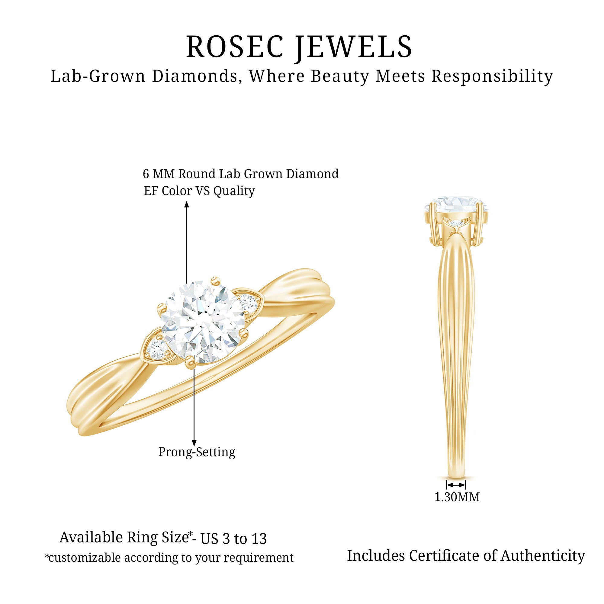 Our breathtaking 1 carat Diamond Ring is the ultimate expression of love and commitment, designed to make her heart skip a beat. The 6 MM round cut diamond (lab grown) is securely set in a safe prong setting. This Solitaire Engagement Ring has a pinched shank, where the band gracefully narrows as it approaches the center stone, drawing all attention to the dazzling EF-VS quality diamond. On either side of the solitaire round diamonds are nestled, adding more sparkle to the design. As she wears this beautiful Round Engagement Ring, it will capture a cherished memory and mark the beginning of your journey together. Let this be the ring that tells her shes your forever.