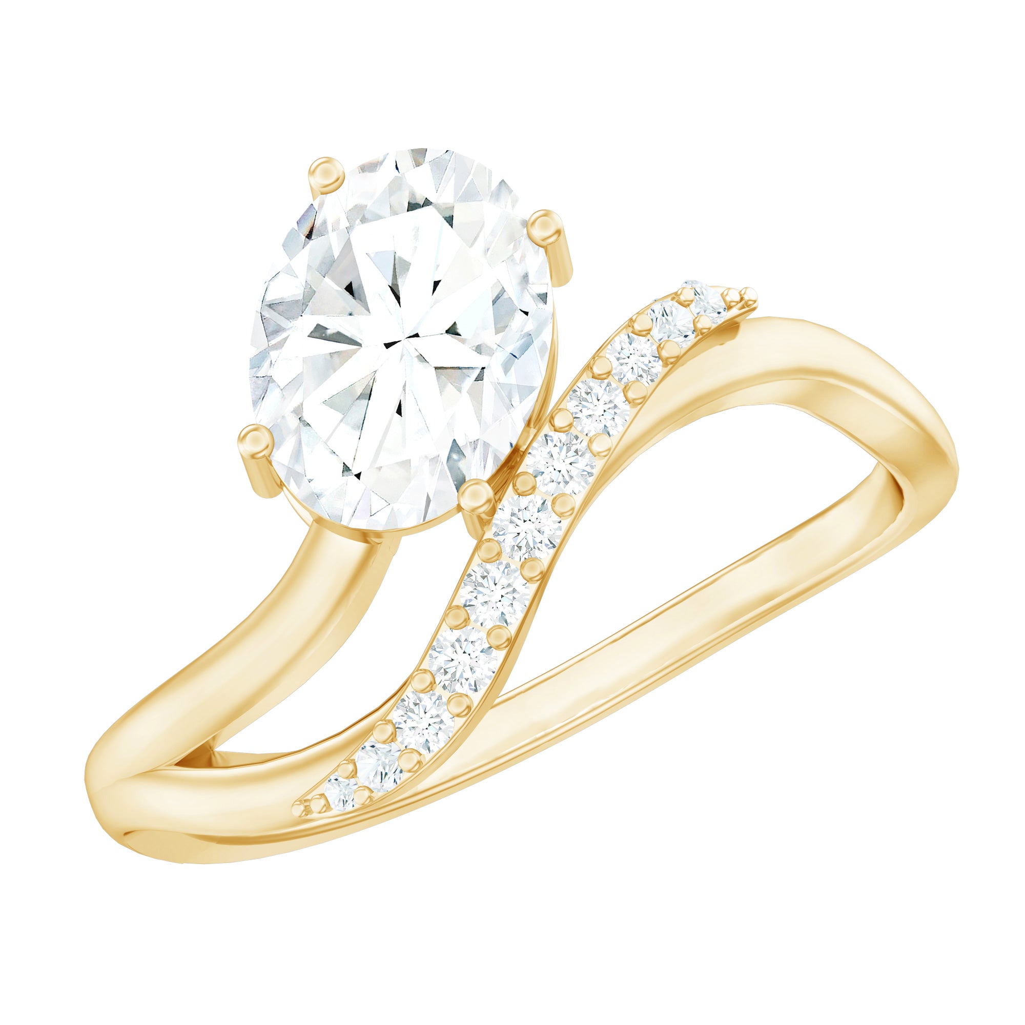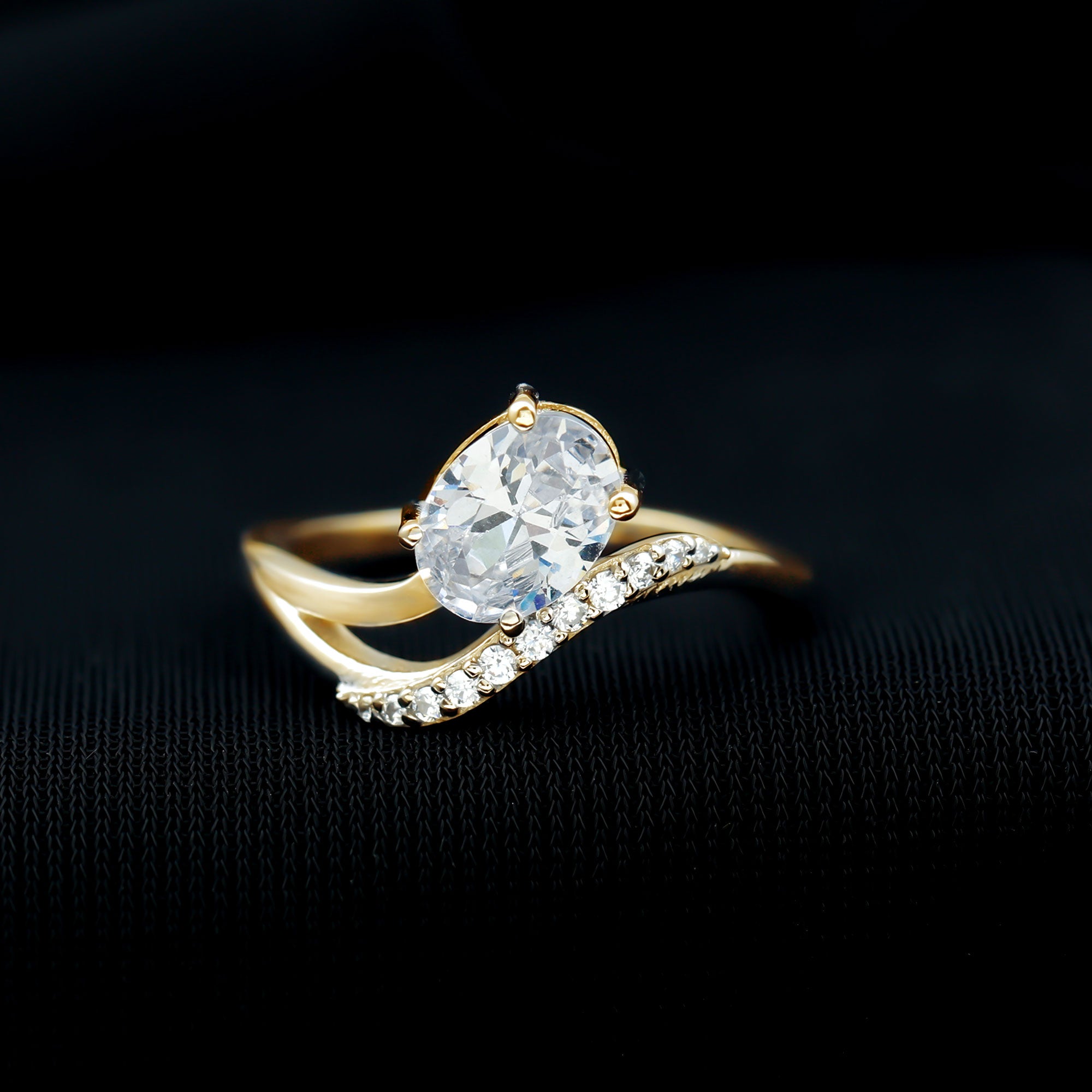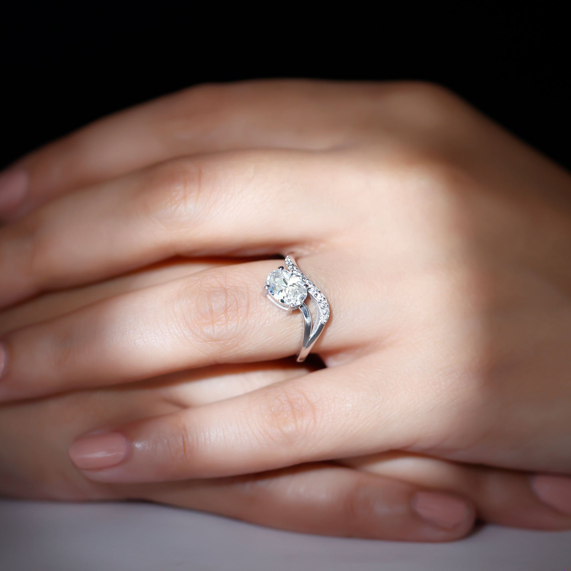 Give your lady love this Oval Diamond Engagement Ring on a special day, it is as unique as your love for her. The breathtaking 6X8 MM oval shaped diamond of EF-VS quality is set elegantly in an East-West style in prong setting. The gracefully curved band is adorned with a delicate row of shimmering round cut diamonds, adding a romantic touch and symbolizing the beautiful journey of love. Designed for a woman who loves contemporary elegance, this Diamond Solitaire Ring is perfect for making her feel special every day. Whether she adores minimalist beauty or bold fashion statement, this Curved Engagement Ring will complement her style effortlessly. Also, our Single Stone Ring comes in the appropriate packaging ensuring it is ready for presenting upon arrival.