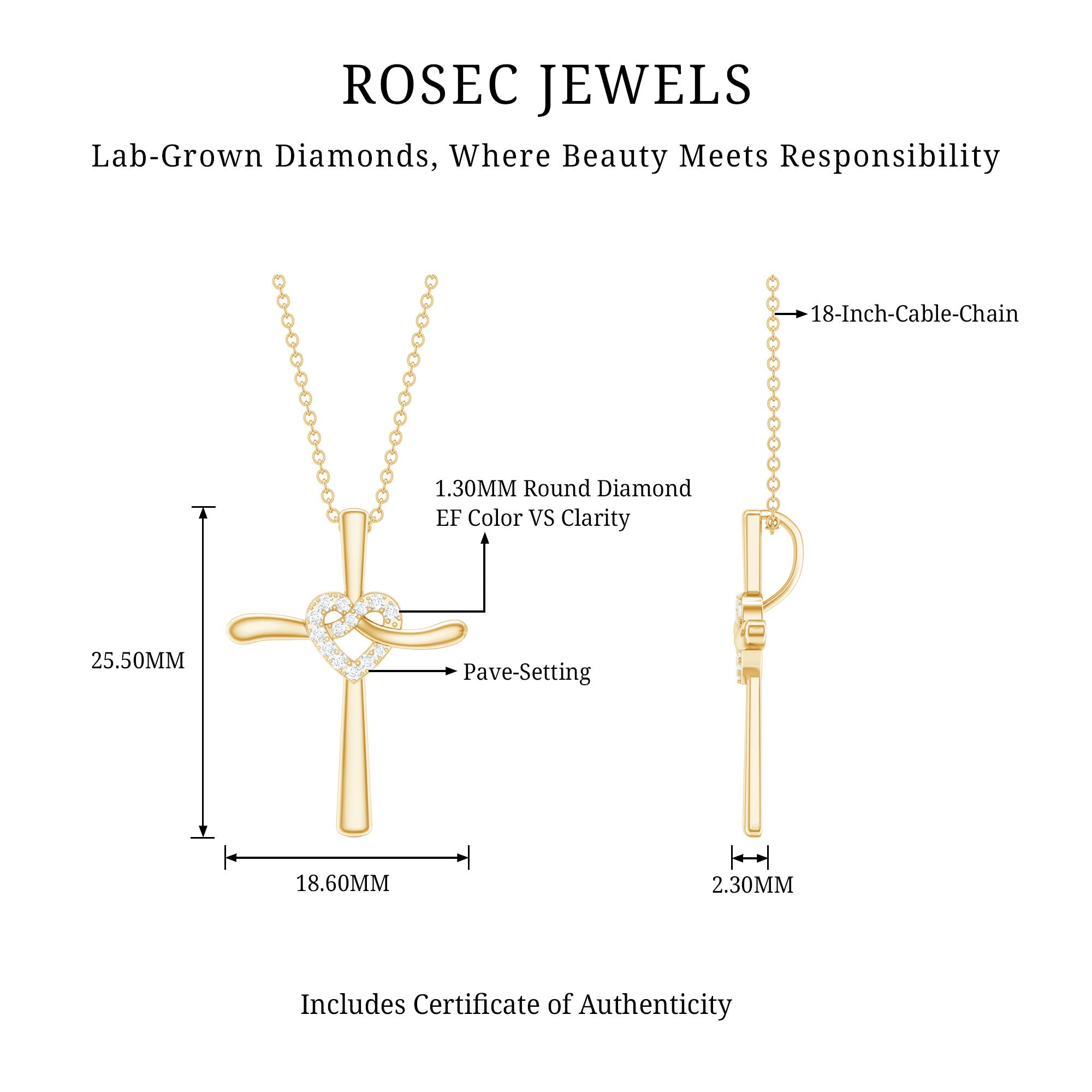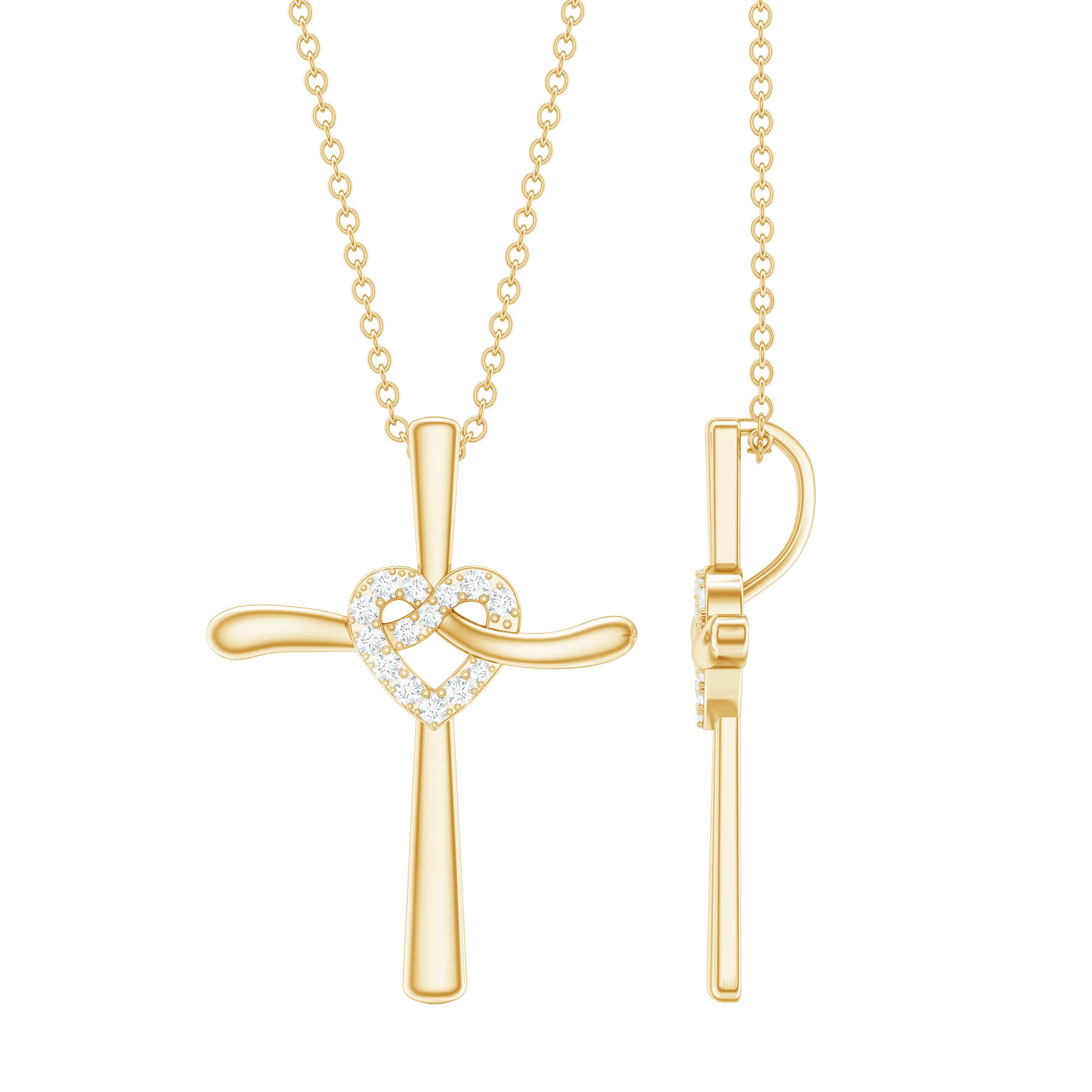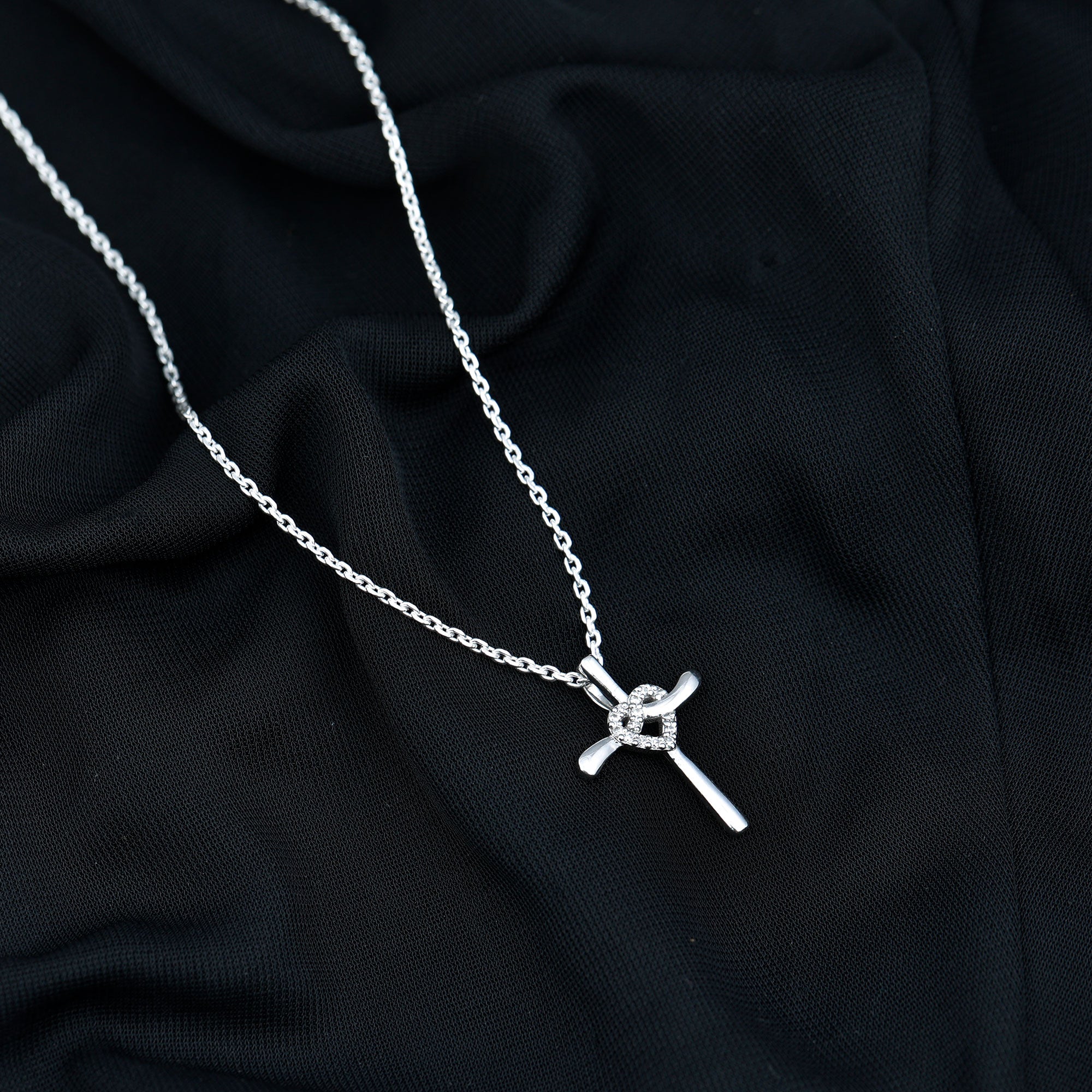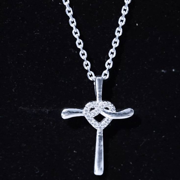 This gorgeous Cross Pendant is more than just a piece of jewelry, it is a powerful symbol of love and faith. This Diamond Cross Necklace features a gracefully flowing ribbon-like structure with an intertwined heart shape knot adorned with sparkling lab made diamonds of EF-VS quality. A hidden bail allows the Meaningful Necklace to look like it is floating effortlessly. Whether you wear it solo or stack it with a pendant, this definitely turns every head. You can present this as a gift for christmas, birthday gift, an anniversary gift, or a romantic surprise, this Cross Heart Necklace beautifully marks lifes most cherished moments. The lab made diamonds ensure affordability while being eco-friendly, offering the same brilliance and durability as natural stones. Also, our jewelry comes with a certificate of authenticity.