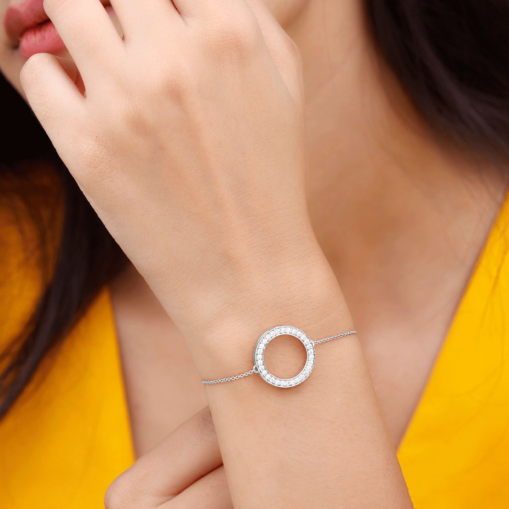Enhance your style with the timeless yet contemporary design of this Open Circle Bracelet designed for women. Crafted from high-quality metal, it showcases a central open circle embellished with delicate round lab-created diamonds set in a pinpoint setting. Our Diamond Chain Bracelet perfectly combines elegance, fashion, sustainability, and affordability, as it is handcrafted from lab-created diamonds of EF-VS quality. The beautiful circle is elegantly displayed on a metallic chain, providing a refined appearance. Fastened with a lobster-claw clasp, this Stacking Diamond Bracelet guarantees both comfort and durability, making it an essential accessory for any event. Whether you are dressing up for a special night or simply want to add a hint of sparkle to your daily outfit, this lab-grown diamond bracelet effortlessly enhances your look.
