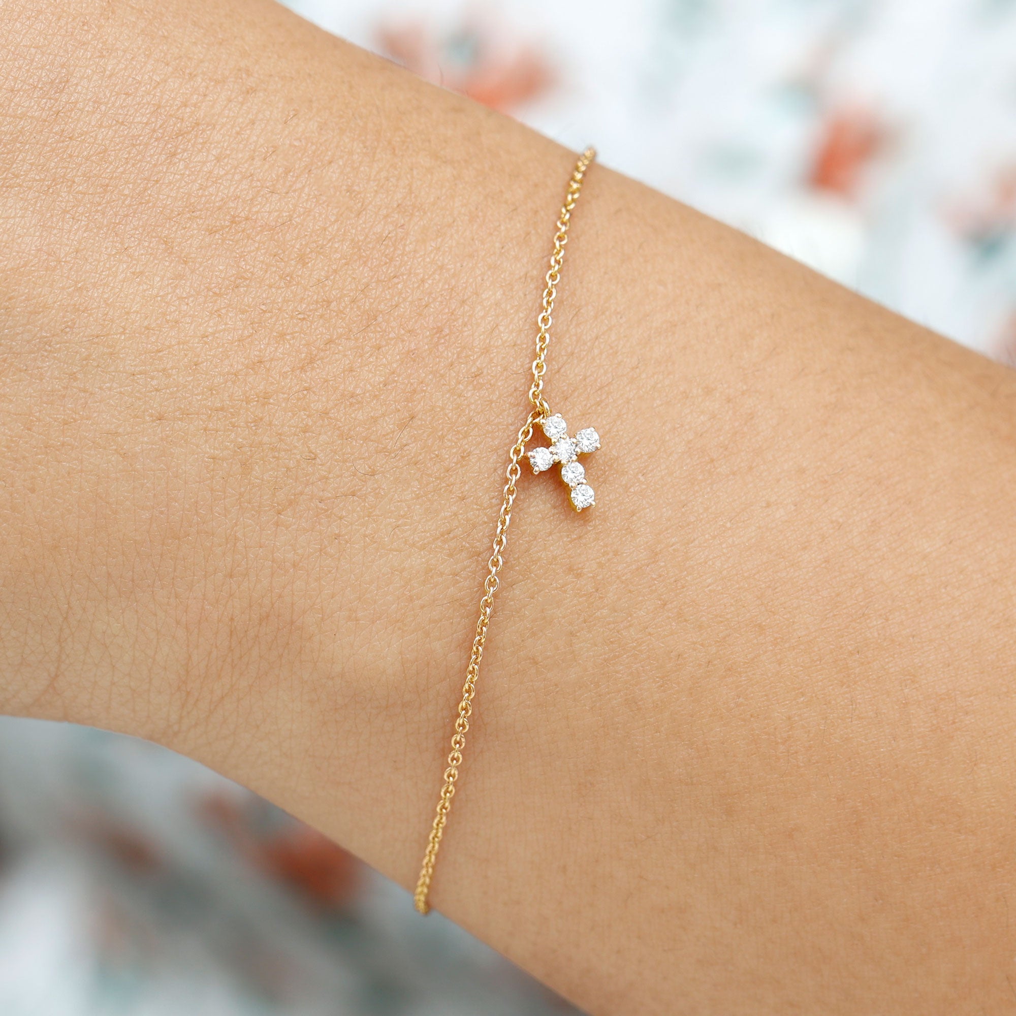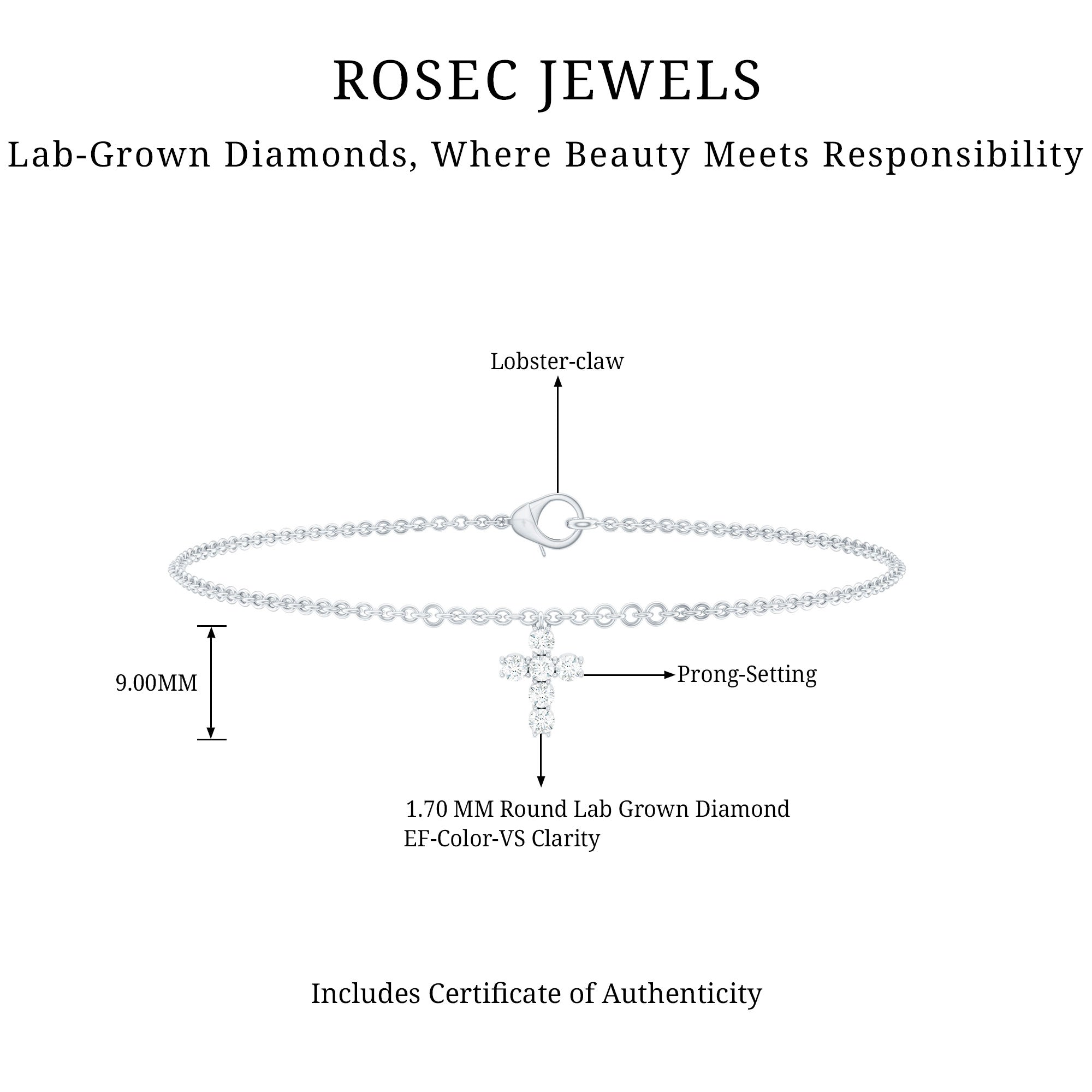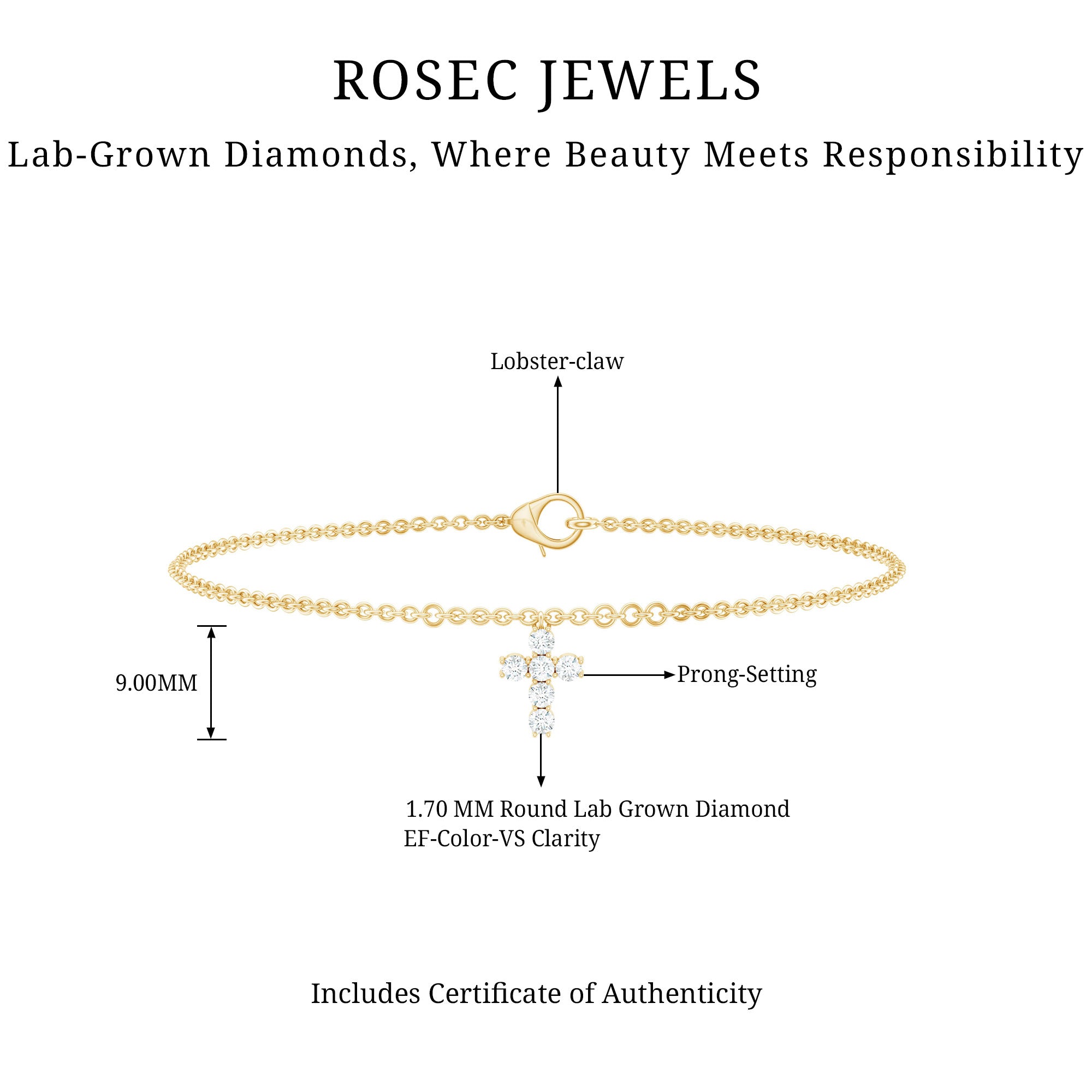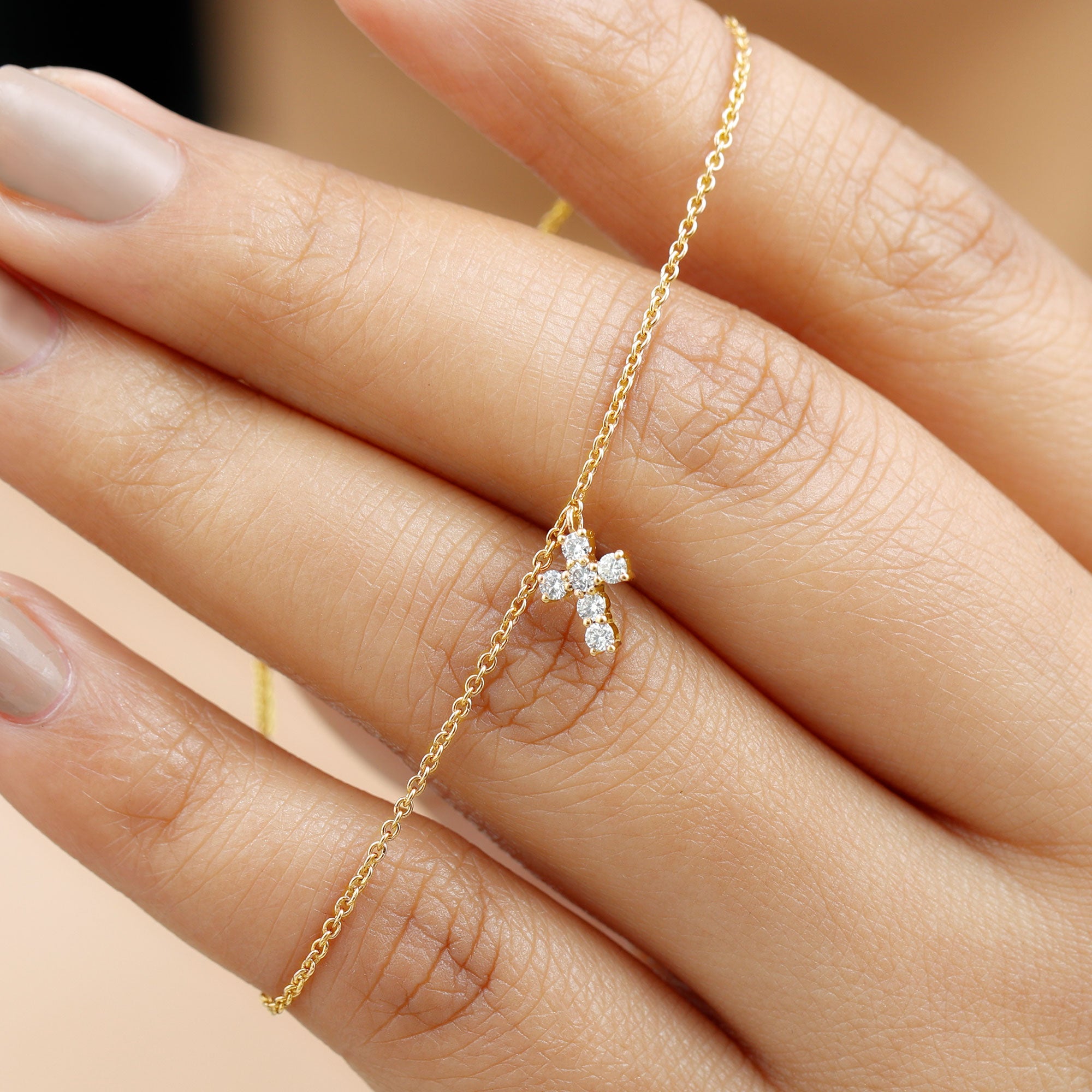 This Diamond Cross Bracelet represents spirituality, faith, and a divine connection. Its understated design goes beyond trends and seasons, showcasing timeless elegance. Featuring round cut lab-grown diamonds set in a cross design, this bracelet merges spiritual meaning with a simple style, making it a meaningful accessory that radiates understated elegance. Symbolizing hope, faith, and everlasting love, this Catholic Cross Bracelet has a unique charm and appeal. The cross motif hangs from a secure cable chain, attached with a lobster clasp for a perfect fit. Shine with sophistication and elevate your look with this signature style. With its charm and allure, this Cross Charm Bracelet perfectly blends prominence and elegance. The EF color VS clarity lab-made diamonds make a striking statement with their beauty and brilliance, turning heads with their style.