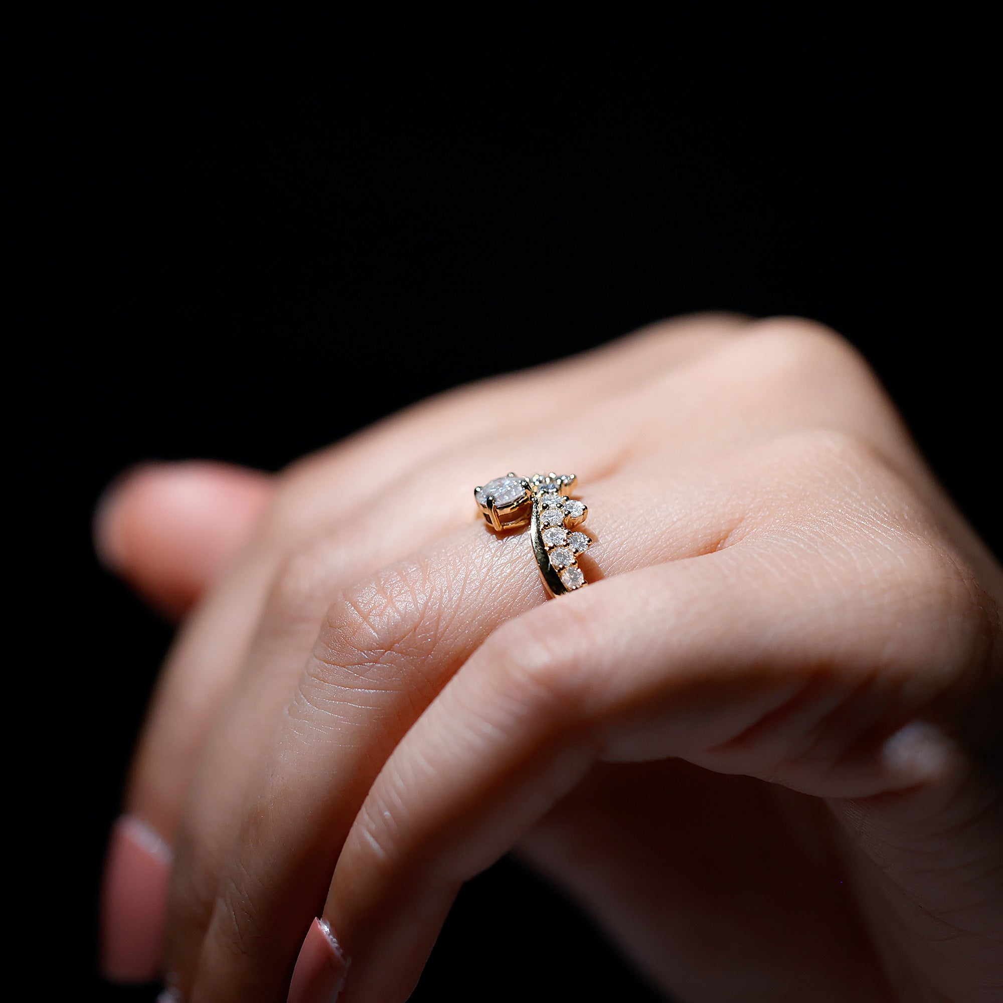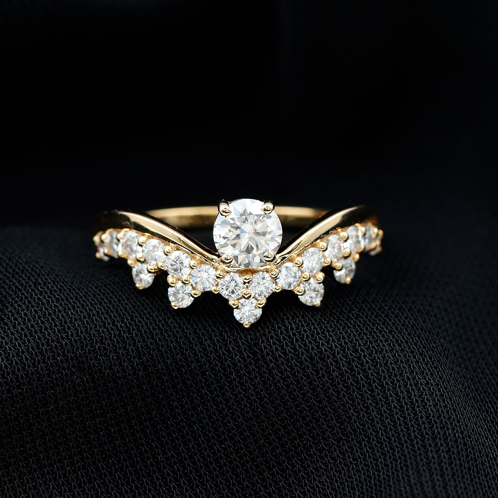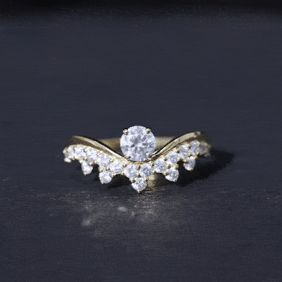 Designed by Rosec Jewels, this Unique Engagement Ring features a perfect arc of diamonds, symbolizing how true love beautifully bends but never breaks. It has a sophisticated and elegant design with a 5 mm round cut lab grown diamond of EF-VS quality set in the center in a secure prong setting. The band gracefully curves into a V-shape, decorated with dainty diamond stones. This Designer Diamond Engagement Ring perfectly balances modern minimalism with classic charm, making it an ideal choice for those who seek a unique yet timeless piece. Whether worn as a standalone statement or paired with other bands this Curved Ring embodies love, grace, and brilliance.