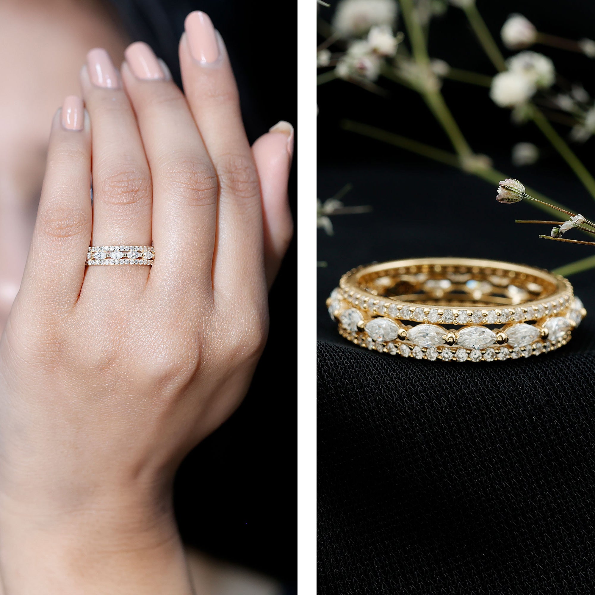 Illuminate your days with this exquisite Lab Created Diamond Eternity Band, an ideal way to honor love, milestones, and cherished memories. This gorgeous Eternity Wedding Ring showcases three rows of marquise and round shape lab grown diamond stones securely held by prong setting and glimmer with every movement. This Wedding Band for Women represents eternity, embodying something significant, stylish, and durable. The Lab Diamond stones are meticulously set around the band, providing a complete circle of brilliance that looks stunning from every perspective. Whether you are commemorating a wedding anniversary, a special event, or simply treating yourself to something extraordinary, this Diamond Anniversary Band adds the perfect hint of elegance to your look. Comfortable enough for everyday wear yet sophisticated for special occasions, this Diamond Band is a piece you will never want to remove. Delivered in a lovely jewelry box, it is ready to bring joy to someone special. This Designer Band Ring serves as a reminder of your journey and that every moment in life deserves to be celebrated. Allow your hands to shine with happiness, style, and a touch of enchantment.