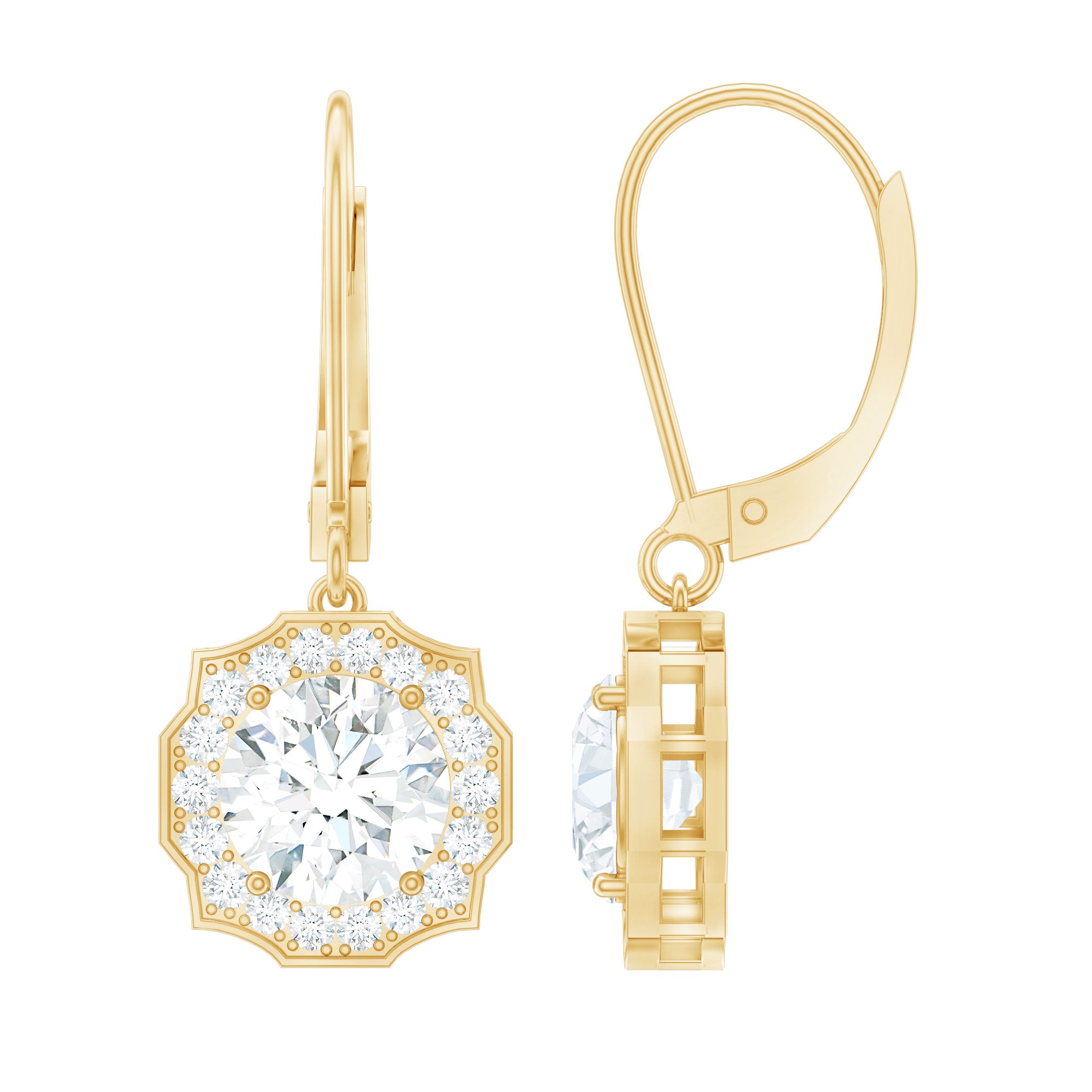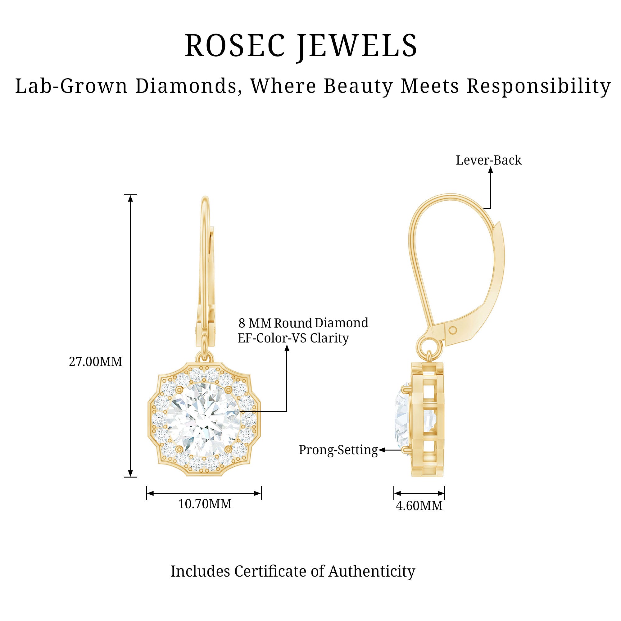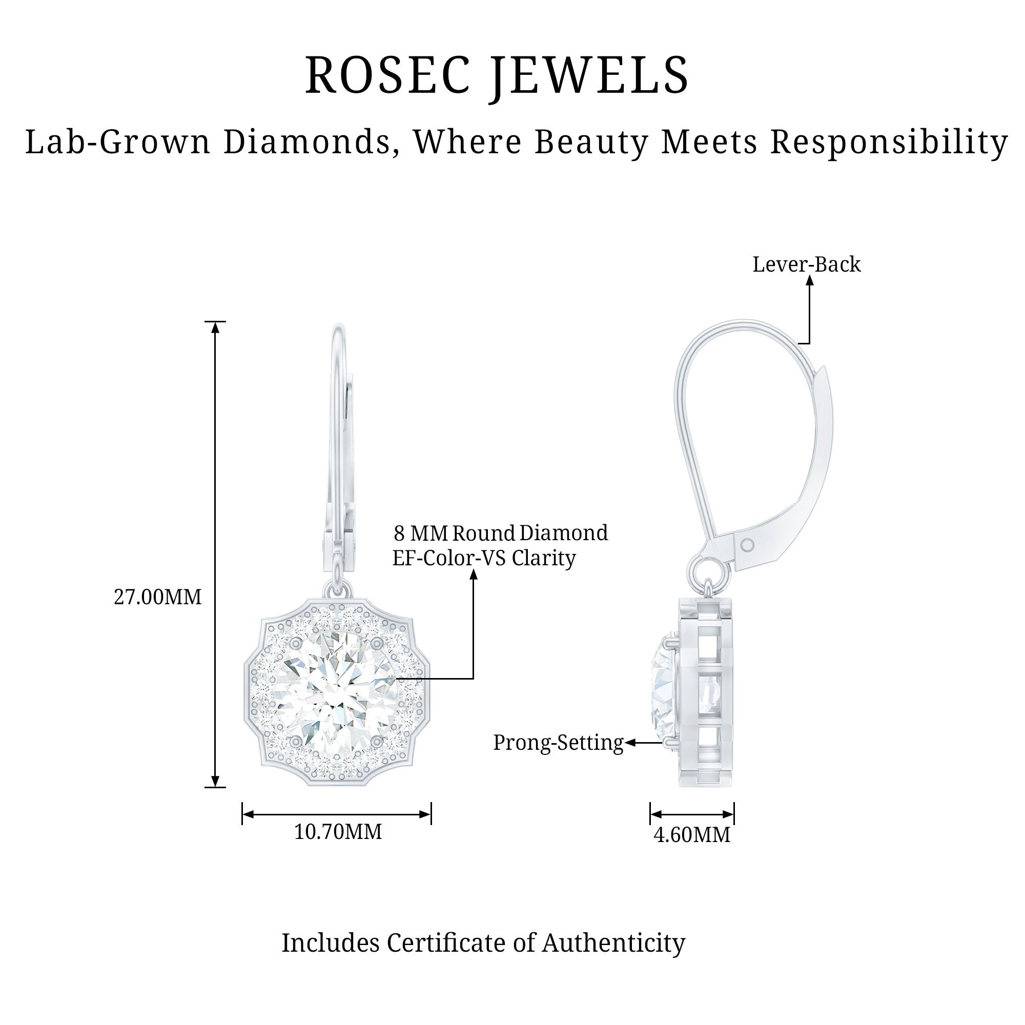 Make her eyes sparkle as brightly as these Diamond Halo Earrings. We designed these Dangle Drop Earrings to capture timeless elegance and charm, featuring an 8 MM round cut diamond (lab grown) in the center, set in prong setting. The center stone is surrounded by an art deco-inspired diamond halo and crafted with fine attention to detail, giving these Drop Diamond Earrings a graceful and feminine touch. These Art Deco Earrings are curated with lever back closure, ensuring both comfort and security, ideal for all-day wear. To guarantee premium craftsmanship, these affordable April Birthstone Earrings come with a certificate of authenticity.
